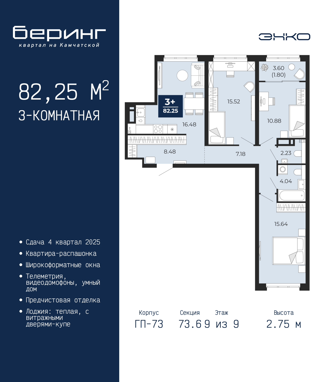 3-комн. квартира от застройщика с предчистовой отделкой в ЖК "Беринг" на 9 этаже. Общая площадь: 82.25 кв.м., жилая: 42.04 кв.м., площадь просторной кухни-столовой: 16.48 кв.м. Квартира - распашонка, без проходных комнат, окна выходят на paзные стороны дома. В квартире одна лоджия, один совмещенный и один раздельный санузел. Высота потолков 2.75 м. Дом монолитный, многоподъездный, переменной этажности, от 9 до 22 этажей. Квартира находится в 73.6-й секции высотой 9 этажей в корпусе ГП-73. На этаже 5 квартир. В подъезде 1 пассажирский и 1 грузовой лифт. Окончание строительства - 4 квартал 2025 года. Оформление сделки по договору долевого участия. Подобно знаменитому исследователю, мы чувствуем себя первооткрывателями этой локации. Хотим показать новую суть места, сформировать для вас жизненный опыт, которого ещё не было. Беринг — район зелёного цвета. Беринг — район, который откроется вам с другой стороны. Впечатлит новым уровнем комфорта и качеством жизни. Беринг — открытие на карте города. Первый квартал расположен в районе Тура, в границах улиц: Камчатская – Западносибирская – Энтузиастов. Вокруг уже есть всё для того, чтобы ежедневная рутина была лишь частью жизни и не доставляла дискомфорта. Школы и детские сады, магазины и аптеки, поликлиника, места для семейного отдыха, пеших и велопрогулок, и даже рыбалки. Масштабное озеленение дворов — визитная карточка ЭНКО и ваш оазис спокойствия, чтобы отвлечься от повседневности. Раскидистые деревья, кустарники, травы и цветы — осталось остановиться, вдохнуть и расслабиться, глядя на эту природную красоту. Стилистика подъездов продолжает концепцию Беринга, вдохновлённого Камчаткой: сдержанный, но при этом впечатляющий дизайн соседствует с удобством и функциональностью. (AQID02316317)