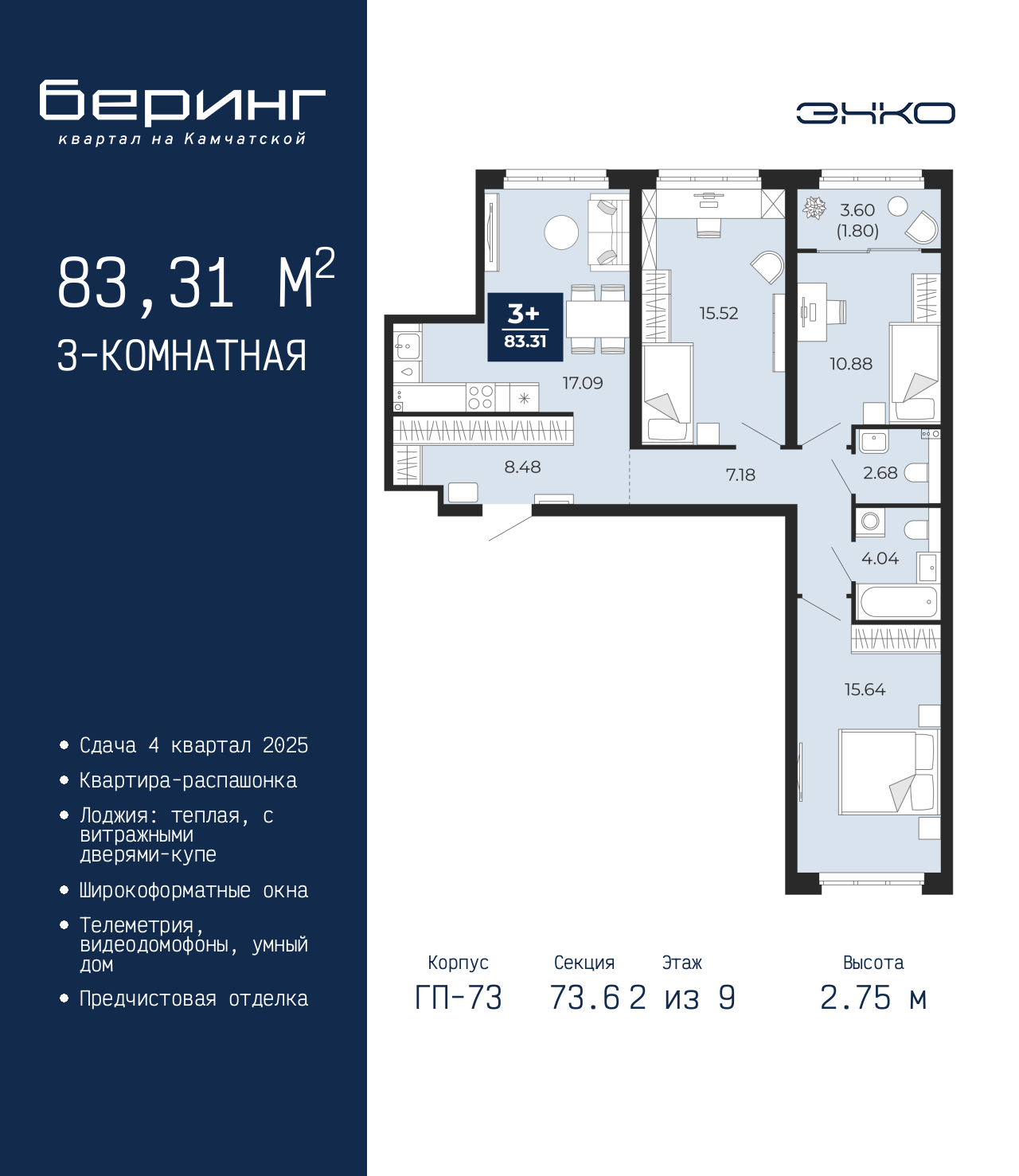 Трехкомнатная квартира с предчистовой отделкой в ЖК "Беринг" на 2 этаже. Общая площадь: 83.31 кв.м., жилая: 42.04 кв.м., площадь просторной кухни-столовой: 17.09 кв.м. Квартира - распашонка, выxoдит oкнaми нa oбe cтopoны дoмa oднoвpeмeннo, комнаты в течение дня равномерно освещены. В квартире одна лоджия, один совмещенный и один раздельный санузел. Высота потолков 2.75 м. Дом монолитный, многоподъездный, переменной этажности, от 9 до 22 этажей. Квартира находится в 73.6-й секции высотой 9 этажей в корпусе ГП-73. На этаже 5 квартир. В подъезде 1 пассажирский и 1 грузовой лифт. Окончание строительства - 4 квартал 2025 года. Оформление сделки по договору долевого участия. Подобно знаменитому исследователю, мы чувствуем себя первооткрывателями этой локации. Хотим показать новую суть места, сформировать для вас жизненный опыт, которого ещё не было. Беринг — район зелёного цвета. Беринг — район, который откроется вам с другой стороны. Впечатлит новым уровнем комфорта и качеством жизни. Беринг — открытие на карте города. Первый квартал расположен в районе Тура, в границах улиц: Камчатская – Западносибирская – Энтузиастов. Вокруг уже есть всё для того, чтобы ежедневная рутина была лишь частью жизни и не доставляла дискомфорта. Школы и детские сады, магазины и аптеки, поликлиника, места для семейного отдыха, пеших и велопрогулок, и даже рыбалки. Масштабное озеленение дворов — визитная карточка ЭНКО и ваш оазис спокойствия, чтобы отвлечься от повседневности. Раскидистые деревья, кустарники, травы и цветы — осталось остановиться, вдохнуть и расслабиться, глядя на эту природную красоту. Стилистика подъездов продолжает концепцию Беринга, вдохновлённого Камчаткой: сдержанный, но при этом впечатляющий дизайн соседствует с удобством и функциональностью. (AQID02316314)