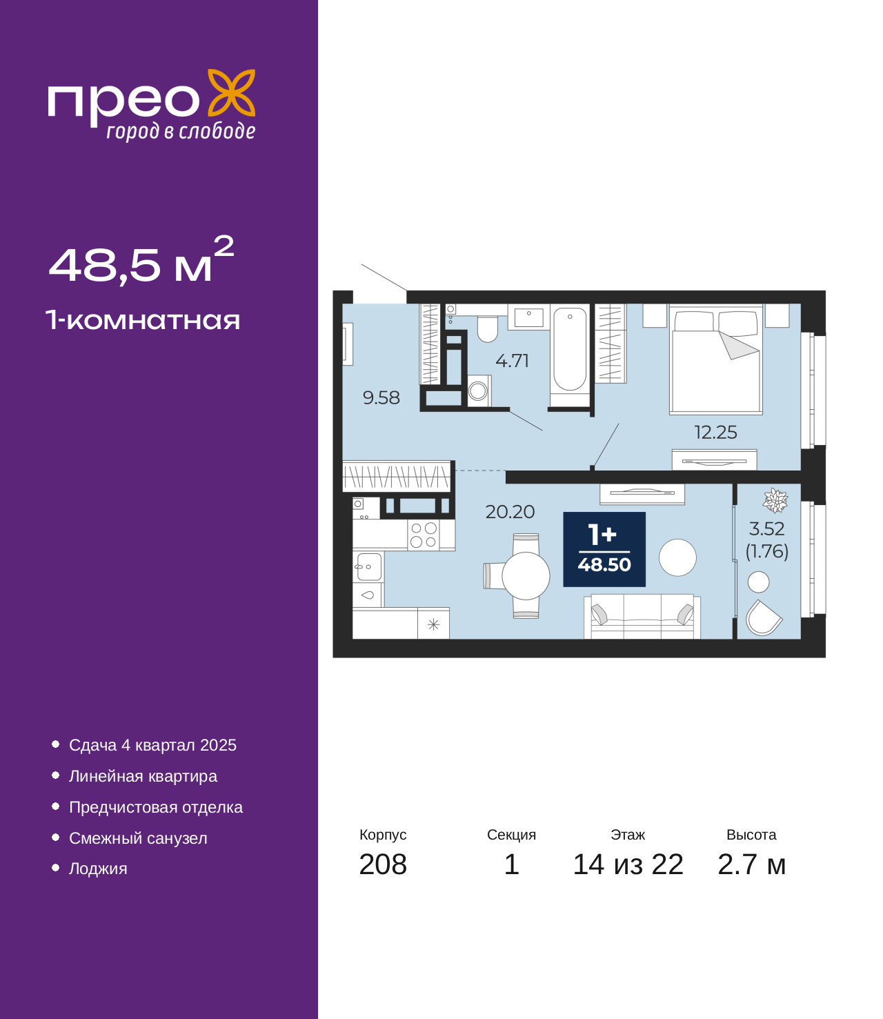 Однокомнатная квартира с предчистовой отделкой в ЖК "Прео" на 14 этаже. Общая площадь: 48.5 кв.м., жилая: 12.25 кв.м., площадь просторной кухни-столовой: 20.2 кв.м. Все окна выходят на одну сторону. В квартире одна лоджия, один совмещенный санузел. Высота потолков 2.7 м. Дом монолитный, трехподъездный, переменной этажности, от 14 до 22 этажей. Квартира находится в 1-й секции высотой 22 этажа в корпусе 208. На этаже 8 квартир. В подъезде 1 пассажирский и 1 грузовой лифт. Окончание строительства - 4 квартал 2025 года. Оформление сделки по договору долевого участия. Преображенский — один из самых привлекательных районов для жизни! Это полностью самостоятельный жилой район с точки зрения инфраструктуры. Преображенский находится между Московским и Червишевским трактами в квартале улиц Закалужская — Вьюжная — Александра Протозанова. Не нужно ждать, когда появится инфраструктура — переезжайте на всё готовое. Вблизи расположены действующие школа и детский сад. В этом году откроется еще один сад, а в следующем году — школа. По соседству с Преображенским запланировано строительство городского парка «Комарово» площадью 38 гектар. За 10 минут можно доехать на автомобиле до крупных ТРЦ: «Лента», «Кристалл», «Леруа Мерлен», «Метро» и «Ашан». С 2018 года в районе открыт Соседский центр — пространство, созданное для формирования добрососедской среды, совместного досуга, общения и реализации соседских инициатив. Здесь проходят встречи соседей, а также сами жители района организовывают мероприятия. Организатором такого события может стать любой желающий. В квартирах выполнена качественная предчистовая отделка. Гладкие стены с финишным выравниванием по маякам. Ровный потолок для установки натяжного потолка. Установлены пятикамерные окна с двойным стеклопакетом (3 стекла). Дизайнерские холлы с видеонаблюдением, безбарьерным и прозрачным входом – всегда светло и спокойно. На первом этаже есть просторные колясочные, где все жители могут оставлять свои коляски и велосипеды. В Преображенском есть всё, что нужно для активного отдыха и занятий спортом. Мы сделали большое футбольное поле с безопасным покрытием. Также установили хоккейный корт, который оборудован по всем необходимым стандартам. Во дворах можно делать упражнения на специальных площадках с турниками. Весь район мы обустроили велодорожками, которые связаны в единый маршрут. У нас есть сухие фонтаны, бьющие из земли, деревья, веревки, сетки, скалодром, газон, песок и резинка — осталось просто дать своему ребенку право на свободную игру. По-настоящему хорошие дворы — это те, которые дети предпочитают соцсетям и телевизору. Аккредитация в банках: «Сбербанк России», ПАО «Газпромбанк», ОАО «Альфа-Банк», ПАО «Банк Уралсиб», ПАО Банк «ВТБ» и других. (AQID02355533)