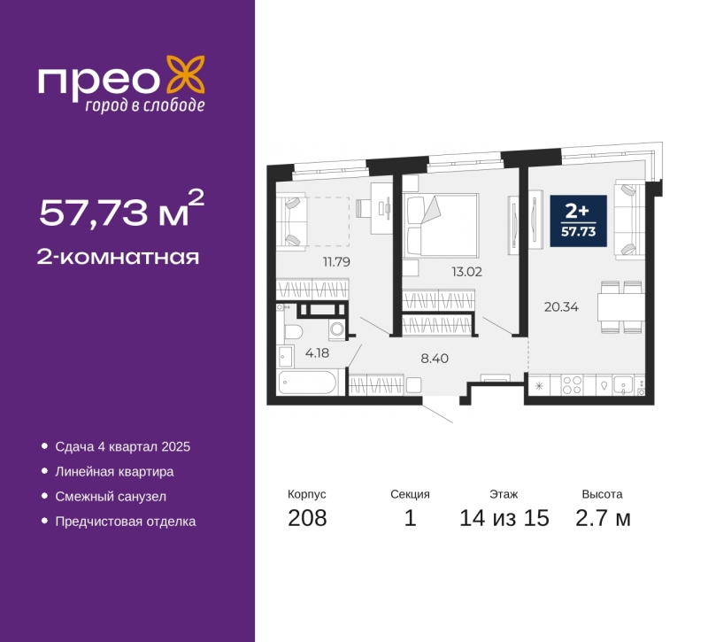 Двухкомнатная квартира от застройщика с предчистовой отделкой в ЖК "Прео" на 14 этаже. Общая площадь: 57.73 кв.м., жилая: 24.81 кв.м., площадь просторной кухни-столовой: 20.34 кв.м. Комнаты изолированные, все окна выходят на одну сторону. В квартире один совмещенный санузел. Высота потолков 2.7 м. Дом монолитный, трехподъездный, переменной этажности, от 14 до 22 этажей. Квартира находится в 1-й секции высотой 22 этажа в корпусе 208. На этаже 8 квартир. В подъезде 1 пассажирский и 1 грузовой лифт. Окончание строительства - 1 квартал 2026 года. Оформление сделки по договору долевого участия. Преображенский — один из самых привлекательных районов для жизни! Это полностью самостоятельный жилой район с точки зрения инфраструктуры. Преображенский находится между Московским и Червишевским трактами в квартале улиц Закалужская — Вьюжная — Александра Протозанова. Не нужно ждать, когда появится инфраструктура — переезжайте на всё готовое. Вблизи расположены действующие школа и детский сад. В этом году откроется еще один сад, а в следующем году — школа. По соседству с Преображенским запланировано строительство городского парка «Комарово» площадью 38 гектар. За 10 минут можно доехать на автомобиле до крупных ТРЦ: «Лента», «Кристалл», «Леруа Мерлен», «Метро» и «Ашан». С 2018 года в районе открыт Соседский центр — пространство, созданное для формирования добрососедской среды, совместного досуга, общения и реализации соседских инициатив. Здесь проходят встречи соседей, а также сами жители района организовывают мероприятия. Организатором такого события может стать любой желающий. В квартирах выполнена качественная предчистовая отделка. Гладкие стены с финишным выравниванием по маякам. Ровный потолок для установки натяжного потолка. Установлены пятикамерные окна с двойным стеклопакетом (3 стекла). Дизайнерские холлы с видеонаблюдением, безбарьерным и прозрачным входом – всегда светло и спокойно. На первом этаже есть просторные колясочные, где все жители могут оставлять свои коляски и велосипеды. В Преображенском есть всё, что нужно для активного отдыха и занятий спортом. Мы сделали большое футбольное поле с безопасным покрытием. Также установили хоккейный корт, который оборудован по всем необходимым стандартам. Во дворах можно делать упражнения на специальных площадках с турниками. Весь район мы обустроили велодорожками, которые связаны в единый маршрут. У нас есть сухие фонтаны, бьющие из земли, деревья, веревки, сетки, скалодром, газон, песок и резинка — осталось просто дать своему ребенку право на свободную игру. По-настоящему хорошие дворы — это те, которые дети предпочитают соцсетям и телевизору. Аккредитация в банках: ПАО Банк «ВТБ», ПАО «Банк Уралсиб», ПАО «Газпромбанк», ОАО «Альфа-Банк», «Сбербанк России» и других. (AQID02355717)