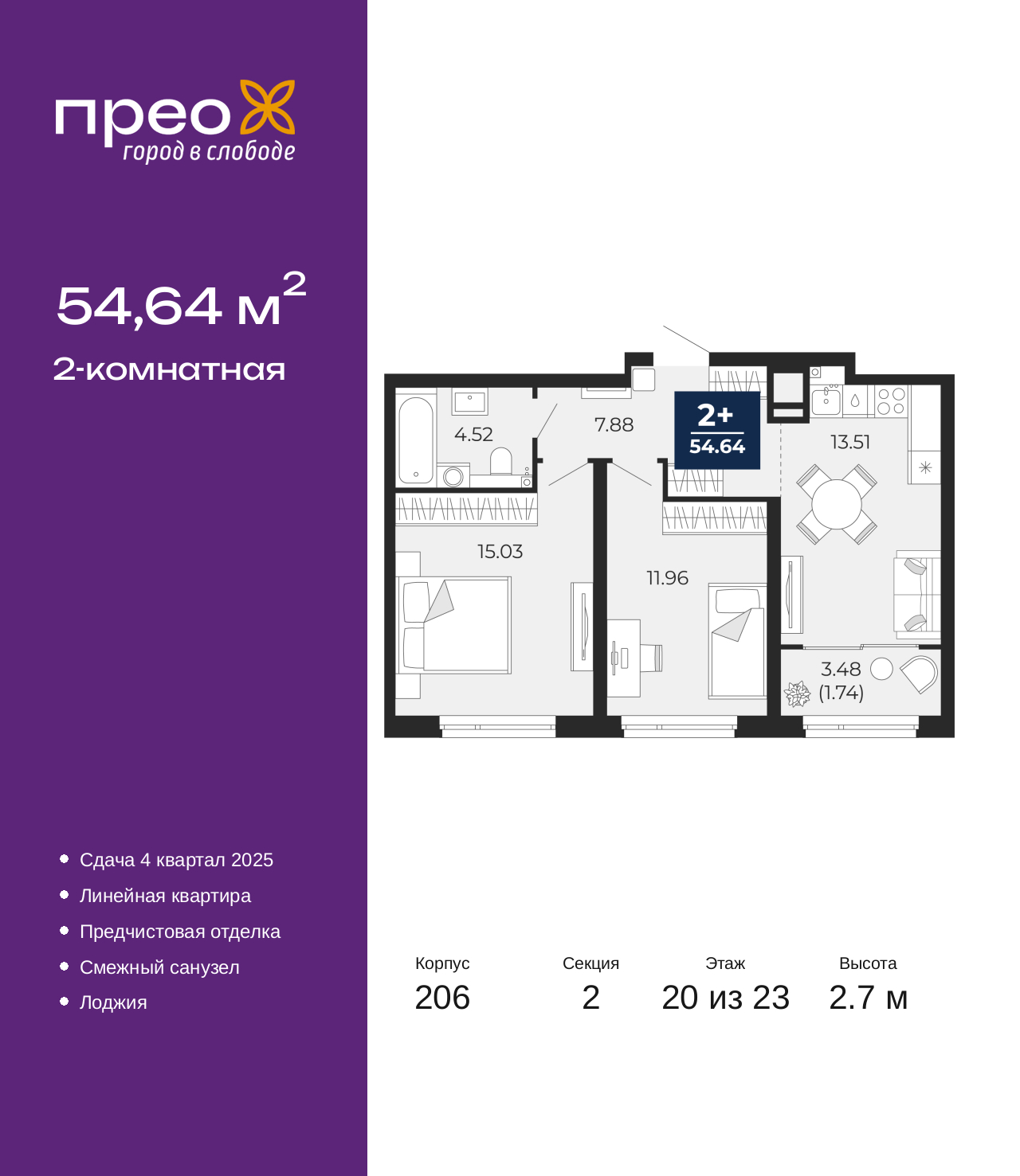 Продается двухкомнатная квартира с предчистовой отделкой в ЖК "Прео" на 20 этаже. Общая площадь: 54.64 кв.м., жилая: 26.99 кв.м., площадь просторной кухни-столовой: 13.51 кв.м. Комнаты изолированные, все окна выходят на одну сторону. В квартире одна лоджия, один совмещенный санузел. Высота потолков 2.7 м. Дом монолитный, трехподъездный, переменной этажности, от 14 до 23 этажей. Квартира находится во 2-й секции высотой 23 этажа в корпусе 206. На этаже 10 квартир. В подъезде 1 пассажирский и 1 грузовой лифт. Окончание строительства - 1 квартал 2026 года. Оформление сделки по договору долевого участия. Преображенский — один из самых привлекательных районов для жизни! Это полностью самостоятельный жилой район с точки зрения инфраструктуры. Преображенский находится между Московским и Червишевским трактами в квартале улиц Закалужская — Вьюжная — Александра Протозанова. Не нужно ждать, когда появится инфраструктура — переезжайте на всё готовое. Вблизи расположены действующие школа и детский сад. В этом году откроется еще один сад, а в следующем году — школа. По соседству с Преображенским запланировано строительство городского парка «Комарово» площадью 38 гектар. За 10 минут можно доехать на автомобиле до крупных ТРЦ: «Лента», «Кристалл», «Леруа Мерлен», «Метро» и «Ашан». С 2018 года в районе открыт Соседский центр — пространство, созданное для формирования добрососедской среды, совместного досуга, общения и реализации соседских инициатив. Здесь проходят встречи соседей, а также сами жители района организовывают мероприятия. Организатором такого события может стать любой желающий. В квартирах выполнена качественная предчистовая отделка. Гладкие стены с финишным выравниванием по маякам. Ровный потолок для установки натяжного потолка. Установлены пятикамерные окна с двойным стеклопакетом (3 стекла). Дизайнерские холлы с видеонаблюдением, безбарьерным и прозрачным входом – всегда светло и спокойно. На первом этаже есть просторные колясочные, где все жители могут оставлять свои коляски и велосипеды. В Преображенском есть всё, что нужно для активного отдыха и занятий спортом. Мы сделали большое футбольное поле с безопасным покрытием. Также установили хоккейный корт, который оборудован по всем необходимым стандартам. Во дворах можно делать упражнения на специальных площадках с турниками. Весь район мы обустроили велодорожками, которые связаны в единый маршрут. У нас есть сухие фонтаны, бьющие из земли, деревья, веревки, сетки, скалодром, газон, песок и резинка — осталось просто дать своему ребенку право на свободную игру. По-настоящему хорошие дворы — это те, которые дети предпочитают соцсетям и телевизору. Аккредитация в банках: ПАО «Банк Уралсиб», ПАО «Газпромбанк», ПАО Банк «ВТБ», «Сбербанк России», ОАО «Альфа-Банк» и других. (AQID02355620)