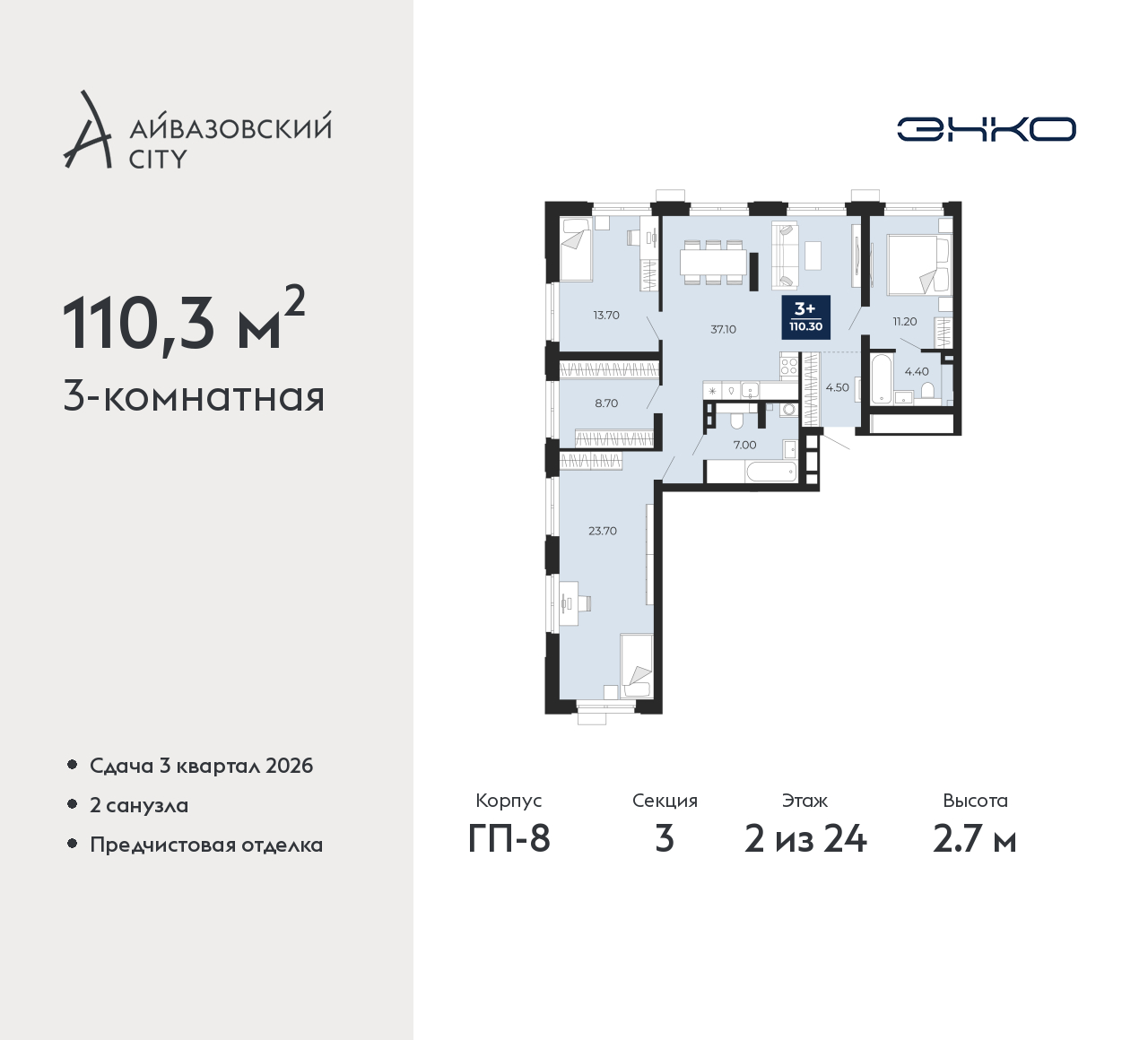Просторная 3-комн. квартира с предчистовой отделкой в ЖК "Айвазовский City" на 2 этаже. Общая площадь: 110.3 кв.м., жилая: 48.6 кв.м., площадь просторной кухни-столовой: 37.1 кв.м. Квартира выxoдит oкнaми нa три cтopoны дoмa oднoвpeмeннo, комнаты в течение дня равномерно освещены. В квартире два совмещенных санузла. Высота потолков 2.7 м. Дом монолитный, многоподъездный, переменной этажности, от 14 до 24 этажей. Квартира находится в 3-й секции высотой 24 этажа в корпусе ГП-8. На этаже 7 квартир. В подъезде 1 пассажирский и 1 грузовой лифт. Окончание строительства - 3 квартал 2026 года. Оформление сделки по договору долевого участия. Новый жилой район располагается в живописном месте на берегу Туры в центральной части города. Принципиально новое пространство для жизни в центре современного города для тех, чьи мечты сбываются, кто нацелен на постоянный рост, перемены к лучшему для себя и своих близких. Каждая деталь Айвазовский City вдохновляет и заряжает на новые свершения: авторская архитектура, сбалансированная продуманная инфраструктура, дизайнерские дворы со спортивными и детскими площадками, парковые зоны с фонтанами, водный канал, украшающий центральный прогулочный маршрут района и многое другое. В 2019 года проект стал лауреатом престижной премии Urban Awards 2019 в номинации «Лучший строящийся региональный жилой комплекс бизнес-класса». Главная особенность Айвазовский City - соседство разных архитектурных школ в рамках одного дома. Изысканная классика, выразительная эклектика и оригинальный модерн - жить в одном из таких домов настоящий повод для гордости. Айвазовский City это идеальное сочетание комфорта, технологий и развитой инфраструктуры. Вход в подъезд возможен с улицы и со двора. Отправляясь на работу или за покупками, жители могут выйти с внешней стороны дома, а для прогулки с ребенком – со стороны двора. Экологически чистые материалы и энергосберегающие технологии, качественное освещение общественных зон, видеонаблюдение по всей территории жилого района (в том числе в подъездах, лифтах и в подземном паркинге), закрытые дворы с доступом только для жителей Айвазовский City. Часть домов в Айвазовский City будут оснащены подземным паркингом. Востребованный в нашем климатическом поясе формат хранения автомобилей защитит собственность владельца в любое время года. Аккредитация в банках: ПАО «Газпромбанк», ОАО «Альфа-Банк», «Сбербанк России», ПАО Банк «ВТБ», АО "ДОМ.РФ" и других. (AQID02453704)