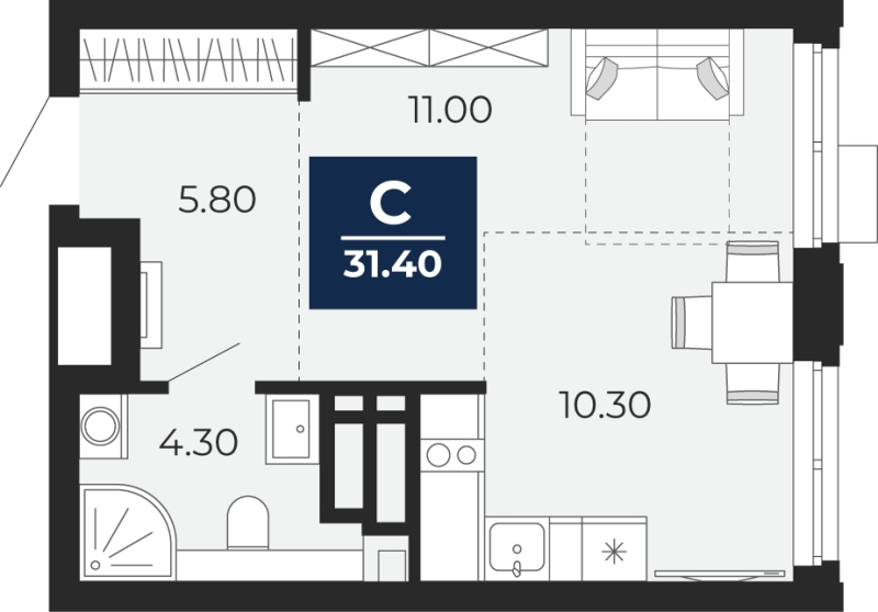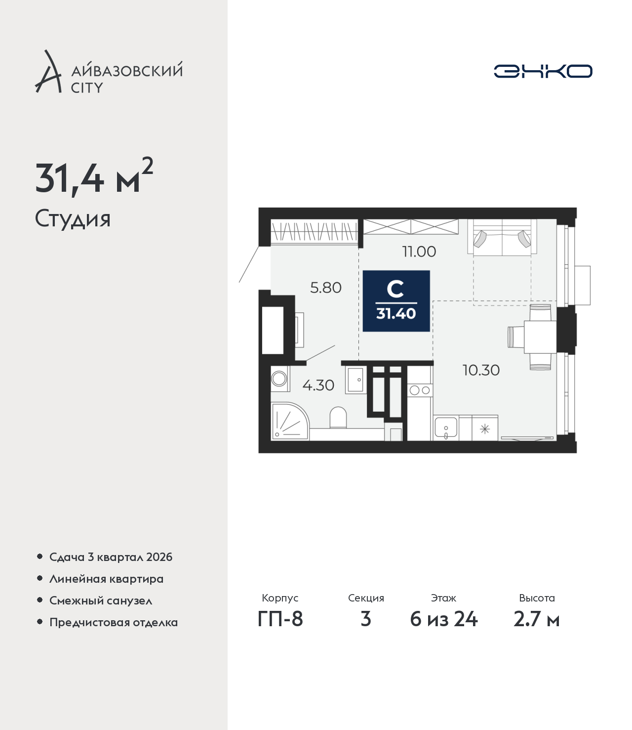 Продается однокомнатная квартира-студия от застройщика с предчистовой отделкой в ЖК "Айвазовский City" на 6 этаже. Общая площадь: 31.4 кв.м., площадь гостиной 21.3 кв.м., из которых 10.3 кв.м. выделено под кухонную зону. Все окна выходят на одну сторону. В квартире один совмещенный санузел. Высота потолков 2.7 м. Дом монолитный, многоподъездный, переменной этажности, от 14 до 24 этажей. Квартира находится в 3-й секции высотой 24 этажа в корпусе ГП-8. На этаже 7 квартир. В подъезде 1 пассажирский и 1 грузовой лифт. Окончание строительства - 3 квартал 2026 года. Оформление сделки по договору долевого участия. Новый жилой район располагается в живописном месте на берегу Туры в центральной части города. Принципиально новое пространство для жизни в центре современного города для тех, чьи мечты сбываются, кто нацелен на постоянный рост, перемены к лучшему для себя и своих близких. Каждая деталь Айвазовский City вдохновляет и заряжает на новые свершения: авторская архитектура, сбалансированная продуманная инфраструктура, дизайнерские дворы со спортивными и детскими площадками, парковые зоны с фонтанами, водный канал, украшающий центральный прогулочный маршрут района и многое другое. В 2019 года проект стал лауреатом престижной премии Urban Awards 2019 в номинации «Лучший строящийся региональный жилой комплекс бизнес-класса». Главная особенность Айвазовский City - соседство разных архитектурных школ в рамках одного дома. Изысканная классика, выразительная эклектика и оригинальный модерн - жить в одном из таких домов настоящий повод для гордости. Айвазовский City это идеальное сочетание комфорта, технологий и развитой инфраструктуры. Вход в подъезд возможен с улицы и со двора. Отправляясь на работу или за покупками, жители могут выйти с внешней стороны дома, а для прогулки с ребенком – со стороны двора. Экологически чистые материалы и энергосберегающие технологии, качественное освещение общественных зон, видеонаблюдение по всей территории жилого района (в том числе в подъездах, лифтах и в подземном паркинге), закрытые дворы с доступом только для жителей Айвазовский City. Часть домов в Айвазовский City будут оснащены подземным паркингом. Востребованный в нашем климатическом поясе формат хранения автомобилей защитит собственность владельца в любое время года. Аккредитация в банках: ПАО «Газпромбанк», ПАО Банк «ВТБ», «Сбербанк России», ОАО «Альфа-Банк», ПАО АКБ «Абсолют Банк» и других. (AQID02453711)