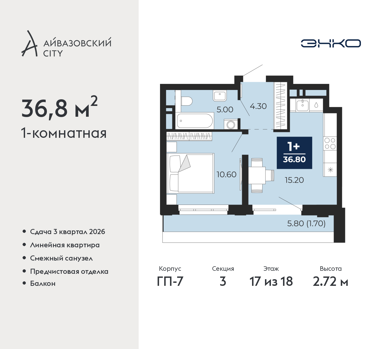 1-комн. квартира от застройщика с предчистовой отделкой в ЖК "Айвазовский City" на 17 этаже. Общая площадь: 36.8 кв.м., жилая: 10.6 кв.м., площадь просторной кухни-столовой: 15.2 кв.м. Все окна выходят на одну сторону. В квартире один балкон, один совмещенный санузел. Высота потолков 2.72 м. Дом монолитный, многоподъездный, переменной этажности, от 9 до 24 этажей. Квартира находится в 3-й секции высотой 18 этажей в корпусе ГП-7. На этаже 5 квартир. В подъезде 1 пассажирский и 2 грузовых лифта. Окончание строительства - 3 квартал 2026 года. Оформление сделки по договору долевого участия. Новый жилой район располагается в живописном месте на берегу Туры в центральной части города. Принципиально новое пространство для жизни в центре современного города для тех, чьи мечты сбываются, кто нацелен на постоянный рост, перемены к лучшему для себя и своих близких. Каждая деталь Айвазовский City вдохновляет и заряжает на новые свершения: авторская архитектура, сбалансированная продуманная инфраструктура, дизайнерские дворы со спортивными и детскими площадками, парковые зоны с фонтанами, водный канал, украшающий центральный прогулочный маршрут района и многое другое. В 2019 года проект стал лауреатом престижной премии Urban Awards 2019 в номинации «Лучший строящийся региональный жилой комплекс бизнес-класса». Главная особенность Айвазовский City - соседство разных архитектурных школ в рамках одного дома. Изысканная классика, выразительная эклектика и оригинальный модерн - жить в одном из таких домов настоящий повод для гордости. Айвазовский City это идеальное сочетание комфорта, технологий и развитой инфраструктуры. Вход в подъезд возможен с улицы и со двора. Отправляясь на работу или за покупками, жители могут выйти с внешней стороны дома, а для прогулки с ребенком – со стороны двора. Экологически чистые материалы и энергосберегающие технологии, качественное освещение общественных зон, видеонаблюдение по всей территории жилого района (в том числе в подъездах, лифтах и в подземном паркинге), закрытые дворы с доступом только для жителей Айвазовский City. Часть домов в Айвазовский City будут оснащены подземным паркингом. Востребованный в нашем климатическом поясе формат хранения автомобилей защитит собственность владельца в любое время года. Аккредитация в банках: «Сбербанк России», ОАО «Альфа-Банк», ПАО Банк «ВТБ», ПАО «Газпромбанк», ПАО «Промсвязьбанк» и других. (AQID02487965)