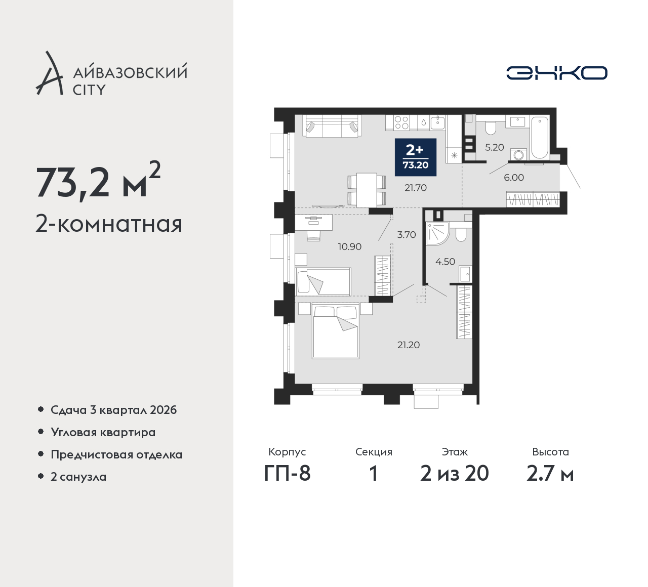 2-комн. квартира с предчистовой отделкой в ЖК "Айвазовский City" на 2 этаже. Общая площадь: 73.2 кв.м., жилая: 32.1 кв.м., площадь просторной кухни-столовой: 21.7 кв.м. Угловая квартира, идеально подойдет любителям тишины и панорамных видов. В квартире два совмещенных санузла. Высота потолков 2.7 м. Дом монолитный, многоподъездный, переменной этажности, от 14 до 24 этажей. Квартира находится в 1-й секции высотой 20 этажей в корпусе ГП-8. На этаже 6 квартир. В подъезде 1 пассажирский и 1 грузовой лифт. Окончание строительства - 3 квартал 2026 года. Оформление сделки по договору долевого участия. Новый жилой район располагается в живописном месте на берегу Туры в центральной части города. Принципиально новое пространство для жизни в центре современного города для тех, чьи мечты сбываются, кто нацелен на постоянный рост, перемены к лучшему для себя и своих близких. Каждая деталь Айвазовский City вдохновляет и заряжает на новые свершения: авторская архитектура, сбалансированная продуманная инфраструктура, дизайнерские дворы со спортивными и детскими площадками, парковые зоны с фонтанами, водный канал, украшающий центральный прогулочный маршрут района и многое другое. В 2019 года проект стал лауреатом престижной премии Urban Awards 2019 в номинации «Лучший строящийся региональный жилой комплекс бизнес-класса». Главная особенность Айвазовский City - соседство разных архитектурных школ в рамках одного дома. Изысканная классика, выразительная эклектика и оригинальный модерн - жить в одном из таких домов настоящий повод для гордости. Айвазовский City это идеальное сочетание комфорта, технологий и развитой инфраструктуры. Вход в подъезд возможен с улицы и со двора. Отправляясь на работу или за покупками, жители могут выйти с внешней стороны дома, а для прогулки с ребенком – со стороны двора. Экологически чистые материалы и энергосберегающие технологии, качественное освещение общественных зон, видеонаблюдение по всей территории жилого района (в том числе в подъездах, лифтах и в подземном паркинге), закрытые дворы с доступом только для жителей Айвазовский City. Часть домов в Айвазовский City будут оснащены подземным паркингом. Востребованный в нашем климатическом поясе формат хранения автомобилей защитит собственность владельца в любое время года. Аккредитация в банках: «Сбербанк России», ОАО «Альфа-Банк», ПАО Банк «ВТБ», ПАО «Газпромбанк», ПАО «Промсвязьбанк» и других. (AQID02441122)