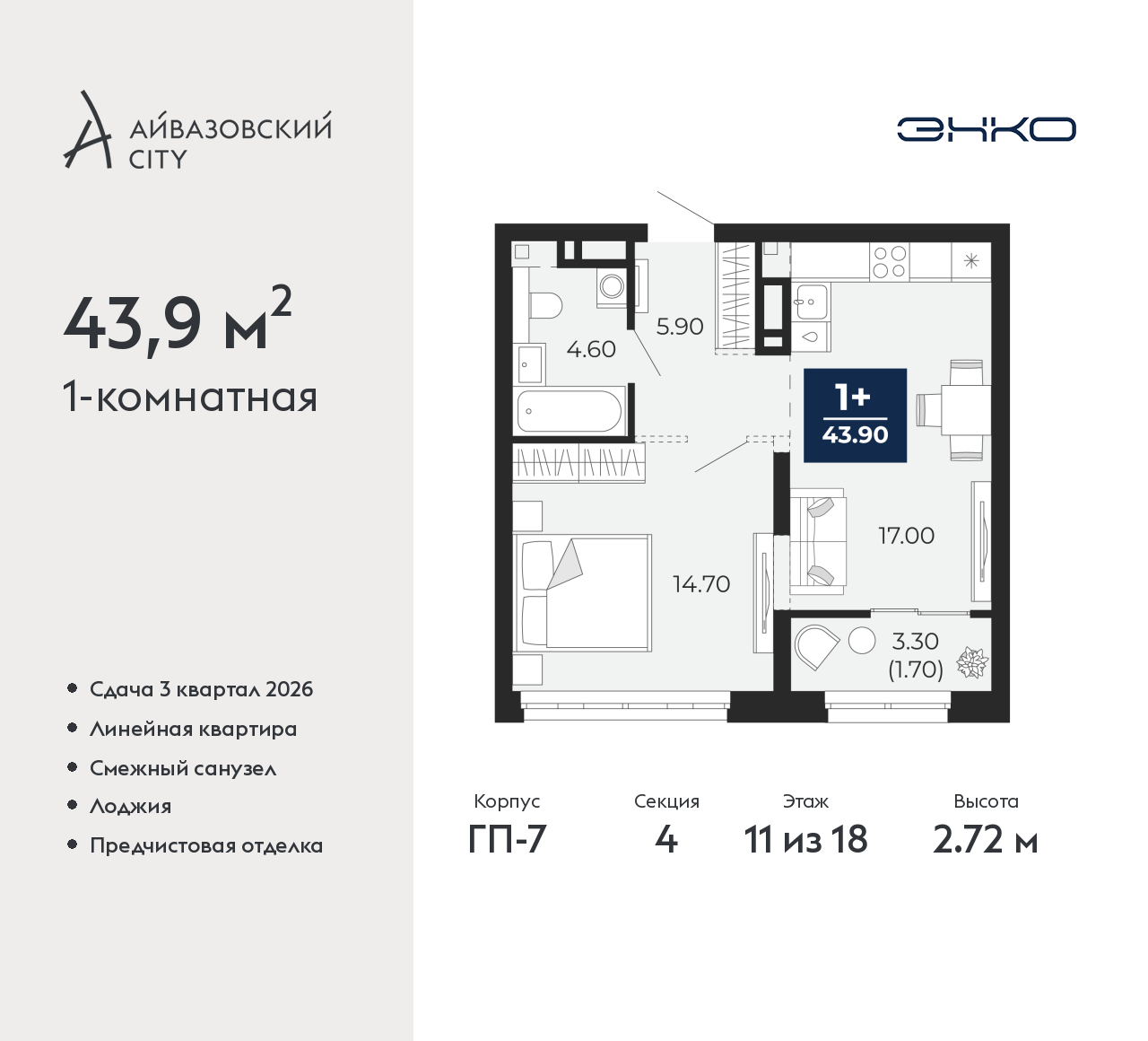 Продается однокомнатная квартира от застройщика с предчистовой отделкой в ЖК "Айвазовский City" на 11 этаже. Общая площадь: 43.9 кв.м., жилая: 14.7 кв.м., площадь просторной кухни-столовой: 17 кв.м. Все окна выходят на одну сторону. В квартире одна лоджия, один совмещенный санузел. Высота потолков 2.72 м. Дом монолитный, многоподъездный, переменной этажности, от 9 до 24 этажей. Квартира находится в 4-й секции высотой 18 этажей в корпусе ГП-7. На этаже 5 квартир. В подъезде 1 пассажирский и 2 грузовых лифта. Окончание строительства - 3 квартал 2026 года. Оформление сделки по договору долевого участия. Новый жилой район располагается в живописном месте на берегу Туры в центральной части города. Принципиально новое пространство для жизни в центре современного города для тех, чьи мечты сбываются, кто нацелен на постоянный рост, перемены к лучшему для себя и своих близких. Каждая деталь Айвазовский City вдохновляет и заряжает на новые свершения: авторская архитектура, сбалансированная продуманная инфраструктура, дизайнерские дворы со спортивными и детскими площадками, парковые зоны с фонтанами, водный канал, украшающий центральный прогулочный маршрут района и многое другое. В 2019 года проект стал лауреатом престижной премии Urban Awards 2019 в номинации «Лучший строящийся региональный жилой комплекс бизнес-класса». Главная особенность Айвазовский City - соседство разных архитектурных школ в рамках одного дома. Изысканная классика, выразительная эклектика и оригинальный модерн - жить в одном из таких домов настоящий повод для гордости. Айвазовский City это идеальное сочетание комфорта, технологий и развитой инфраструктуры. Вход в подъезд возможен с улицы и со двора. Отправляясь на работу или за покупками, жители могут выйти с внешней стороны дома, а для прогулки с ребенком – со стороны двора. Экологически чистые материалы и энергосберегающие технологии, качественное освещение общественных зон, видеонаблюдение по всей территории жилого района (в том числе в подъездах, лифтах и в подземном паркинге), закрытые дворы с доступом только для жителей Айвазовский City. Часть домов в Айвазовский City будут оснащены подземным паркингом. Востребованный в нашем климатическом поясе формат хранения автомобилей защитит собственность владельца в любое время года. Аккредитация в банках: ОАО «Альфа-Банк», ПАО «Газпромбанк», «Сбербанк России», ПАО Банк «ВТБ», ПАО Банк «ФК Открытие» и других. (AQID02497759)