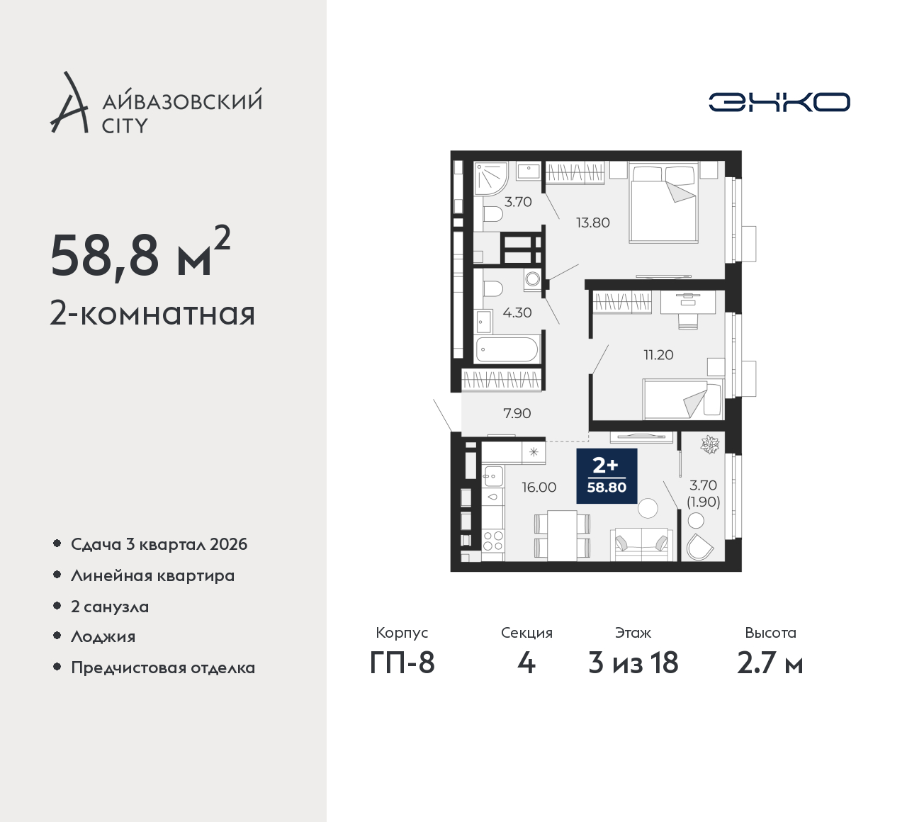 Квартира 2-комн., 59 м2, 3/18 этаж,