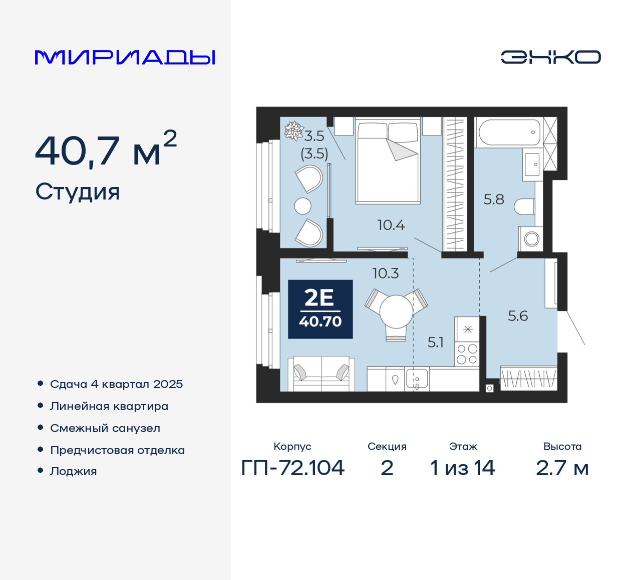 Просторная двухкомнатная квартира с европланировкой и предчистовой отделкой в ЖК "Мириады" на 1 этаже. Общая площадь: 40.7 кв.м., жилая: 20.7 кв.м., общая площадь гостиной-столовой с кухонной зоной: 15.4 кв.м. Европейская планировка, в просторной кухне-гостиной удобно как готовить, так и отдыхать. Комнаты изолированные, все окна выходят на одну сторону. В квартире одна лоджия, один совмещенный санузел. Высота потолков 2.7 м. Дом монолитный, двухподъездный, переменной этажности, от 14 до 18 этажей. Квартира находится во 2-й секции высотой 14 этажей в корпусе ГП-72.104. На этаже 8 квартир. В подъезде 1 пассажирский и 1 грузовой лифт. Окончание строительства - 4 квартал 2025 года. Оформление сделки по договору долевого участия. Вселенная бесконечных историй. Ранее невиданный Тюмени масштаб: территория 240 гектаров и 1 650 000 м² застройки. Мириады – это город масштабных перемен и больших возможностей. Город зеленых рощ и зеркальных озер. Город для работы, учебы и развлечений. Город для детей и их родителей. Город для всех и каждого. Проект расположен в районе Мыс рядом с ТРЦ «Тюмень Сити Молл» в границах улицы Тимофея Чаркова, Тобольского тракта и объездной дороги. Срок полного освоения территории - до 2034 года. (AQID02522568)