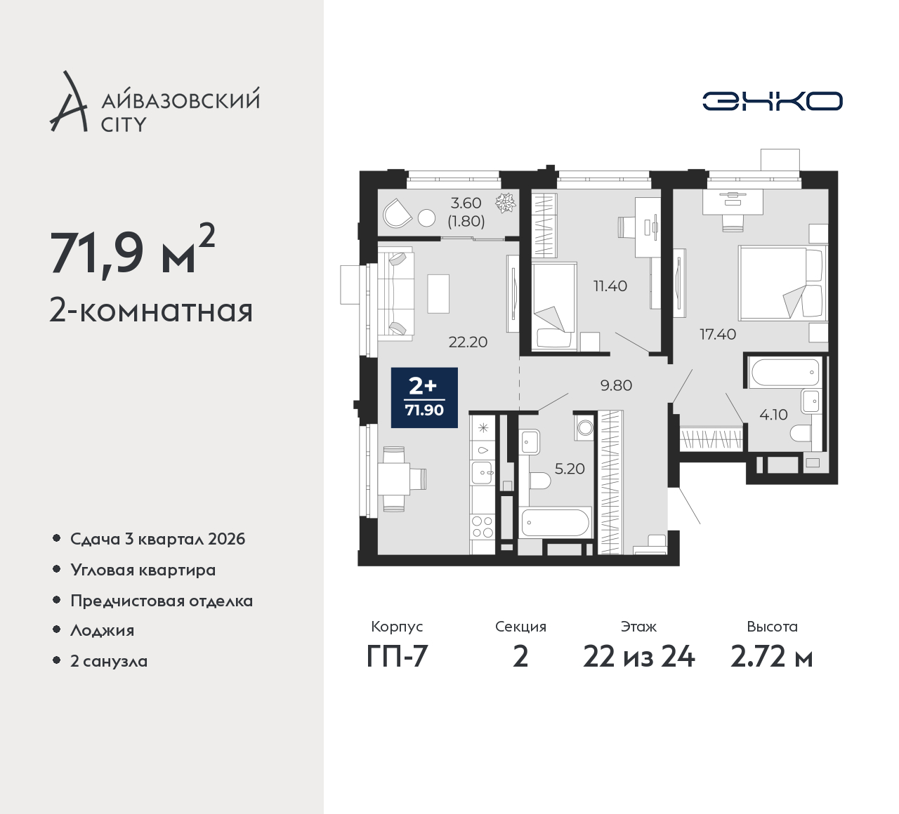 Двухкомнатная квартира с предчистовой отделкой в ЖК "Айвазовский City" на 22 этаже. Общая площадь: 71.9 кв.м., жилая: 28.8 кв.м., площадь просторной кухни-столовой: 22.2 кв.м. Угловая квартира, очень светлая, естественная вентиляция при открытии окон. В квартире одна лоджия, два совмещенных санузла. Высота потолков 2.72 м. Дом монолитный, многоподъездный, переменной этажности, от 9 до 24 этажей. Квартира находится во 2-й секции высотой 24 этажа в корпусе ГП-7. На этаже 7 квартир. В подъезде 1 пассажирский и 2 грузовых лифта. Окончание строительства - 3 квартал 2026 года. Оформление сделки по договору долевого участия. Новый жилой район располагается в живописном месте на берегу Туры в центральной части города. Принципиально новое пространство для жизни в центре современного города для тех, чьи мечты сбываются, кто нацелен на постоянный рост, перемены к лучшему для себя и своих близких. Каждая деталь Айвазовский City вдохновляет и заряжает на новые свершения: авторская архитектура, сбалансированная продуманная инфраструктура, дизайнерские дворы со спортивными и детскими площадками, парковые зоны с фонтанами, водный канал, украшающий центральный прогулочный маршрут района и многое другое. В 2019 года проект стал лауреатом престижной премии Urban Awards 2019 в номинации «Лучший строящийся региональный жилой комплекс бизнес-класса». Главная особенность Айвазовский City - соседство разных архитектурных школ в рамках одного дома. Изысканная классика, выразительная эклектика и оригинальный модерн - жить в одном из таких домов настоящий повод для гордости. Айвазовский City это идеальное сочетание комфорта, технологий и развитой инфраструктуры. Вход в подъезд возможен с улицы и со двора. Отправляясь на работу или за покупками, жители могут выйти с внешней стороны дома, а для прогулки с ребенком – со стороны двора. Экологически чистые материалы и энергосберегающие технологии, качественное освещение общественных зон, видеонаблюдение по всей территории жилого района (в том числе в подъездах, лифтах и в подземном паркинге), закрытые дворы с доступом только для жителей Айвазовский City. Часть домов в Айвазовский City будут оснащены подземным паркингом. Востребованный в нашем климатическом поясе формат хранения автомобилей защитит собственность владельца в любое время года. Аккредитация в банках: ПАО Банк «ВТБ», ОАО «Альфа-Банк», «Сбербанк России», ПАО «Газпромбанк», ПАО «Совкомбанк» и других. (AQID02497747)