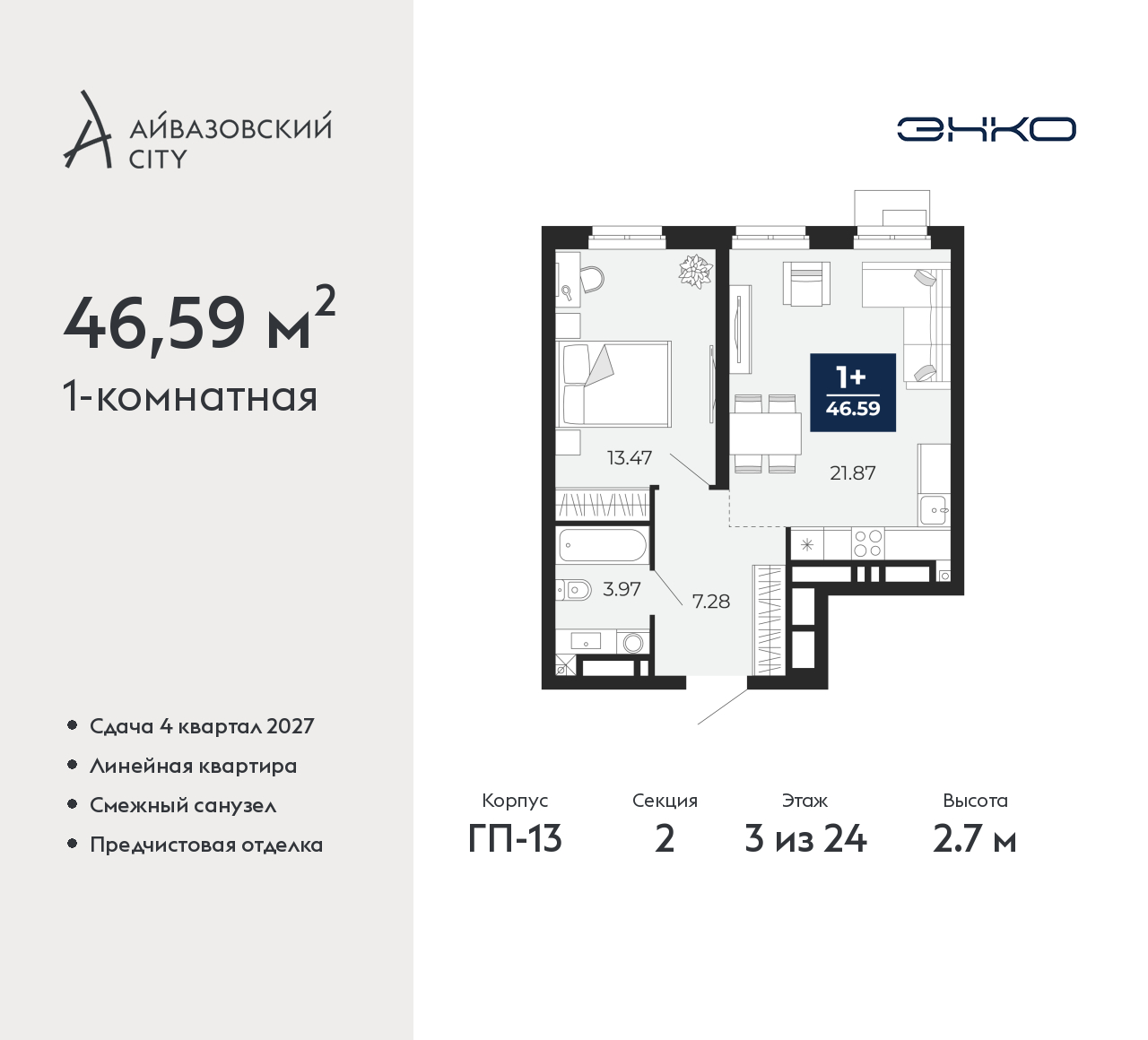 Просторная 1-комн. квартира с предчистовой отделкой в ЖК "Айвазовский City" на 3 этаже. Общая площадь: 46.59 кв.м., жилая: 13.47 кв.м., площадь просторной кухни-столовой: 21.87 кв.м. Все окна выходят на одну сторону. В квартире один совмещенный санузел. Высота потолков 2.7 м. Дом монолитный, многоподъездный, высотой 24 этажа. Квартира находится во 2-й секции в корпусе ГП-13. На этаже 6 квартир. В подъезде 1 пассажирский и 1 грузовой лифт. Окончание строительства - 4 квартал 2027 года. Оформление сделки по договору долевого участия. Новый жилой район располагается в живописном месте на берегу Туры в центральной части города. Принципиально новое пространство для жизни в центре современного города для тех, чьи мечты сбываются, кто нацелен на постоянный рост, перемены к лучшему для себя и своих близких. Каждая деталь Айвазовский City вдохновляет и заряжает на новые свершения: авторская архитектура, сбалансированная продуманная инфраструктура, дизайнерские дворы со спортивными и детскими площадками, парковые зоны с фонтанами, водный канал, украшающий центральный прогулочный маршрут района и многое другое. В 2019 года проект стал лауреатом престижной премии Urban Awards 2019 в номинации «Лучший строящийся региональный жилой комплекс бизнес-класса». Главная особенность Айвазовский City - соседство разных архитектурных школ в рамках одного дома. Изысканная классика, выразительная эклектика и оригинальный модерн - жить в одном из таких домов настоящий повод для гордости. Айвазовский City это идеальное сочетание комфорта, технологий и развитой инфраструктуры. Вход в подъезд возможен с улицы и со двора. Отправляясь на работу или за покупками, жители могут выйти с внешней стороны дома, а для прогулки с ребенком – со стороны двора. Экологически чистые материалы и энергосберегающие технологии, качественное освещение общественных зон, видеонаблюдение по всей территории жилого района (в том числе в подъездах, лифтах и в подземном паркинге), закрытые дворы с доступом только для жителей Айвазовский City. Часть домов в Айвазовский City будут оснащены подземным паркингом. Востребованный в нашем климатическом поясе формат хранения автомобилей защитит собственность владельца в любое время года. Аккредитация в банках: ПАО «Газпромбанк», «Сбербанк России», ОАО «Альфа-Банк», ПАО Банк «ВТБ», ПАО «Совкомбанк» и других. (AQID02525600)