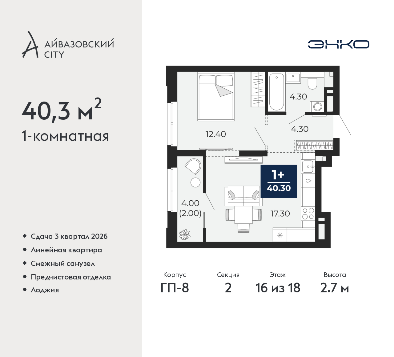 Продается однокомнатная квартира с предчистовой отделкой в ЖК "Айвазовский City" на 16 этаже. Общая площадь: 40.3 кв.м., жилая: 12.4 кв.м., площадь просторной кухни-столовой: 17.3 кв.м. Все окна выходят на одну сторону. В квартире одна лоджия, один совмещенный санузел. Высота потолков 2.7 м. Дом монолитный, многоподъездный, переменной этажности, от 14 до 24 этажей. Квартира находится во 2-й секции высотой 18 этажей в корпусе ГП-8. На этаже 5 квартир. В подъезде 1 пассажирский и 1 грузовой лифт. Окончание строительства - 3 квартал 2026 года. Оформление сделки по договору долевого участия. Новый жилой район располагается в живописном месте на берегу Туры в центральной части города. Принципиально новое пространство для жизни в центре современного города для тех, чьи мечты сбываются, кто нацелен на постоянный рост, перемены к лучшему для себя и своих близких. Каждая деталь Айвазовский City вдохновляет и заряжает на новые свершения: авторская архитектура, сбалансированная продуманная инфраструктура, дизайнерские дворы со спортивными и детскими площадками, парковые зоны с фонтанами, водный канал, украшающий центральный прогулочный маршрут района и многое другое. В 2019 года проект стал лауреатом престижной премии Urban Awards 2019 в номинации «Лучший строящийся региональный жилой комплекс бизнес-класса». Главная особенность Айвазовский City - соседство разных архитектурных школ в рамках одного дома. Изысканная классика, выразительная эклектика и оригинальный модерн - жить в одном из таких домов настоящий повод для гордости. Айвазовский City это идеальное сочетание комфорта, технологий и развитой инфраструктуры. Вход в подъезд возможен с улицы и со двора. Отправляясь на работу или за покупками, жители могут выйти с внешней стороны дома, а для прогулки с ребенком – со стороны двора. Экологически чистые материалы и энергосберегающие технологии, качественное освещение общественных зон, видеонаблюдение по всей территории жилого района (в том числе в подъездах, лифтах и в подземном паркинге), закрытые дворы с доступом только для жителей Айвазовский City. Часть домов в Айвазовский City будут оснащены подземным паркингом. Востребованный в нашем климатическом поясе формат хранения автомобилей защитит собственность владельца в любое время года. Аккредитация в банках: ОАО «Альфа-Банк», ПАО Банк «ВТБ», «Сбербанк России», ПАО «Газпромбанк», ПАО АКБ «Абсолют Банк» и других. (AQID02483707)