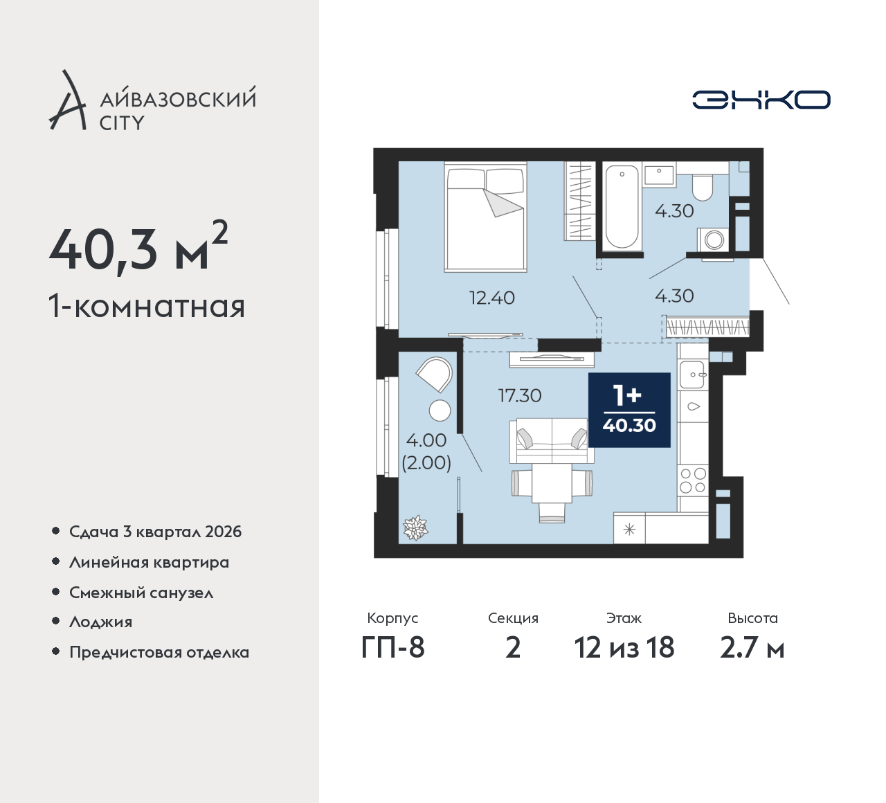 Однокомнатная квартира с предчистовой отделкой в ЖК "Айвазовский City" на 12 этаже. Общая площадь: 40.3 кв.м., жилая: 12.4 кв.м., площадь просторной кухни-столовой: 17.3 кв.м. Все окна выходят на одну сторону. В квартире одна лоджия, один совмещенный санузел. Высота потолков 2.7 м. Дом монолитный, многоподъездный, переменной этажности, от 14 до 24 этажей. Квартира находится во 2-й секции высотой 18 этажей в корпусе ГП-8. На этаже 5 квартир. В подъезде 1 пассажирский и 1 грузовой лифт. Окончание строительства - 3 квартал 2026 года. Оформление сделки по договору долевого участия. Новый жилой район располагается в живописном месте на берегу Туры в центральной части города. Принципиально новое пространство для жизни в центре современного города для тех, чьи мечты сбываются, кто нацелен на постоянный рост, перемены к лучшему для себя и своих близких. Каждая деталь Айвазовский City вдохновляет и заряжает на новые свершения: авторская архитектура, сбалансированная продуманная инфраструктура, дизайнерские дворы со спортивными и детскими площадками, парковые зоны с фонтанами, водный канал, украшающий центральный прогулочный маршрут района и многое другое. В 2019 года проект стал лауреатом престижной премии Urban Awards 2019 в номинации «Лучший строящийся региональный жилой комплекс бизнес-класса». Главная особенность Айвазовский City - соседство разных архитектурных школ в рамках одного дома. Изысканная классика, выразительная эклектика и оригинальный модерн - жить в одном из таких домов настоящий повод для гордости. Айвазовский City это идеальное сочетание комфорта, технологий и развитой инфраструктуры. Вход в подъезд возможен с улицы и со двора. Отправляясь на работу или за покупками, жители могут выйти с внешней стороны дома, а для прогулки с ребенком – со стороны двора. Экологически чистые материалы и энергосберегающие технологии, качественное освещение общественных зон, видеонаблюдение по всей территории жилого района (в том числе в подъездах, лифтах и в подземном паркинге), закрытые дворы с доступом только для жителей Айвазовский City. Часть домов в Айвазовский City будут оснащены подземным паркингом. Востребованный в нашем климатическом поясе формат хранения автомобилей защитит собственность владельца в любое время года. Аккредитация в банках: «Сбербанк России», ОАО «Альфа-Банк», ПАО Банк «ВТБ», ПАО «Газпромбанк», ПАО «Промсвязьбанк» и других. (AQID02483700)