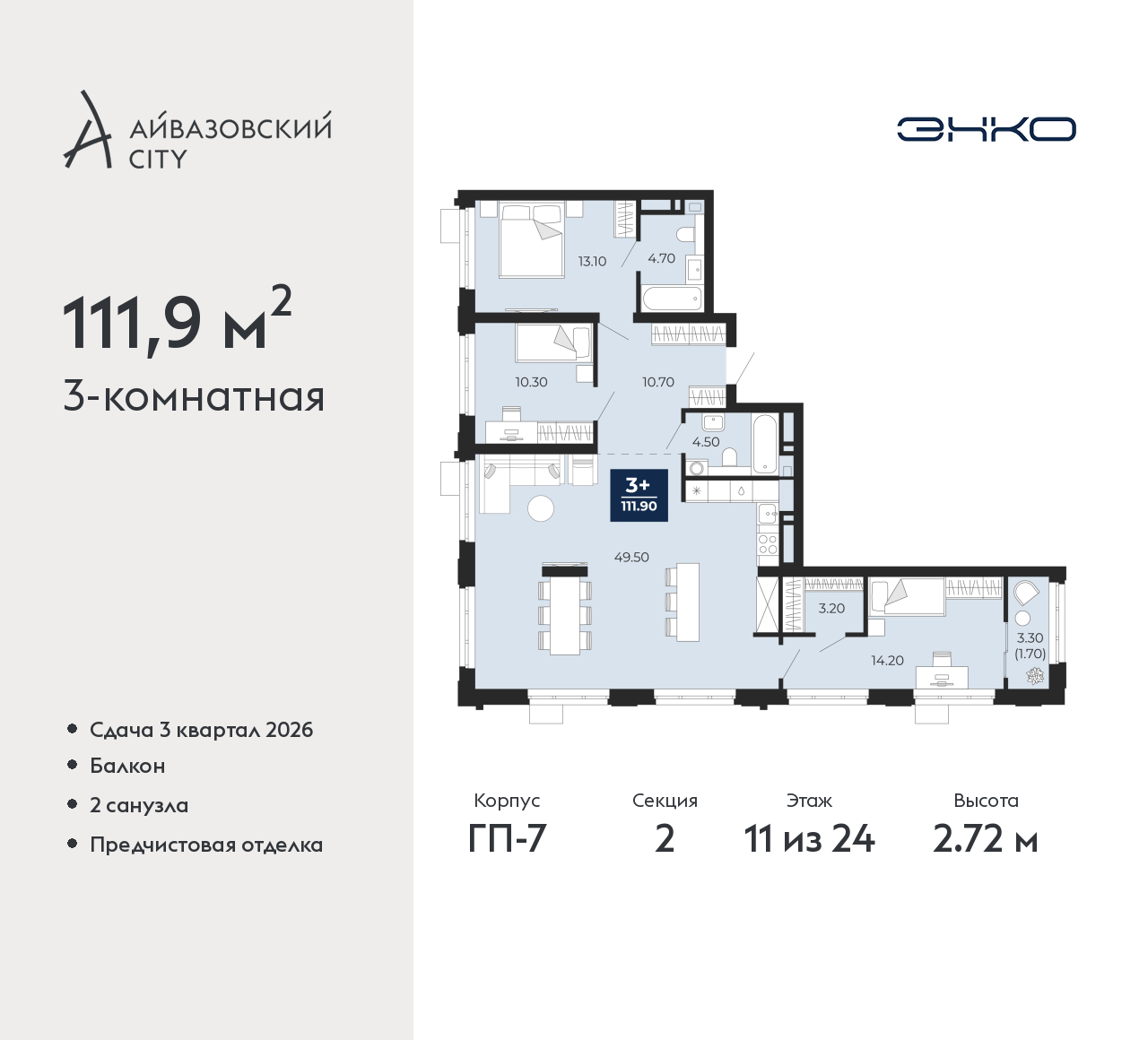 3-комн. квартира с предчистовой отделкой в ЖК "Айвазовский City" на 11 этаже. Общая площадь: 111.9 кв.м., жилая: 37.6 кв.м., площадь просторной кухни-столовой: 49.5 кв.м. Квартира без проходных комнат, окна выходят нa три cтopoны дома. В квартире один балкон, два совмещенных санузла. Высота потолков 2.72 м. Дом монолитный, многоподъездный, переменной этажности, от 9 до 24 этажей. Квартира находится во 2-й секции высотой 24 этажа в корпусе ГП-7. На этаже 7 квартир. В подъезде 1 пассажирский и 2 грузовых лифта. Окончание строительства - 3 квартал 2026 года. Оформление сделки по договору долевого участия. Новый жилой район располагается в живописном месте на берегу Туры в центральной части города. Принципиально новое пространство для жизни в центре современного города для тех, чьи мечты сбываются, кто нацелен на постоянный рост, перемены к лучшему для себя и своих близких. Каждая деталь Айвазовский City вдохновляет и заряжает на новые свершения: авторская архитектура, сбалансированная продуманная инфраструктура, дизайнерские дворы со спортивными и детскими площадками, парковые зоны с фонтанами, водный канал, украшающий центральный прогулочный маршрут района и многое другое. В 2019 года проект стал лауреатом престижной премии Urban Awards 2019 в номинации «Лучший строящийся региональный жилой комплекс бизнес-класса». Главная особенность Айвазовский City - соседство разных архитектурных школ в рамках одного дома. Изысканная классика, выразительная эклектика и оригинальный модерн - жить в одном из таких домов настоящий повод для гордости. Айвазовский City это идеальное сочетание комфорта, технологий и развитой инфраструктуры. Вход в подъезд возможен с улицы и со двора. Отправляясь на работу или за покупками, жители могут выйти с внешней стороны дома, а для прогулки с ребенком – со стороны двора. Экологически чистые материалы и энергосберегающие технологии, качественное освещение общественных зон, видеонаблюдение по всей территории жилого района (в том числе в подъездах, лифтах и в подземном паркинге), закрытые дворы с доступом только для жителей Айвазовский City. Часть домов в Айвазовский City будут оснащены подземным паркингом. Востребованный в нашем климатическом поясе формат хранения автомобилей защитит собственность владельца в любое время года. Аккредитация в банках: «Сбербанк России», ОАО «Альфа-Банк», ПАО Банк «ВТБ», ПАО «Газпромбанк», ПАО АКБ «Абсолют Банк» и других. (AQID02487928)