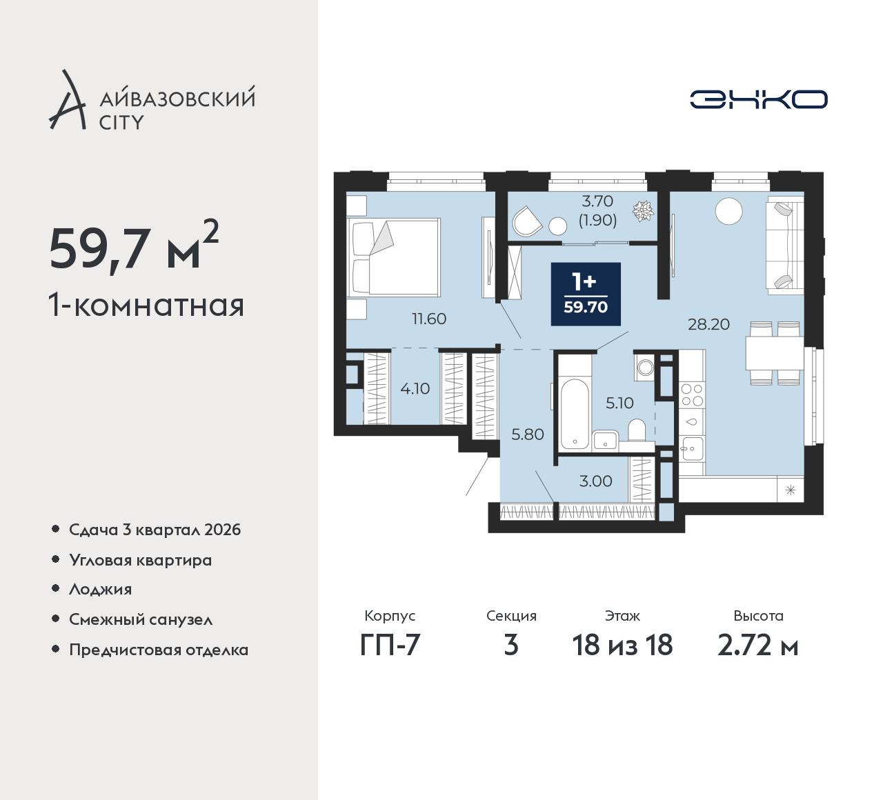 Просторная однокомнатная квартира с предчистовой отделкой в ЖК "Айвазовский City" на 18 этаже. Общая площадь: 59.7 кв.м., жилая: 11.6 кв.м., площадь просторной кухни-столовой: 28.2 кв.м. Квартира угловая, очень светлая, естественная вентиляция при открытии окон. В квартире одна лоджия, один совмещенный санузел. Высота потолков 2.72 м. Дом монолитный, многоподъездный, переменной этажности, от 9 до 24 этажей. Квартира находится в 3-й секции высотой 18 этажей в корпусе ГП-7. На этаже 5 квартир. В подъезде 1 пассажирский и 2 грузовых лифта. Окончание строительства - 3 квартал 2026 года. Оформление сделки по договору долевого участия. Новый жилой район располагается в живописном месте на берегу Туры в центральной части города. Принципиально новое пространство для жизни в центре современного города для тех, чьи мечты сбываются, кто нацелен на постоянный рост, перемены к лучшему для себя и своих близких. Каждая деталь Айвазовский City вдохновляет и заряжает на новые свершения: авторская архитектура, сбалансированная продуманная инфраструктура, дизайнерские дворы со спортивными и детскими площадками, парковые зоны с фонтанами, водный канал, украшающий центральный прогулочный маршрут района и многое другое. В 2019 года проект стал лауреатом престижной премии Urban Awards 2019 в номинации «Лучший строящийся региональный жилой комплекс бизнес-класса». Главная особенность Айвазовский City - соседство разных архитектурных школ в рамках одного дома. Изысканная классика, выразительная эклектика и оригинальный модерн - жить в одном из таких домов настоящий повод для гордости. Айвазовский City это идеальное сочетание комфорта, технологий и развитой инфраструктуры. Вход в подъезд возможен с улицы и со двора. Отправляясь на работу или за покупками, жители могут выйти с внешней стороны дома, а для прогулки с ребенком – со стороны двора. Экологически чистые материалы и энергосберегающие технологии, качественное освещение общественных зон, видеонаблюдение по всей территории жилого района (в том числе в подъездах, лифтах и в подземном паркинге), закрытые дворы с доступом только для жителей Айвазовский City. Часть домов в Айвазовский City будут оснащены подземным паркингом. Востребованный в нашем климатическом поясе формат хранения автомобилей защитит собственность владельца в любое время года. Аккредитация в банках: ПАО Банк «ВТБ», ОАО «Альфа-Банк», ПАО «Газпромбанк», «Сбербанк России», АО "ДОМ.РФ" и других. (AQID02487963)
