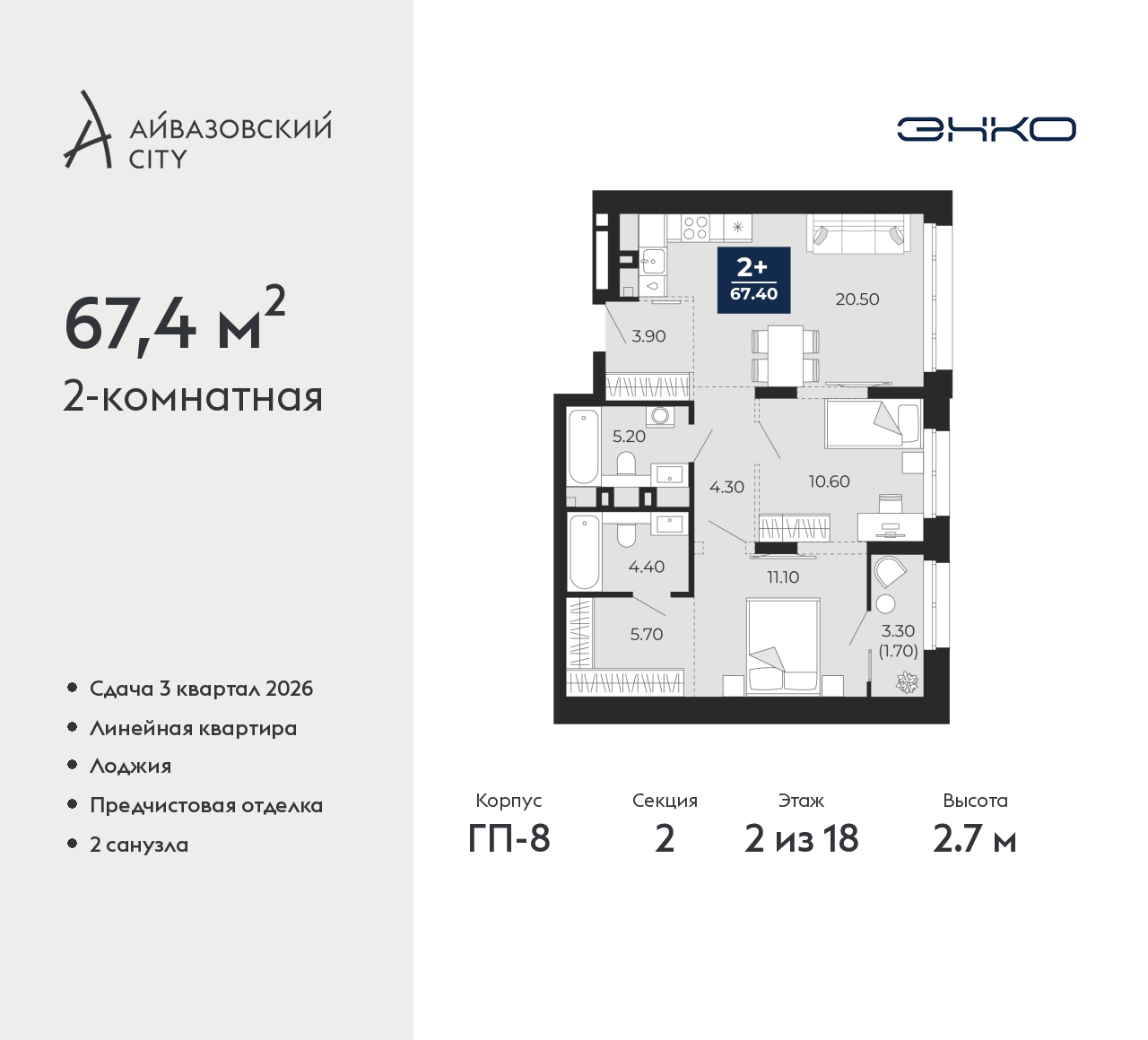 Продается двухкомнатная квартира от застройщика с предчистовой отделкой в ЖК "Айвазовский City" на 2 этаже. Общая площадь: 67.4 кв.м., жилая: 21.7 кв.м., площадь просторной кухни-столовой: 20.5 кв.м. Комнаты изолированные, все окна выходят на одну сторону. В квартире одна лоджия, два совмещенных санузла. Высота потолков 2.7 м. Дом монолитный, многоподъездный, переменной этажности, от 14 до 24 этажей. Квартира находится во 2-й секции высотой 18 этажей в корпусе ГП-8. На этаже 5 квартир. В подъезде 1 пассажирский и 1 грузовой лифт. Окончание строительства - 3 квартал 2026 года. Оформление сделки по договору долевого участия. Новый жилой район располагается в живописном месте на берегу Туры в центральной части города. Принципиально новое пространство для жизни в центре современного города для тех, чьи мечты сбываются, кто нацелен на постоянный рост, перемены к лучшему для себя и своих близких. Каждая деталь Айвазовский City вдохновляет и заряжает на новые свершения: авторская архитектура, сбалансированная продуманная инфраструктура, дизайнерские дворы со спортивными и детскими площадками, парковые зоны с фонтанами, водный канал, украшающий центральный прогулочный маршрут района и многое другое. В 2019 года проект стал лауреатом престижной премии Urban Awards 2019 в номинации «Лучший строящийся региональный жилой комплекс бизнес-класса». Главная особенность Айвазовский City - соседство разных архитектурных школ в рамках одного дома. Изысканная классика, выразительная эклектика и оригинальный модерн - жить в одном из таких домов настоящий повод для гордости. Айвазовский City это идеальное сочетание комфорта, технологий и развитой инфраструктуры. Вход в подъезд возможен с улицы и со двора. Отправляясь на работу или за покупками, жители могут выйти с внешней стороны дома, а для прогулки с ребенком – со стороны двора. Экологически чистые материалы и энергосберегающие технологии, качественное освещение общественных зон, видеонаблюдение по всей территории жилого района (в том числе в подъездах, лифтах и в подземном паркинге), закрытые дворы с доступом только для жителей Айвазовский City. Часть домов в Айвазовский City будут оснащены подземным паркингом. Востребованный в нашем климатическом поясе формат хранения автомобилей защитит собственность владельца в любое время года. Аккредитация в банках: «Сбербанк России», ПАО Банк «ВТБ», ОАО «Альфа-Банк», ПАО «Газпромбанк», АО "ДОМ.РФ" и других. (AQID02488012)