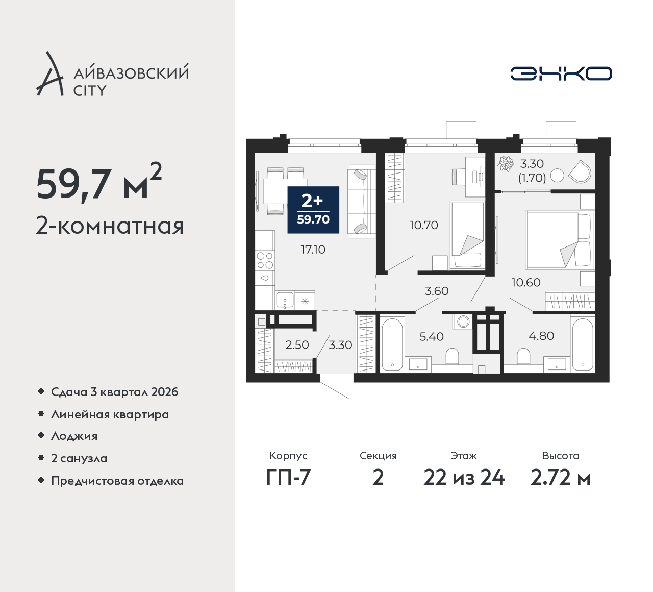 2-комн. квартира с предчистовой отделкой в ЖК "Айвазовский City" на 22 этаже. Общая площадь: 59.7 кв.м., жилая: 21.3 кв.м., площадь просторной кухни-столовой: 17.1 кв.м. Комнаты изолированные, все окна выходят на одну сторону. В квартире одна лоджия, два совмещенных санузла. Высота потолков 2.72 м. Дом монолитный, многоподъездный, переменной этажности, от 9 до 24 этажей. Квартира находится во 2-й секции высотой 24 этажа в корпусе ГП-7. На этаже 7 квартир. В подъезде 1 пассажирский и 2 грузовых лифта. Окончание строительства - 3 квартал 2026 года. Оформление сделки по договору долевого участия. Новый жилой район располагается в живописном месте на берегу Туры в центральной части города. Принципиально новое пространство для жизни в центре современного города для тех, чьи мечты сбываются, кто нацелен на постоянный рост, перемены к лучшему для себя и своих близких. Каждая деталь Айвазовский City вдохновляет и заряжает на новые свершения: авторская архитектура, сбалансированная продуманная инфраструктура, дизайнерские дворы со спортивными и детскими площадками, парковые зоны с фонтанами, водный канал, украшающий центральный прогулочный маршрут района и многое другое. В 2019 года проект стал лауреатом престижной премии Urban Awards 2019 в номинации «Лучший строящийся региональный жилой комплекс бизнес-класса». Главная особенность Айвазовский City - соседство разных архитектурных школ в рамках одного дома. Изысканная классика, выразительная эклектика и оригинальный модерн - жить в одном из таких домов настоящий повод для гордости. Айвазовский City это идеальное сочетание комфорта, технологий и развитой инфраструктуры. Вход в подъезд возможен с улицы и со двора. Отправляясь на работу или за покупками, жители могут выйти с внешней стороны дома, а для прогулки с ребенком – со стороны двора. Экологически чистые материалы и энергосберегающие технологии, качественное освещение общественных зон, видеонаблюдение по всей территории жилого района (в том числе в подъездах, лифтах и в подземном паркинге), закрытые дворы с доступом только для жителей Айвазовский City. Часть домов в Айвазовский City будут оснащены подземным паркингом. Востребованный в нашем климатическом поясе формат хранения автомобилей защитит собственность владельца в любое время года. Аккредитация в банках: ОАО «Альфа-Банк», «Сбербанк России», ПАО Банк «ВТБ», ПАО «Газпромбанк», ПАО «Промсвязьбанк» и других. (AQID02497749)