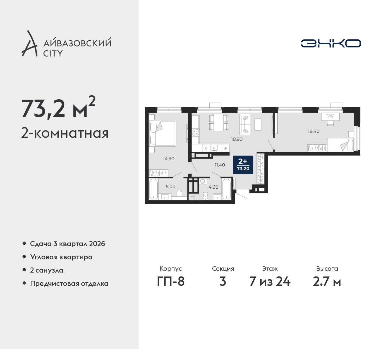Продается 2-комн. квартира с предчистовой отделкой в ЖК "Айвазовский City" на 7 этаже. Общая площадь: 73.2 кв.м., жилая: 32.1 кв.м., площадь просторной кухни-столовой: 21.7 кв.м. Угловая квартира, идеально подойдет любителям тишины и панорамных видов. В квартире два совмещенных санузла. Высота потолков 2.7 м. Дом монолитный, многоподъездный, переменной этажности, от 14 до 24 этажей. Квартира находится в 3-й секции высотой 24 этажа в корпусе ГП-8. На этаже 7 квартир. В подъезде 1 пассажирский и 1 грузовой лифт. Окончание строительства - 3 квартал 2026 года. Оформление сделки по договору долевого участия. Новый жилой район располагается в живописном месте на берегу Туры в центральной части города. Принципиально новое пространство для жизни в центре современного города для тех, чьи мечты сбываются, кто нацелен на постоянный рост, перемены к лучшему для себя и своих близких. Каждая деталь Айвазовский City вдохновляет и заряжает на новые свершения: авторская архитектура, сбалансированная продуманная инфраструктура, дизайнерские дворы со спортивными и детскими площадками, парковые зоны с фонтанами, водный канал, украшающий центральный прогулочный маршрут района и многое другое. В 2019 года проект стал лауреатом престижной премии Urban Awards 2019 в номинации «Лучший строящийся региональный жилой комплекс бизнес-класса». Главная особенность Айвазовский City - соседство разных архитектурных школ в рамках одного дома. Изысканная классика, выразительная эклектика и оригинальный модерн - жить в одном из таких домов настоящий повод для гордости. Айвазовский City это идеальное сочетание комфорта, технологий и развитой инфраструктуры. Вход в подъезд возможен с улицы и со двора. Отправляясь на работу или за покупками, жители могут выйти с внешней стороны дома, а для прогулки с ребенком – со стороны двора. Экологически чистые материалы и энергосберегающие технологии, качественное освещение общественных зон, видеонаблюдение по всей территории жилого района (в том числе в подъездах, лифтах и в подземном паркинге), закрытые дворы с доступом только для жителей Айвазовский City. Часть домов в Айвазовский City будут оснащены подземным паркингом. Востребованный в нашем климатическом поясе формат хранения автомобилей защитит собственность владельца в любое время года. Аккредитация в банках: ПАО «Газпромбанк», «Сбербанк России», ПАО Банк «ВТБ», ОАО «Альфа-Банк», ПАО «Совкомбанк» и других. (AQID02514843)