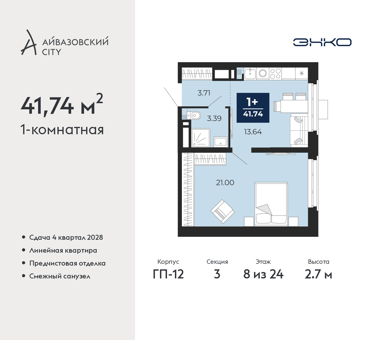 Просторная 1-комн. квартира с предчистовой отделкой в ЖК "Айвазовский City" на 8 этаже. Общая площадь: 41.74 кв.м., жилая: 21 кв.м., площадь просторной кухни-столовой: 13.64 кв.м. Все окна выходят на одну сторону. В квартире один совмещенный санузел. Высота потолков 2.7 м. Дом монолитный, многоподъездный, высотой 24 этажа. Квартира находится в 3-й секции в корпусе ГП-12. На этаже 6 квартир. В подъезде 1 пассажирский и 1 грузовой лифт. Окончание строительства - 4 квартал 2028 года. Оформление сделки по договору долевого участия. Новый жилой район располагается в живописном месте на берегу Туры в центральной части города. Принципиально новое пространство для жизни в центре современного города для тех, чьи мечты сбываются, кто нацелен на постоянный рост, перемены к лучшему для себя и своих близких. Каждая деталь Айвазовский City вдохновляет и заряжает на новые свершения: авторская архитектура, сбалансированная продуманная инфраструктура, дизайнерские дворы со спортивными и детскими площадками, парковые зоны с фонтанами, водный канал, украшающий центральный прогулочный маршрут района и многое другое. В 2019 года проект стал лауреатом престижной премии Urban Awards 2019 в номинации «Лучший строящийся региональный жилой комплекс бизнес-класса». Главная особенность Айвазовский City - соседство разных архитектурных школ в рамках одного дома. Изысканная классика, выразительная эклектика и оригинальный модерн - жить в одном из таких домов настоящий повод для гордости. Айвазовский City это идеальное сочетание комфорта, технологий и развитой инфраструктуры. Вход в подъезд возможен с улицы и со двора. Отправляясь на работу или за покупками, жители могут выйти с внешней стороны дома, а для прогулки с ребенком – со стороны двора. Экологически чистые материалы и энергосберегающие технологии, качественное освещение общественных зон, видеонаблюдение по всей территории жилого района (в том числе в подъездах, лифтах и в подземном паркинге), закрытые дворы с доступом только для жителей Айвазовский City. Часть домов в Айвазовский City будут оснащены подземным паркингом. Востребованный в нашем климатическом поясе формат хранения автомобилей защитит собственность владельца в любое время года. Аккредитация в банках: ПАО Банк «ВТБ», ОАО «Альфа-Банк», ПАО «Газпромбанк», «Сбербанк России», АО "ДОМ.РФ" и других. (AQID02525539)