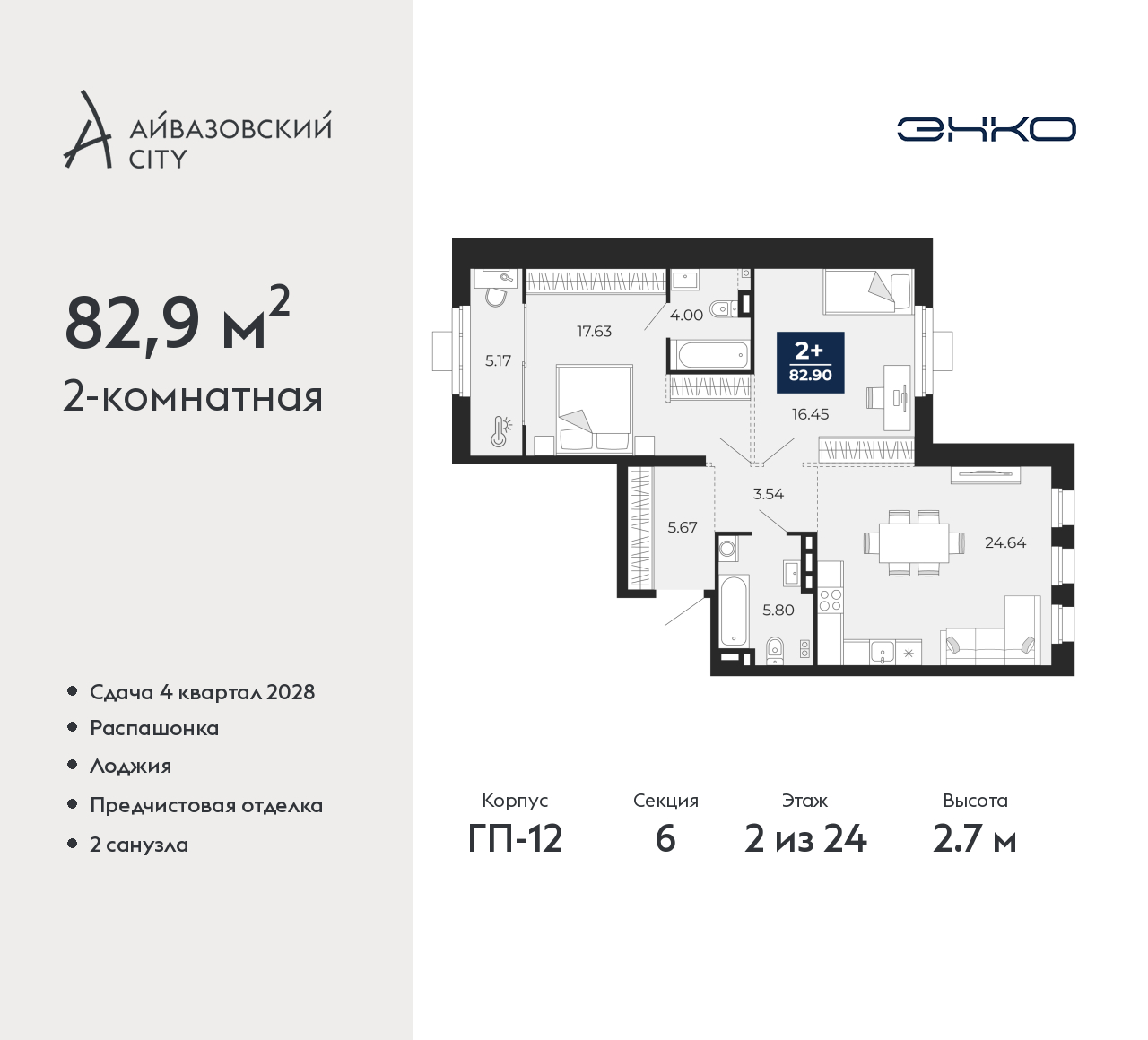 Продается 2-комн. квартира с предчистовой отделкой в ЖК "Айвазовский City" на 2 этаже. Общая площадь: 82.9 кв.м., жилая: 34.08 кв.м., площадь просторной кухни-столовой: 24.64 кв.м. Квартира - распашонка, без проходных комнат, окна выходят на paзные стороны дома. В квартире одна лоджия, два совмещенных санузла. Высота потолков 2.7 м. Дом монолитный, многоподъездный, высотой 24 этажа. Квартира находится в 6-й секции в корпусе ГП-12. На этаже 5 квартир. В подъезде 1 пассажирский и 1 грузовой лифт. Окончание строительства - 4 квартал 2028 года. Оформление сделки по договору долевого участия. Новый жилой район располагается в живописном месте на берегу Туры в центральной части города. Принципиально новое пространство для жизни в центре современного города для тех, чьи мечты сбываются, кто нацелен на постоянный рост, перемены к лучшему для себя и своих близких. Каждая деталь Айвазовский City вдохновляет и заряжает на новые свершения: авторская архитектура, сбалансированная продуманная инфраструктура, дизайнерские дворы со спортивными и детскими площадками, парковые зоны с фонтанами, водный канал, украшающий центральный прогулочный маршрут района и многое другое. В 2019 года проект стал лауреатом престижной премии Urban Awards 2019 в номинации «Лучший строящийся региональный жилой комплекс бизнес-класса». Главная особенность Айвазовский City - соседство разных архитектурных школ в рамках одного дома. Изысканная классика, выразительная эклектика и оригинальный модерн - жить в одном из таких домов настоящий повод для гордости. Айвазовский City это идеальное сочетание комфорта, технологий и развитой инфраструктуры. Вход в подъезд возможен с улицы и со двора. Отправляясь на работу или за покупками, жители могут выйти с внешней стороны дома, а для прогулки с ребенком – со стороны двора. Экологически чистые материалы и энергосберегающие технологии, качественное освещение общественных зон, видеонаблюдение по всей территории жилого района (в том числе в подъездах, лифтах и в подземном паркинге), закрытые дворы с доступом только для жителей Айвазовский City. Часть домов в Айвазовский City будут оснащены подземным паркингом. Востребованный в нашем климатическом поясе формат хранения автомобилей защитит собственность владельца в любое время года. Аккредитация в банках: ПАО «Газпромбанк», ОАО «Альфа-Банк», «Сбербанк России», ПАО Банк «ВТБ», ПАО Банк «ФК Открытие» и других. (AQID02525742)