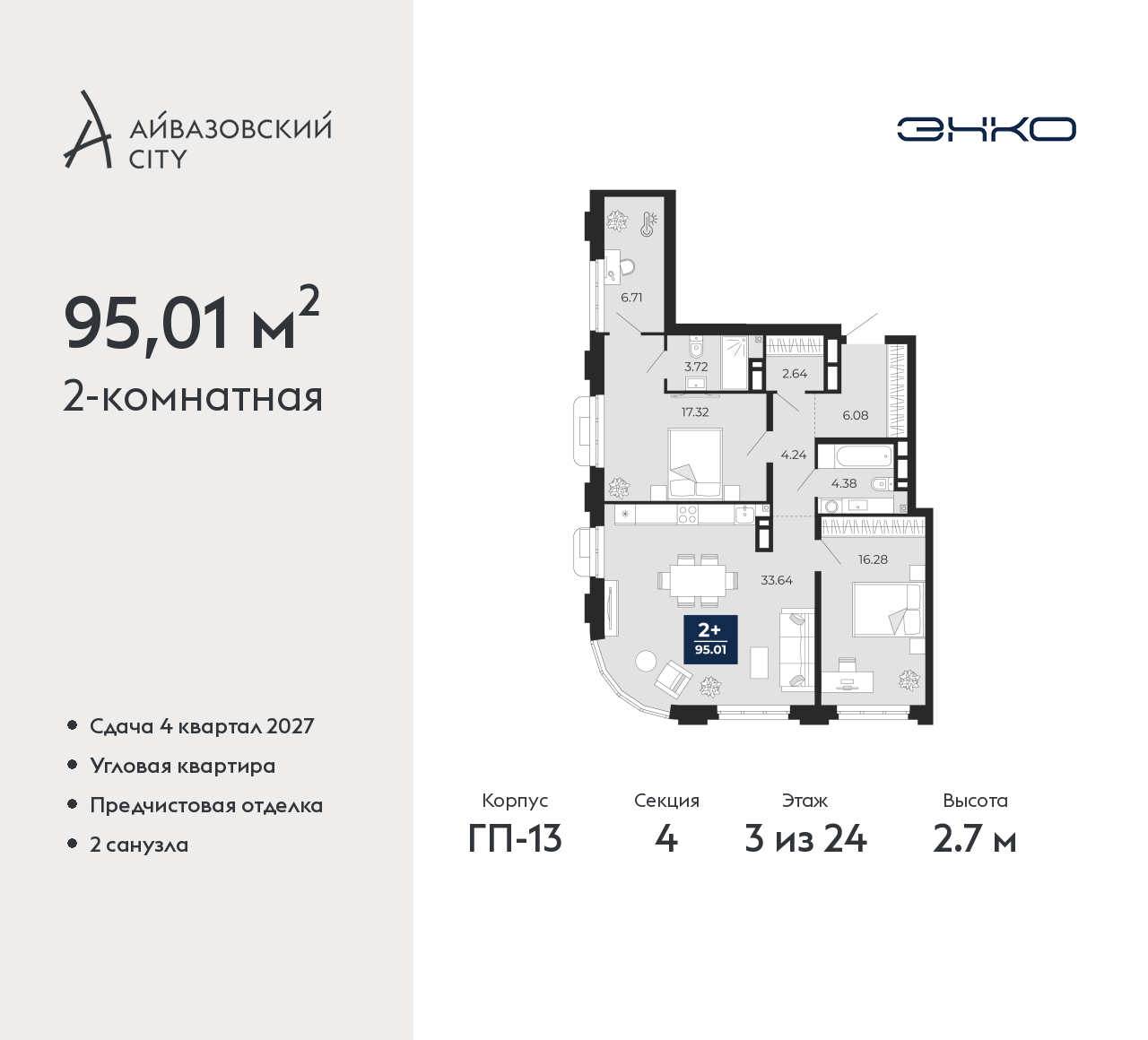 Просторная 2-комн. квартира с предчистовой отделкой в ЖК "Айвазовский City" на 3 этаже. Общая площадь: 95.01 кв.м., жилая: 33.6 кв.м., площадь просторной кухни-столовой: 33.64 кв.м. Квартира угловая, очень светлая, естественная вентиляция при открытии окон. В квартире два совмещенных санузла. Высота потолков 2.7 м. Дом монолитный, многоподъездный, высотой 24 этажа. Квартира находится в 4-й секции в корпусе ГП-13. На этаже 6 квартир. В подъезде 1 пассажирский и 1 грузовой лифт. Окончание строительства - 4 квартал 2027 года. Оформление сделки по договору долевого участия. Новый жилой район располагается в живописном месте на берегу Туры в центральной части города. Принципиально новое пространство для жизни в центре современного города для тех, чьи мечты сбываются, кто нацелен на постоянный рост, перемены к лучшему для себя и своих близких. Каждая деталь Айвазовский City вдохновляет и заряжает на новые свершения: авторская архитектура, сбалансированная продуманная инфраструктура, дизайнерские дворы со спортивными и детскими площадками, парковые зоны с фонтанами, водный канал, украшающий центральный прогулочный маршрут района и многое другое. В 2019 года проект стал лауреатом престижной премии Urban Awards 2019 в номинации «Лучший строящийся региональный жилой комплекс бизнес-класса». Главная особенность Айвазовский City - соседство разных архитектурных школ в рамках одного дома. Изысканная классика, выразительная эклектика и оригинальный модерн - жить в одном из таких домов настоящий повод для гордости. Айвазовский City это идеальное сочетание комфорта, технологий и развитой инфраструктуры. Вход в подъезд возможен с улицы и со двора. Отправляясь на работу или за покупками, жители могут выйти с внешней стороны дома, а для прогулки с ребенком – со стороны двора. Экологически чистые материалы и энергосберегающие технологии, качественное освещение общественных зон, видеонаблюдение по всей территории жилого района (в том числе в подъездах, лифтах и в подземном паркинге), закрытые дворы с доступом только для жителей Айвазовский City. Часть домов в Айвазовский City будут оснащены подземным паркингом. Востребованный в нашем климатическом поясе формат хранения автомобилей защитит собственность владельца в любое время года. Аккредитация в банках: ПАО Банк «ВТБ», ПАО «Газпромбанк», ОАО «Альфа-Банк», «Сбербанк России», ПАО «Совкомбанк» и других. (AQID02525763)