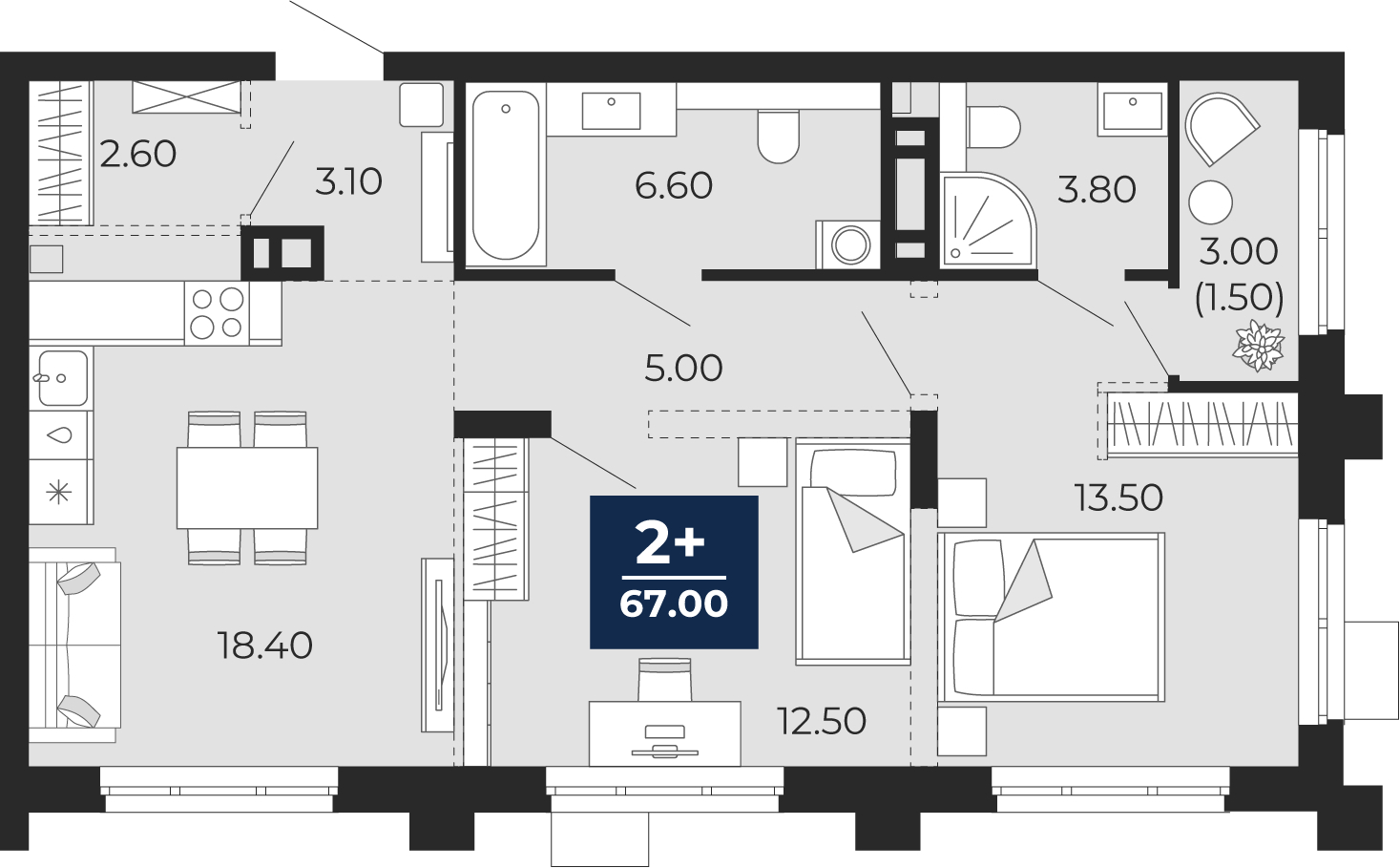 Просторная двухкомнатная квартира с предчистовой отделкой в ЖК "Айвазовский City" на 8 этаже. Общая площадь: 67 кв.м., жилая: 26 кв.м., площадь просторной кухни-столовой: 18.4 кв.м. Квартира угловая, очень светлая, естественная вентиляция при открытии окон. В квартире одна лоджия, два совмещенных санузла. Высота потолков 2.7 м. Дом монолитный, многоподъездный, переменной этажности, от 14 до 24 этажей. Квартира находится в 1-й секции высотой 20 этажей в корпусе ГП-8. На этаже 6 квартир. В подъезде 1 пассажирский и 1 грузовой лифт. Окончание строительства - 3 квартал 2026 года. Оформление сделки по договору долевого участия. Новый жилой район располагается в живописном месте на берегу Туры в центральной части города. Принципиально новое пространство для жизни в центре современного города для тех, чьи мечты сбываются, кто нацелен на постоянный рост, перемены к лучшему для себя и своих близких. Каждая деталь Айвазовский City вдохновляет и заряжает на новые свершения: авторская архитектура, сбалансированная продуманная инфраструктура, дизайнерские дворы со спортивными и детскими площадками, парковые зоны с фонтанами, водный канал, украшающий центральный прогулочный маршрут района и многое другое. В 2019 года проект стал лауреатом престижной премии Urban Awards 2019 в номинации «Лучший строящийся региональный жилой комплекс бизнес-класса». Главная особенность Айвазовский City - соседство разных архитектурных школ в рамках одного дома. Изысканная классика, выразительная эклектика и оригинальный модерн - жить в одном из таких домов настоящий повод для гордости. Айвазовский City это идеальное сочетание комфорта, технологий и развитой инфраструктуры. Вход в подъезд возможен с улицы и со двора. Отправляясь на работу или за покупками, жители могут выйти с внешней стороны дома, а для прогулки с ребенком – со стороны двора. Экологически чистые материалы и энергосберегающие технологии, качественное освещение общественных зон, видеонаблюдение по всей территории жилого района (в том числе в подъездах, лифтах и в подземном паркинге), закрытые дворы с доступом только для жителей Айвазовский City. Часть домов в Айвазовский City будут оснащены подземным паркингом. Востребованный в нашем климатическом поясе формат хранения автомобилей защитит собственность владельца в любое время года. Аккредитация в банках: ПАО Банк «ВТБ», ОАО «Альфа-Банк», ПАО «Газпромбанк», «Сбербанк России», ПАО «Совкомбанк» и других. (AQID02483687)