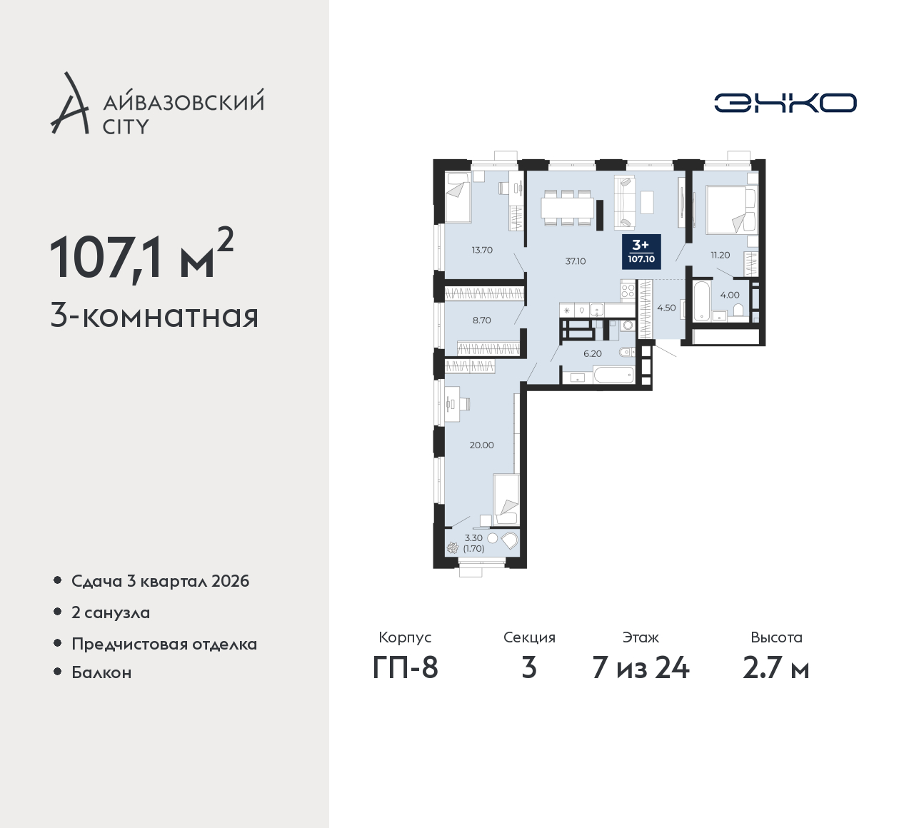 Квартира 3-комн., 107 м2, 7/24 этаж,