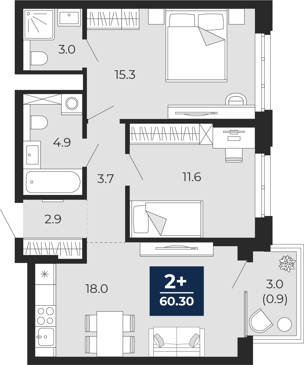 2-комн. квартира от застройщика с предчистовой отделкой в ЖК "Мириады" на 11 этаже. Общая площадь: 60.3 кв.м., жилая: 26.9 кв.м., площадь просторной кухни-столовой: 18 кв.м. Комнаты изолированные, все окна выходят на одну сторону. В квартире один балкон, два совмещенных санузла. Высота потолков 2.7 м. Дом монолитный, двухподъездный, переменной этажности, от 14 до 18 этажей. Квартира находится во 2-й секции высотой 14 этажей в корпусе ГП-72.104. На этаже 8 квартир. В подъезде 1 пассажирский и 1 грузовой лифт. Окончание строительства - 4 квартал 2025 года. Оформление сделки по договору долевого участия. Вселенная бесконечных историй. Ранее невиданный Тюмени масштаб: территория 240 гектаров и 1 650 000 м² застройки. Мириады – это город масштабных перемен и больших возможностей. Город зеленых рощ и зеркальных озер. Город для работы, учебы и развлечений. Город для детей и их родителей. Город для всех и каждого. Проект расположен в районе Мыс рядом с ТРЦ «Тюмень Сити Молл» в границах улицы Тимофея Чаркова, Тобольского тракта и объездной дороги. Срок полного освоения территории - до 2034 года. (AQID02522719)
