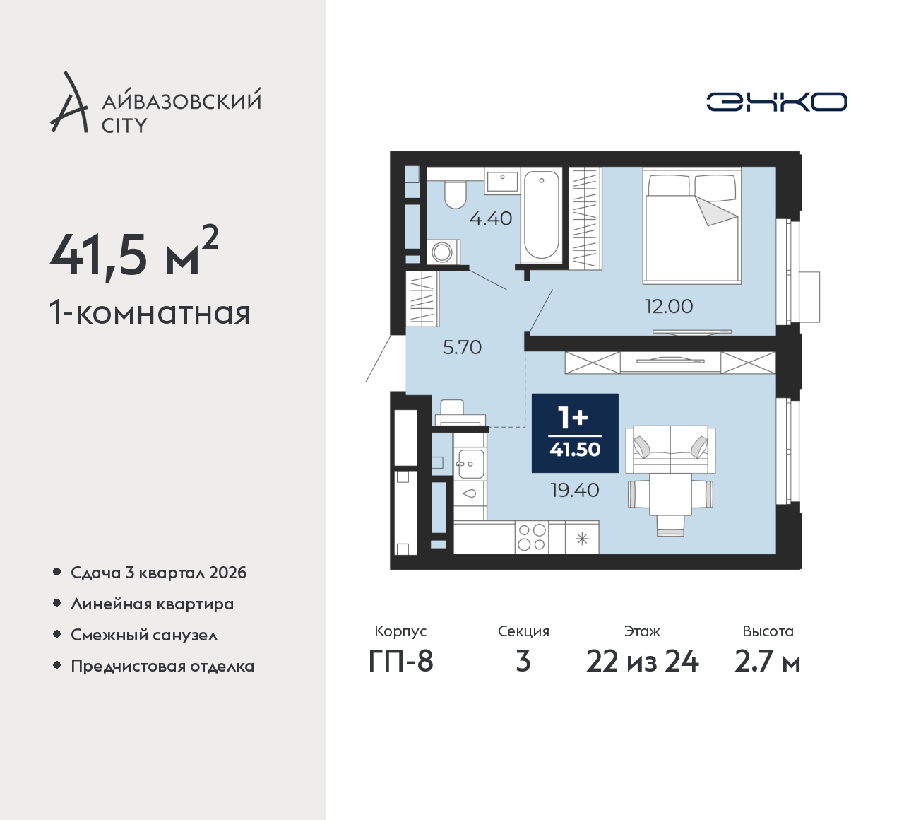 Однокомнатная квартира с предчистовой отделкой в ЖК "Айвазовский City" на 22 этаже. Общая площадь: 41.5 кв.м., жилая: 12 кв.м., площадь просторной кухни-столовой: 19.4 кв.м. Все окна выходят на одну сторону. В квартире один совмещенный санузел. Высота потолков 2.7 м. Дом монолитный, многоподъездный, переменной этажности, от 14 до 24 этажей. Квартира находится в 3-й секции высотой 24 этажа в корпусе ГП-8. На этаже 7 квартир. В подъезде 1 пассажирский и 1 грузовой лифт. Окончание строительства - 3 квартал 2026 года. Оформление сделки по договору долевого участия. Новый жилой район располагается в живописном месте на берегу Туры в центральной части города. Принципиально новое пространство для жизни в центре современного города для тех, чьи мечты сбываются, кто нацелен на постоянный рост, перемены к лучшему для себя и своих близких. Каждая деталь Айвазовский City вдохновляет и заряжает на новые свершения: авторская архитектура, сбалансированная продуманная инфраструктура, дизайнерские дворы со спортивными и детскими площадками, парковые зоны с фонтанами, водный канал, украшающий центральный прогулочный маршрут района и многое другое. В 2019 года проект стал лауреатом престижной премии Urban Awards 2019 в номинации «Лучший строящийся региональный жилой комплекс бизнес-класса». Главная особенность Айвазовский City - соседство разных архитектурных школ в рамках одного дома. Изысканная классика, выразительная эклектика и оригинальный модерн - жить в одном из таких домов настоящий повод для гордости. Айвазовский City это идеальное сочетание комфорта, технологий и развитой инфраструктуры. Вход в подъезд возможен с улицы и со двора. Отправляясь на работу или за покупками, жители могут выйти с внешней стороны дома, а для прогулки с ребенком – со стороны двора. Экологически чистые материалы и энергосберегающие технологии, качественное освещение общественных зон, видеонаблюдение по всей территории жилого района (в том числе в подъездах, лифтах и в подземном паркинге), закрытые дворы с доступом только для жителей Айвазовский City. Часть домов в Айвазовский City будут оснащены подземным паркингом. Востребованный в нашем климатическом поясе формат хранения автомобилей защитит собственность владельца в любое время года. Аккредитация в банках: ОАО «Альфа-Банк», ПАО «Газпромбанк», «Сбербанк России», ПАО Банк «ВТБ», ПАО АКБ «Абсолют Банк» и других. (AQID02459867)