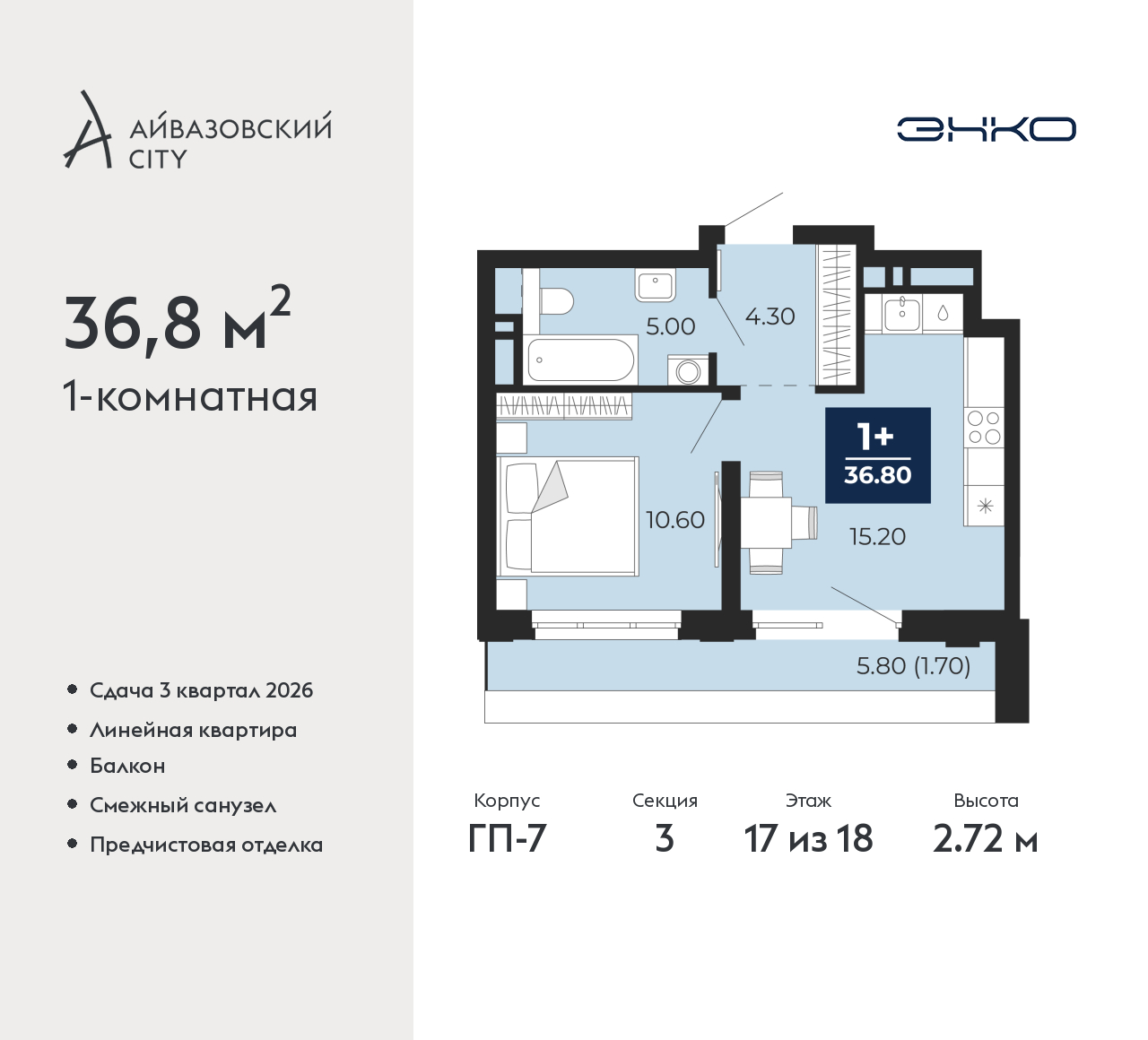 1-комн. квартира от застройщика с предчистовой отделкой в ЖК "Айвазовский City" на 17 этаже. Общая площадь: 36.8 кв.м., жилая: 10.6 кв.м., площадь просторной кухни-столовой: 15.2 кв.м. Все окна выходят на одну сторону. В квартире один балкон, один совмещенный санузел. Высота потолков 2.72 м. Дом монолитный, многоподъездный, переменной этажности, от 9 до 24 этажей. Квартира находится в 3-й секции высотой 18 этажей в корпусе ГП-7. На этаже 5 квартир. В подъезде 1 пассажирский и 2 грузовых лифта. Окончание строительства - 3 квартал 2026 года. Оформление сделки по договору долевого участия. Новый жилой район располагается в живописном месте на берегу Туры в центральной части города. Принципиально новое пространство для жизни в центре современного города для тех, чьи мечты сбываются, кто нацелен на постоянный рост, перемены к лучшему для себя и своих близких. Каждая деталь Айвазовский City вдохновляет и заряжает на новые свершения: авторская архитектура, сбалансированная продуманная инфраструктура, дизайнерские дворы со спортивными и детскими площадками, парковые зоны с фонтанами, водный канал, украшающий центральный прогулочный маршрут района и многое другое. В 2019 года проект стал лауреатом престижной премии Urban Awards 2019 в номинации «Лучший строящийся региональный жилой комплекс бизнес-класса». Главная особенность Айвазовский City - соседство разных архитектурных школ в рамках одного дома. Изысканная классика, выразительная эклектика и оригинальный модерн - жить в одном из таких домов настоящий повод для гордости. Айвазовский City это идеальное сочетание комфорта, технологий и развитой инфраструктуры. Вход в подъезд возможен с улицы и со двора. Отправляясь на работу или за покупками, жители могут выйти с внешней стороны дома, а для прогулки с ребенком – со стороны двора. Экологически чистые материалы и энергосберегающие технологии, качественное освещение общественных зон, видеонаблюдение по всей территории жилого района (в том числе в подъездах, лифтах и в подземном паркинге), закрытые дворы с доступом только для жителей Айвазовский City. Часть домов в Айвазовский City будут оснащены подземным паркингом. Востребованный в нашем климатическом поясе формат хранения автомобилей защитит собственность владельца в любое время года. Аккредитация в банках: ПАО Банк «ВТБ», ПАО «Газпромбанк», ОАО «Альфа-Банк», «Сбербанк России», ПАО Банк «ФК Открытие» и других. (AQID02487965)