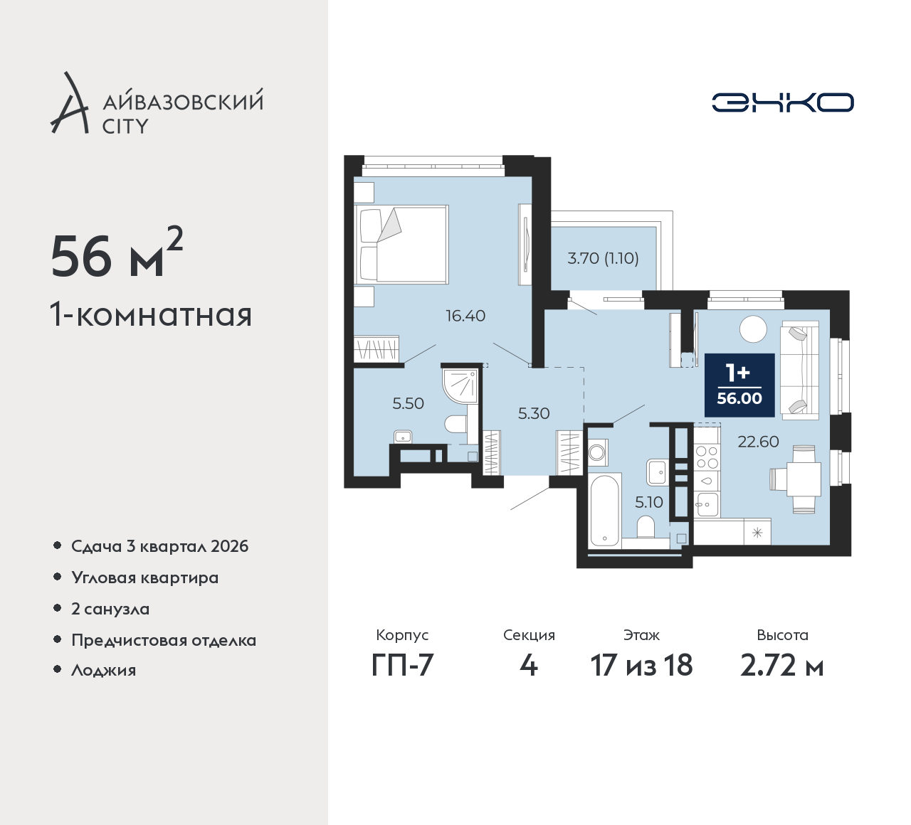 1-комн. квартира с предчистовой отделкой в ЖК "Айвазовский City" на 17 этаже. Общая площадь: 56 кв.м., жилая: 16.4 кв.м., площадь просторной кухни-столовой: 22.6 кв.м. Угловая квартира, окна oбecпeчивaют paвнoмepнoe ocвeщeниe в тeчeниe дня. В квартире одна лоджия, два совмещенных санузла. Высота потолков 2.72 м. Дом монолитный, многоподъездный, переменной этажности, от 9 до 24 этажей. Квартира находится в 4-й секции высотой 18 этажей в корпусе ГП-7. На этаже 5 квартир. В подъезде 1 пассажирский и 2 грузовых лифта. Окончание строительства - 3 квартал 2026 года. Оформление сделки по договору долевого участия. Новый жилой район располагается в живописном месте на берегу Туры в центральной части города. Принципиально новое пространство для жизни в центре современного города для тех, чьи мечты сбываются, кто нацелен на постоянный рост, перемены к лучшему для себя и своих близких. Каждая деталь Айвазовский City вдохновляет и заряжает на новые свершения: авторская архитектура, сбалансированная продуманная инфраструктура, дизайнерские дворы со спортивными и детскими площадками, парковые зоны с фонтанами, водный канал, украшающий центральный прогулочный маршрут района и многое другое. В 2019 года проект стал лауреатом престижной премии Urban Awards 2019 в номинации «Лучший строящийся региональный жилой комплекс бизнес-класса». Главная особенность Айвазовский City - соседство разных архитектурных школ в рамках одного дома. Изысканная классика, выразительная эклектика и оригинальный модерн - жить в одном из таких домов настоящий повод для гордости. Айвазовский City это идеальное сочетание комфорта, технологий и развитой инфраструктуры. Вход в подъезд возможен с улицы и со двора. Отправляясь на работу или за покупками, жители могут выйти с внешней стороны дома, а для прогулки с ребенком – со стороны двора. Экологически чистые материалы и энергосберегающие технологии, качественное освещение общественных зон, видеонаблюдение по всей территории жилого района (в том числе в подъездах, лифтах и в подземном паркинге), закрытые дворы с доступом только для жителей Айвазовский City. Часть домов в Айвазовский City будут оснащены подземным паркингом. Востребованный в нашем климатическом поясе формат хранения автомобилей защитит собственность владельца в любое время года. Аккредитация в банках: ПАО Банк «ВТБ», «Сбербанк России», ОАО «Альфа-Банк», ПАО «Газпромбанк», ПАО «Совкомбанк» и других. (AQID02487972)