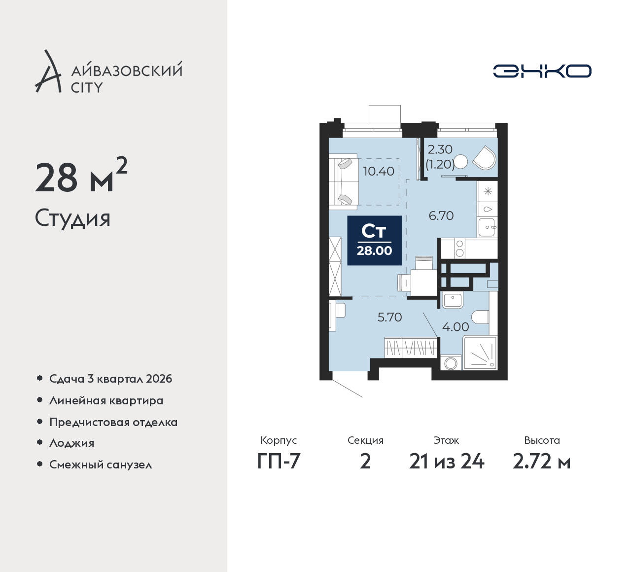 1-комн. квартира-студия с предчистовой отделкой в ЖК "Айвазовский City" на 21 этаже. Общая площадь: 28 кв.м., площадь гостиной 17.1 кв.м., из которых 6.7 кв.м. выделено под кухонную зону. Все окна выходят на одну сторону. В квартире одна лоджия, один совмещенный санузел. Высота потолков 2.72 м. Дом монолитный, многоподъездный, переменной этажности, от 9 до 24 этажей. Квартира находится во 2-й секции высотой 24 этажа в корпусе ГП-7. На этаже 7 квартир. В подъезде 1 пассажирский и 2 грузовых лифта. Окончание строительства - 3 квартал 2026 года. Оформление сделки по договору долевого участия. Новый жилой район располагается в живописном месте на берегу Туры в центральной части города. Принципиально новое пространство для жизни в центре современного города для тех, чьи мечты сбываются, кто нацелен на постоянный рост, перемены к лучшему для себя и своих близких. Каждая деталь Айвазовский City вдохновляет и заряжает на новые свершения: авторская архитектура, сбалансированная продуманная инфраструктура, дизайнерские дворы со спортивными и детскими площадками, парковые зоны с фонтанами, водный канал, украшающий центральный прогулочный маршрут района и многое другое. В 2019 года проект стал лауреатом престижной премии Urban Awards 2019 в номинации «Лучший строящийся региональный жилой комплекс бизнес-класса». Главная особенность Айвазовский City - соседство разных архитектурных школ в рамках одного дома. Изысканная классика, выразительная эклектика и оригинальный модерн - жить в одном из таких домов настоящий повод для гордости. Айвазовский City это идеальное сочетание комфорта, технологий и развитой инфраструктуры. Вход в подъезд возможен с улицы и со двора. Отправляясь на работу или за покупками, жители могут выйти с внешней стороны дома, а для прогулки с ребенком – со стороны двора. Экологически чистые материалы и энергосберегающие технологии, качественное освещение общественных зон, видеонаблюдение по всей территории жилого района (в том числе в подъездах, лифтах и в подземном паркинге), закрытые дворы с доступом только для жителей Айвазовский City. Часть домов в Айвазовский City будут оснащены подземным паркингом. Востребованный в нашем климатическом поясе формат хранения автомобилей защитит собственность владельца в любое время года. Аккредитация в банках: ОАО «Альфа-Банк», ПАО Банк «ВТБ», «Сбербанк России», ПАО «Газпромбанк», ПАО АКБ «Абсолют Банк» и других. (AQID02497751)