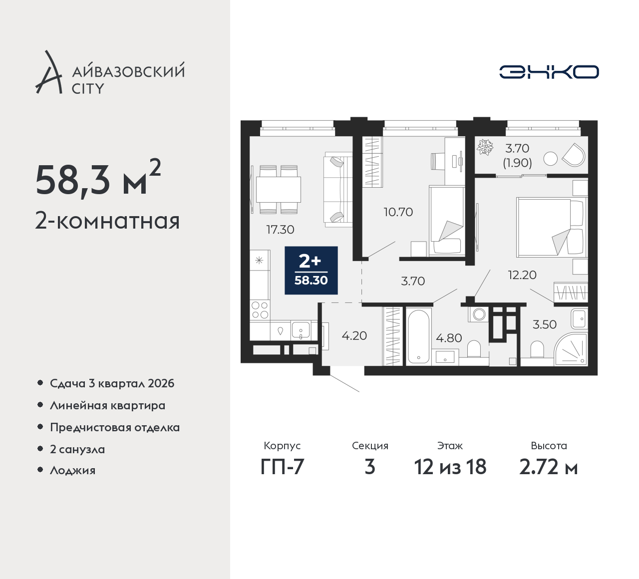- Общая площадь 58.3 м²