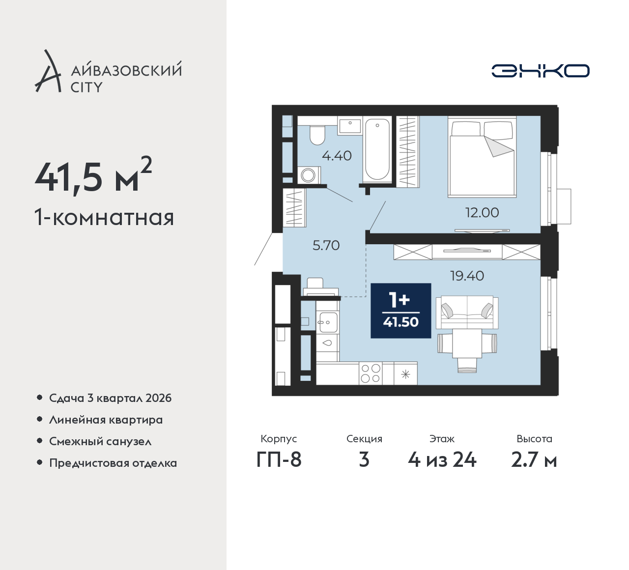 Продается однокомнатная квартира с предчистовой отделкой в ЖК "Айвазовский City" на 4 этаже. Общая площадь: 41.5 кв.м., жилая: 12 кв.м., площадь просторной кухни-столовой: 19.4 кв.м. Все окна выходят на одну сторону. В квартире один совмещенный санузел. Высота потолков 2.7 м. Дом монолитный, многоподъездный, переменной этажности, от 14 до 24 этажей. Квартира находится в 3-й секции высотой 24 этажа в корпусе ГП-8. На этаже 7 квартир. В подъезде 1 пассажирский и 1 грузовой лифт. Окончание строительства - 3 квартал 2026 года. Оформление сделки по договору долевого участия. Новый жилой район располагается в живописном месте на берегу Туры в центральной части города. Принципиально новое пространство для жизни в центре современного города для тех, чьи мечты сбываются, кто нацелен на постоянный рост, перемены к лучшему для себя и своих близких. Каждая деталь Айвазовский City вдохновляет и заряжает на новые свершения: авторская архитектура, сбалансированная продуманная инфраструктура, дизайнерские дворы со спортивными и детскими площадками, парковые зоны с фонтанами, водный канал, украшающий центральный прогулочный маршрут района и многое другое. В 2019 года проект стал лауреатом престижной премии Urban Awards 2019 в номинации «Лучший строящийся региональный жилой комплекс бизнес-класса». Главная особенность Айвазовский City - соседство разных архитектурных школ в рамках одного дома. Изысканная классика, выразительная эклектика и оригинальный модерн - жить в одном из таких домов настоящий повод для гордости. Айвазовский City это идеальное сочетание комфорта, технологий и развитой инфраструктуры. Вход в подъезд возможен с улицы и со двора. Отправляясь на работу или за покупками, жители могут выйти с внешней стороны дома, а для прогулки с ребенком – со стороны двора. Экологически чистые материалы и энергосберегающие технологии, качественное освещение общественных зон, видеонаблюдение по всей территории жилого района (в том числе в подъездах, лифтах и в подземном паркинге), закрытые дворы с доступом только для жителей Айвазовский City. Часть домов в Айвазовский City будут оснащены подземным паркингом. Востребованный в нашем климатическом поясе формат хранения автомобилей защитит собственность владельца в любое время года. Аккредитация в банках: ОАО «Альфа-Банк», «Сбербанк России», ПАО Банк «ВТБ», ПАО «Газпромбанк», ПАО Банк «ФК Открытие» и других. (AQID02514838)