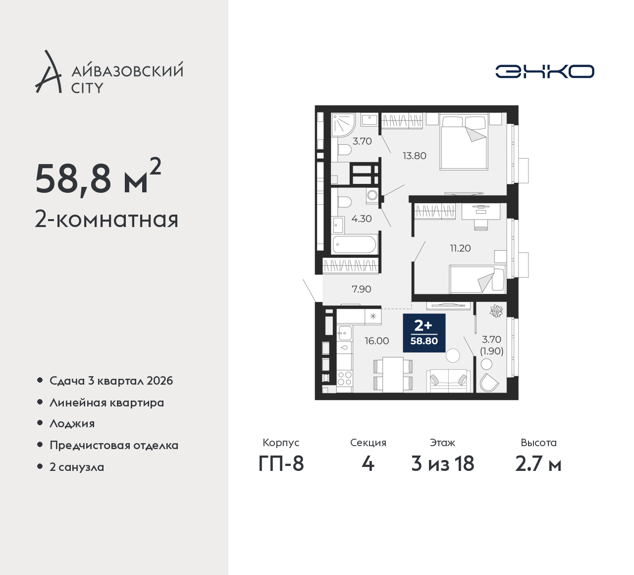 Просторная двухкомнатная квартира с предчистовой отделкой в ЖК "Айвазовский City" на 3 этаже. Общая площадь: 58.8 кв.м., жилая: 25 кв.м., площадь просторной кухни-столовой: 16 кв.м. Комнаты изолированные, все окна выходят на одну сторону. В квартире одна лоджия, два совмещенных санузла. Высота потолков 2.7 м. Дом монолитный, многоподъездный, переменной этажности, от 14 до 24 этажей. Квартира находится в 4-й секции высотой 18 этажей в корпусе ГП-8. На этаже 6 квартир. В подъезде 1 пассажирский и 1 грузовой лифт. Окончание строительства - 3 квартал 2026 года. Оформление сделки по договору долевого участия. Новый жилой район располагается в живописном месте на берегу Туры в центральной части города. Принципиально новое пространство для жизни в центре современного города для тех, чьи мечты сбываются, кто нацелен на постоянный рост, перемены к лучшему для себя и своих близких. Каждая деталь Айвазовский City вдохновляет и заряжает на новые свершения: авторская архитектура, сбалансированная продуманная инфраструктура, дизайнерские дворы со спортивными и детскими площадками, парковые зоны с фонтанами, водный канал, украшающий центральный прогулочный маршрут района и многое другое. В 2019 года проект стал лауреатом престижной премии Urban Awards 2019 в номинации «Лучший строящийся региональный жилой комплекс бизнес-класса». Главная особенность Айвазовский City - соседство разных архитектурных школ в рамках одного дома. Изысканная классика, выразительная эклектика и оригинальный модерн - жить в одном из таких домов настоящий повод для гордости. Айвазовский City это идеальное сочетание комфорта, технологий и развитой инфраструктуры. Вход в подъезд возможен с улицы и со двора. Отправляясь на работу или за покупками, жители могут выйти с внешней стороны дома, а для прогулки с ребенком – со стороны двора. Экологически чистые материалы и энергосберегающие технологии, качественное освещение общественных зон, видеонаблюдение по всей территории жилого района (в том числе в подъездах, лифтах и в подземном паркинге), закрытые дворы с доступом только для жителей Айвазовский City. Часть домов в Айвазовский City будут оснащены подземным паркингом. Востребованный в нашем климатическом поясе формат хранения автомобилей защитит собственность владельца в любое время года. Аккредитация в банках: ПАО Банк «ВТБ», ОАО «Альфа-Банк», ПАО «Газпромбанк», «Сбербанк России», ПАО «Промсвязьбанк» и других. (AQID02514888)