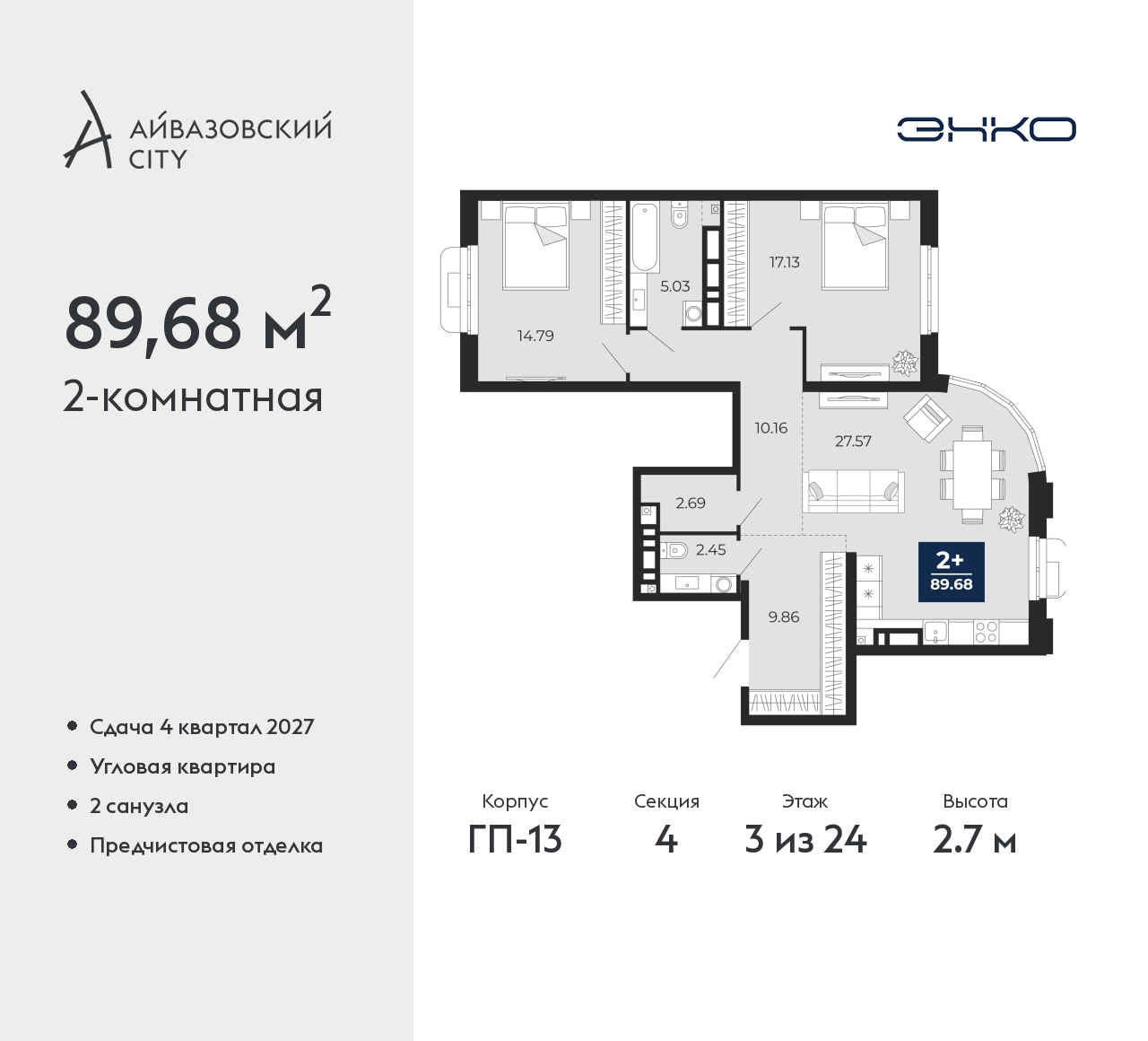 2-комн. квартира с предчистовой отделкой в ЖК "Айвазовский City" на 3 этаже. Общая площадь: 89.68 кв.м., жилая: 31.92 кв.м., площадь просторной кухни-столовой: 27.57 кв.м. Квартира угловая, идеально подойдет любителям тишины и панорамных видов. В квартире один совмещенный и один раздельный санузел. Высота потолков 2.7 м. Дом монолитный, многоподъездный, высотой 24 этажа. Квартира находится в 4-й секции в корпусе ГП-13. На этаже 6 квартир. В подъезде 1 пассажирский и 1 грузовой лифт. Окончание строительства - 4 квартал 2027 года. Оформление сделки по договору долевого участия. Новый жилой район располагается в живописном месте на берегу Туры в центральной части города. Принципиально новое пространство для жизни в центре современного города для тех, чьи мечты сбываются, кто нацелен на постоянный рост, перемены к лучшему для себя и своих близких. Каждая деталь Айвазовский City вдохновляет и заряжает на новые свершения: авторская архитектура, сбалансированная продуманная инфраструктура, дизайнерские дворы со спортивными и детскими площадками, парковые зоны с фонтанами, водный канал, украшающий центральный прогулочный маршрут района и многое другое. В 2019 года проект стал лауреатом престижной премии Urban Awards 2019 в номинации «Лучший строящийся региональный жилой комплекс бизнес-класса». Главная особенность Айвазовский City - соседство разных архитектурных школ в рамках одного дома. Изысканная классика, выразительная эклектика и оригинальный модерн - жить в одном из таких домов настоящий повод для гордости. Айвазовский City это идеальное сочетание комфорта, технологий и развитой инфраструктуры. Вход в подъезд возможен с улицы и со двора. Отправляясь на работу или за покупками, жители могут выйти с внешней стороны дома, а для прогулки с ребенком – со стороны двора. Экологически чистые материалы и энергосберегающие технологии, качественное освещение общественных зон, видеонаблюдение по всей территории жилого района (в том числе в подъездах, лифтах и в подземном паркинге), закрытые дворы с доступом только для жителей Айвазовский City. Часть домов в Айвазовский City будут оснащены подземным паркингом. Востребованный в нашем климатическом поясе формат хранения автомобилей защитит собственность владельца в любое время года. Аккредитация в банках: ПАО Банк «ВТБ», «Сбербанк России», ПАО «Газпромбанк», ОАО «Альфа-Банк», ПАО Банк «ФК Открытие» и других. (AQID02525759)