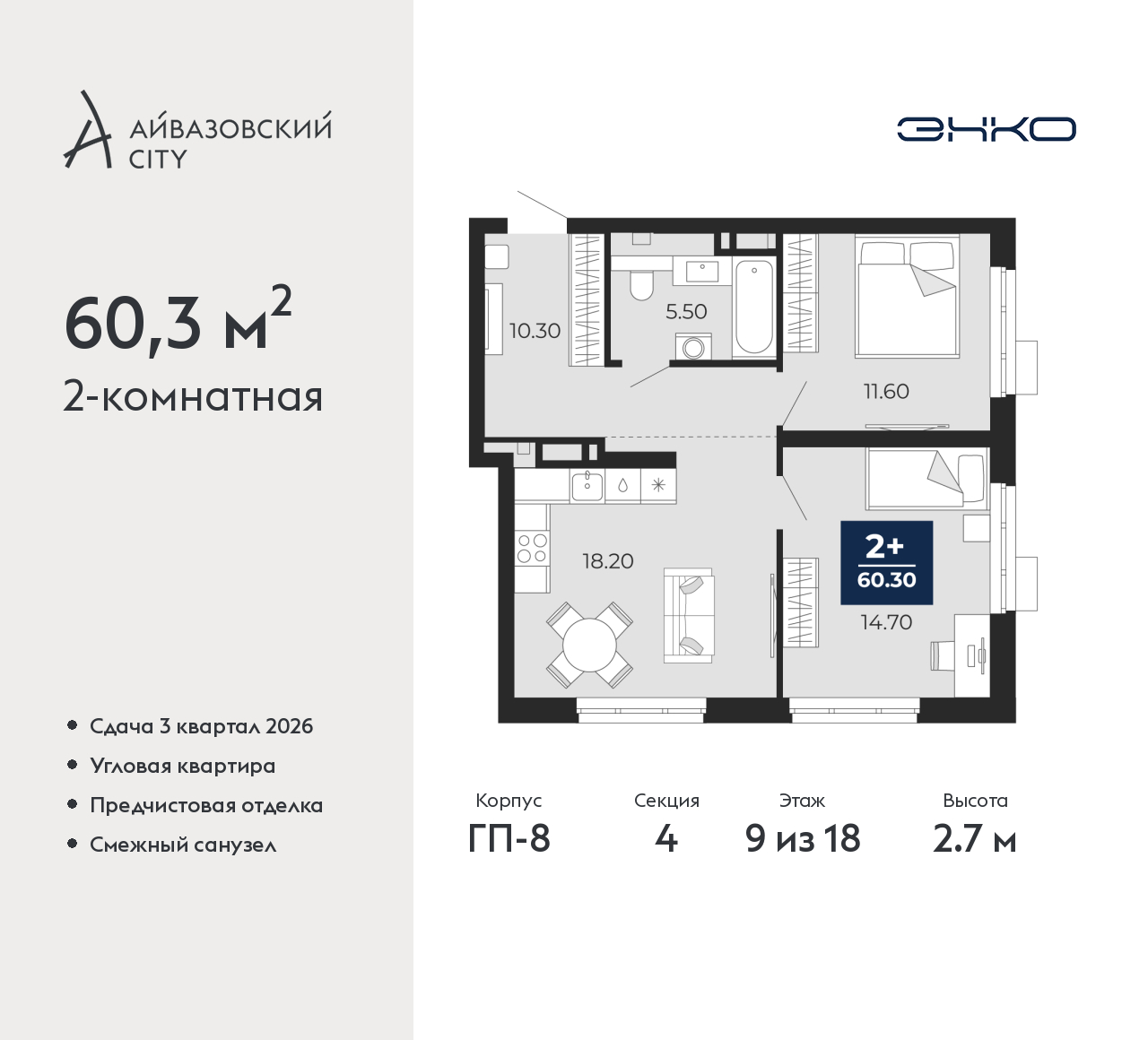 2-комн. квартира с предчистовой отделкой в ЖК "Айвазовский City" на 9 этаже. Общая площадь: 60.3 кв.м., жилая: 26.3 кв.м., площадь просторной кухни-столовой: 18.2 кв.м. Квартира угловая, очень светлая, естественная вентиляция при открытии окон. В квартире один совмещенный санузел. Высота потолков 2.7 м. Дом монолитный, многоподъездный, переменной этажности, от 14 до 24 этажей. Квартира находится в 4-й секции высотой 18 этажей в корпусе ГП-8. На этаже 6 квартир. В подъезде 1 пассажирский и 1 грузовой лифт. Окончание строительства - 3 квартал 2026 года. Оформление сделки по договору долевого участия. Новый жилой район располагается в живописном месте на берегу Туры в центральной части города. Принципиально новое пространство для жизни в центре современного города для тех, чьи мечты сбываются, кто нацелен на постоянный рост, перемены к лучшему для себя и своих близких. Каждая деталь Айвазовский City вдохновляет и заряжает на новые свершения: авторская архитектура, сбалансированная продуманная инфраструктура, дизайнерские дворы со спортивными и детскими площадками, парковые зоны с фонтанами, водный канал, украшающий центральный прогулочный маршрут района и многое другое. В 2019 года проект стал лауреатом престижной премии Urban Awards 2019 в номинации «Лучший строящийся региональный жилой комплекс бизнес-класса». Главная особенность Айвазовский City - соседство разных архитектурных школ в рамках одного дома. Изысканная классика, выразительная эклектика и оригинальный модерн - жить в одном из таких домов настоящий повод для гордости. Айвазовский City это идеальное сочетание комфорта, технологий и развитой инфраструктуры. Вход в подъезд возможен с улицы и со двора. Отправляясь на работу или за покупками, жители могут выйти с внешней стороны дома, а для прогулки с ребенком – со стороны двора. Экологически чистые материалы и энергосберегающие технологии, качественное освещение общественных зон, видеонаблюдение по всей территории жилого района (в том числе в подъездах, лифтах и в подземном паркинге), закрытые дворы с доступом только для жителей Айвазовский City. Часть домов в Айвазовский City будут оснащены подземным паркингом. Востребованный в нашем климатическом поясе формат хранения автомобилей защитит собственность владельца в любое время года. Аккредитация в банках: ОАО «Альфа-Банк», ПАО Банк «ВТБ», ПАО «Газпромбанк», «Сбербанк России», ПАО АКБ «Абсолют Банк» и других. (AQID02453765)