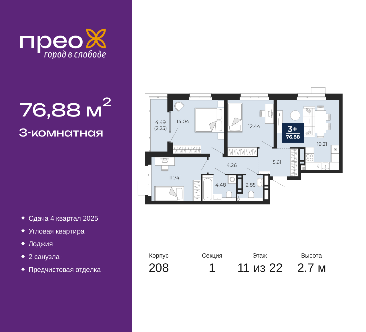 Продается трехкомнатная квартира с предчистовой отделкой в ЖК "Прео" на 11 этаже. Общая площадь: 76.88 кв.м., жилая: 38.22 кв.м., площадь просторной кухни-столовой: 19.21 кв.м. Угловая квартира, очень светлая, естественная вентиляция при открытии окон. В квартире одна лоджия, один совмещенный и один раздельный санузел. Высота потолков 2.7 м. Дом монолитный, трехподъездный, переменной этажности, от 14 до 22 этажей. Квартира находится в 1-й секции высотой 22 этажа в корпусе 208. На этаже 8 квартир. В подъезде 1 пассажирский и 1 грузовой лифт. Окончание строительства - 4 квартал 2025 года. Оформление сделки по договору долевого участия. Преображенский — один из самых привлекательных районов для жизни! Это полностью самостоятельный жилой район с точки зрения инфраструктуры. Преображенский находится между Московским и Червишевским трактами в квартале улиц Закалужская — Вьюжная — Александра Протозанова. Не нужно ждать, когда появится инфраструктура — переезжайте на всё готовое. Вблизи расположены действующие школа и детский сад. В этом году откроется еще один сад, а в следующем году — школа. По соседству с Преображенским запланировано строительство городского парка «Комарово» площадью 38 гектар. За 10 минут можно доехать на автомобиле до крупных ТРЦ: «Лента», «Кристалл», «Леруа Мерлен», «Метро» и «Ашан». С 2018 года в районе открыт Соседский центр — пространство, созданное для формирования добрососедской среды, совместного досуга, общения и реализации соседских инициатив. Здесь проходят встречи соседей, а также сами жители района организовывают мероприятия. Организатором такого события может стать любой желающий. В квартирах выполнена качественная предчистовая отделка. Гладкие стены с финишным выравниванием по маякам. Ровный потолок для установки натяжного потолка. Установлены пятикамерные окна с двойным стеклопакетом (3 стекла). Дизайнерские холлы с видеонаблюдением, безбарьерным и прозрачным входом – всегда светло и спокойно. На первом этаже есть просторные колясочные, где все жители могут оставлять свои коляски и велосипеды. В Преображенском есть всё, что нужно для активного отдыха и занятий спортом. Мы сделали большое футбольное поле с безопасным покрытием. Также установили хоккейный корт, который оборудован по всем необходимым стандартам. Во дворах можно делать упражнения на специальных площадках с турниками. Весь район мы обустроили велодорожками, которые связаны в единый маршрут. У нас есть сухие фонтаны, бьющие из земли, деревья, веревки, сетки, скалодром, газон, песок и резинка — осталось просто дать своему ребенку право на свободную игру. По-настоящему хорошие дворы — это те, которые дети предпочитают соцсетям и телевизору. Аккредитация в банках: ПАО Банк «ВТБ», ПАО «Газпромбанк», «Сбербанк России», ПАО «Банк Уралсиб», ОАО «Альфа-Банк» и других. (AQID02483767)