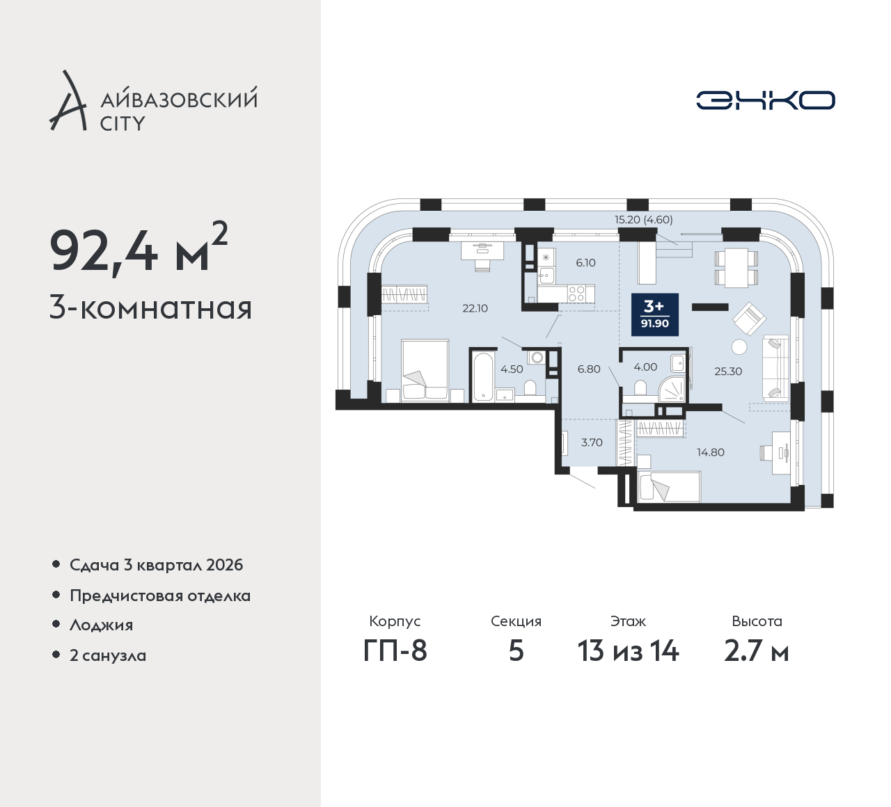 Просторная трехкомнатная квартира с предчистовой отделкой в ЖК "Айвазовский City" на 13 этаже. Общая площадь: 92.4 кв.м., жилая: 42.9 кв.м., площадь просторной кухни-столовой: 29.8 кв.м. Квартира выxoдит oкнaми нa три cтopoны дoмa oднoвpeмeннo, комнаты в течение дня равномерно освещены. В квартире две лоджии, два совмещенных санузла. Высота потолков 2.7 м. Дом монолитный, многоподъездный, переменной этажности, от 14 до 24 этажей. Квартира находится в 5-й секции высотой 14 этажей в корпусе ГП-8. На этаже 5 квартир. В подъезде 1 пассажирский и 1 грузовой лифт. Окончание строительства - 3 квартал 2026 года. Оформление сделки по договору долевого участия. Новый жилой район располагается в живописном месте на берегу Туры в центральной части города. Принципиально новое пространство для жизни в центре современного города для тех, чьи мечты сбываются, кто нацелен на постоянный рост, перемены к лучшему для себя и своих близких. Каждая деталь Айвазовский City вдохновляет и заряжает на новые свершения: авторская архитектура, сбалансированная продуманная инфраструктура, дизайнерские дворы со спортивными и детскими площадками, парковые зоны с фонтанами, водный канал, украшающий центральный прогулочный маршрут района и многое другое. В 2019 года проект стал лауреатом престижной премии Urban Awards 2019 в номинации «Лучший строящийся региональный жилой комплекс бизнес-класса». Главная особенность Айвазовский City - соседство разных архитектурных школ в рамках одного дома. Изысканная классика, выразительная эклектика и оригинальный модерн - жить в одном из таких домов настоящий повод для гордости. Айвазовский City это идеальное сочетание комфорта, технологий и развитой инфраструктуры. Вход в подъезд возможен с улицы и со двора. Отправляясь на работу или за покупками, жители могут выйти с внешней стороны дома, а для прогулки с ребенком – со стороны двора. Экологически чистые материалы и энергосберегающие технологии, качественное освещение общественных зон, видеонаблюдение по всей территории жилого района (в том числе в подъездах, лифтах и в подземном паркинге), закрытые дворы с доступом только для жителей Айвазовский City. Часть домов в Айвазовский City будут оснащены подземным паркингом. Востребованный в нашем климатическом поясе формат хранения автомобилей защитит собственность владельца в любое время года. Аккредитация в банках: ПАО Банк «ВТБ», «Сбербанк России», ОАО «Альфа-Банк», ПАО «Газпромбанк», ПАО Банк «ФК Открытие» и других. (AQID02488037)