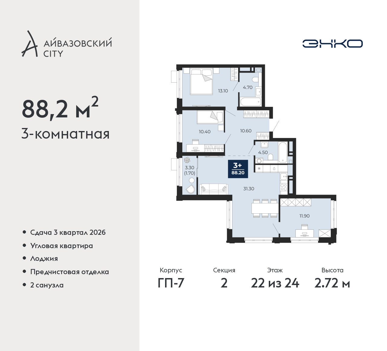 Трехкомнатная квартира с предчистовой отделкой в ЖК "Айвазовский City" на 22 этаже. Общая площадь: 88.2 кв.м., жилая: 35.4 кв.м., площадь просторной кухни-столовой: 31.3 кв.м. Угловая квартира, идеально подойдет любителям тишины и панорамных видов. В квартире одна лоджия, два совмещенных санузла. Высота потолков 2.72 м. Дом монолитный, многоподъездный, переменной этажности, от 9 до 24 этажей. Квартира находится во 2-й секции высотой 24 этажа в корпусе ГП-7. На этаже 7 квартир. В подъезде 1 пассажирский и 2 грузовых лифта. Окончание строительства - 3 квартал 2026 года. Оформление сделки по договору долевого участия. Новый жилой район располагается в живописном месте на берегу Туры в центральной части города. Принципиально новое пространство для жизни в центре современного города для тех, чьи мечты сбываются, кто нацелен на постоянный рост, перемены к лучшему для себя и своих близких. Каждая деталь Айвазовский City вдохновляет и заряжает на новые свершения: авторская архитектура, сбалансированная продуманная инфраструктура, дизайнерские дворы со спортивными и детскими площадками, парковые зоны с фонтанами, водный канал, украшающий центральный прогулочный маршрут района и многое другое. В 2019 года проект стал лауреатом престижной премии Urban Awards 2019 в номинации «Лучший строящийся региональный жилой комплекс бизнес-класса». Главная особенность Айвазовский City - соседство разных архитектурных школ в рамках одного дома. Изысканная классика, выразительная эклектика и оригинальный модерн - жить в одном из таких домов настоящий повод для гордости. Айвазовский City это идеальное сочетание комфорта, технологий и развитой инфраструктуры. Вход в подъезд возможен с улицы и со двора. Отправляясь на работу или за покупками, жители могут выйти с внешней стороны дома, а для прогулки с ребенком – со стороны двора. Экологически чистые материалы и энергосберегающие технологии, качественное освещение общественных зон, видеонаблюдение по всей территории жилого района (в том числе в подъездах, лифтах и в подземном паркинге), закрытые дворы с доступом только для жителей Айвазовский City. Часть домов в Айвазовский City будут оснащены подземным паркингом. Востребованный в нашем климатическом поясе формат хранения автомобилей защитит собственность владельца в любое время года. Аккредитация в банках: «Сбербанк России», ОАО «Альфа-Банк», ПАО Банк «ВТБ», ПАО «Газпромбанк», ПАО «Промсвязьбанк» и других. (AQID02497746)