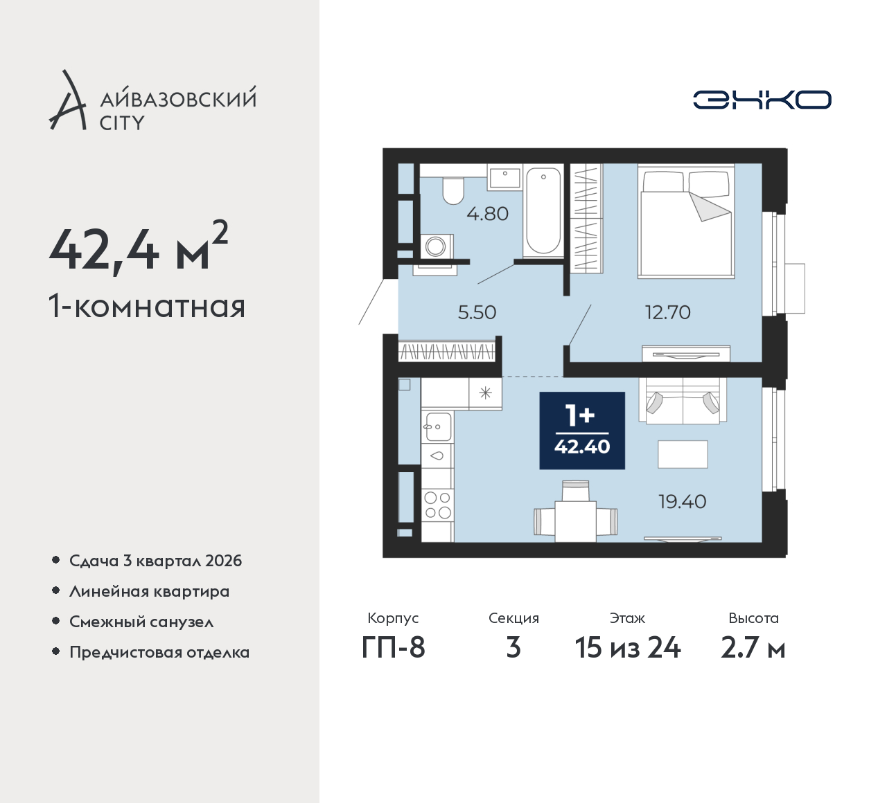 Продается 1-комн. квартира от застройщика с предчистовой отделкой в ЖК "Айвазовский City" на 15 этаже. Общая площадь: 42.4 кв.м., жилая: 12.7 кв.м., площадь просторной кухни-столовой: 19.4 кв.м. Все окна выходят на одну сторону. В квартире один совмещенный санузел. Высота потолков 2.7 м. Дом монолитный, многоподъездный, переменной этажности, от 14 до 24 этажей. Квартира находится в 3-й секции высотой 24 этажа в корпусе ГП-8. На этаже 7 квартир. В подъезде 1 пассажирский и 1 грузовой лифт. Окончание строительства - 3 квартал 2026 года. Оформление сделки по договору долевого участия. Новый жилой район располагается в живописном месте на берегу Туры в центральной части города. Принципиально новое пространство для жизни в центре современного города для тех, чьи мечты сбываются, кто нацелен на постоянный рост, перемены к лучшему для себя и своих близких. Каждая деталь Айвазовский City вдохновляет и заряжает на новые свершения: авторская архитектура, сбалансированная продуманная инфраструктура, дизайнерские дворы со спортивными и детскими площадками, парковые зоны с фонтанами, водный канал, украшающий центральный прогулочный маршрут района и многое другое. В 2019 года проект стал лауреатом престижной премии Urban Awards 2019 в номинации «Лучший строящийся региональный жилой комплекс бизнес-класса». Главная особенность Айвазовский City - соседство разных архитектурных школ в рамках одного дома. Изысканная классика, выразительная эклектика и оригинальный модерн - жить в одном из таких домов настоящий повод для гордости. Айвазовский City это идеальное сочетание комфорта, технологий и развитой инфраструктуры. Вход в подъезд возможен с улицы и со двора. Отправляясь на работу или за покупками, жители могут выйти с внешней стороны дома, а для прогулки с ребенком – со стороны двора. Экологически чистые материалы и энергосберегающие технологии, качественное освещение общественных зон, видеонаблюдение по всей территории жилого района (в том числе в подъездах, лифтах и в подземном паркинге), закрытые дворы с доступом только для жителей Айвазовский City. Часть домов в Айвазовский City будут оснащены подземным паркингом. Востребованный в нашем климатическом поясе формат хранения автомобилей защитит собственность владельца в любое время года. Аккредитация в банках: ПАО Банк «ВТБ», «Сбербанк России», ПАО «Газпромбанк», ОАО «Альфа-Банк», АО "ДОМ.РФ" и других. (AQID02501211)