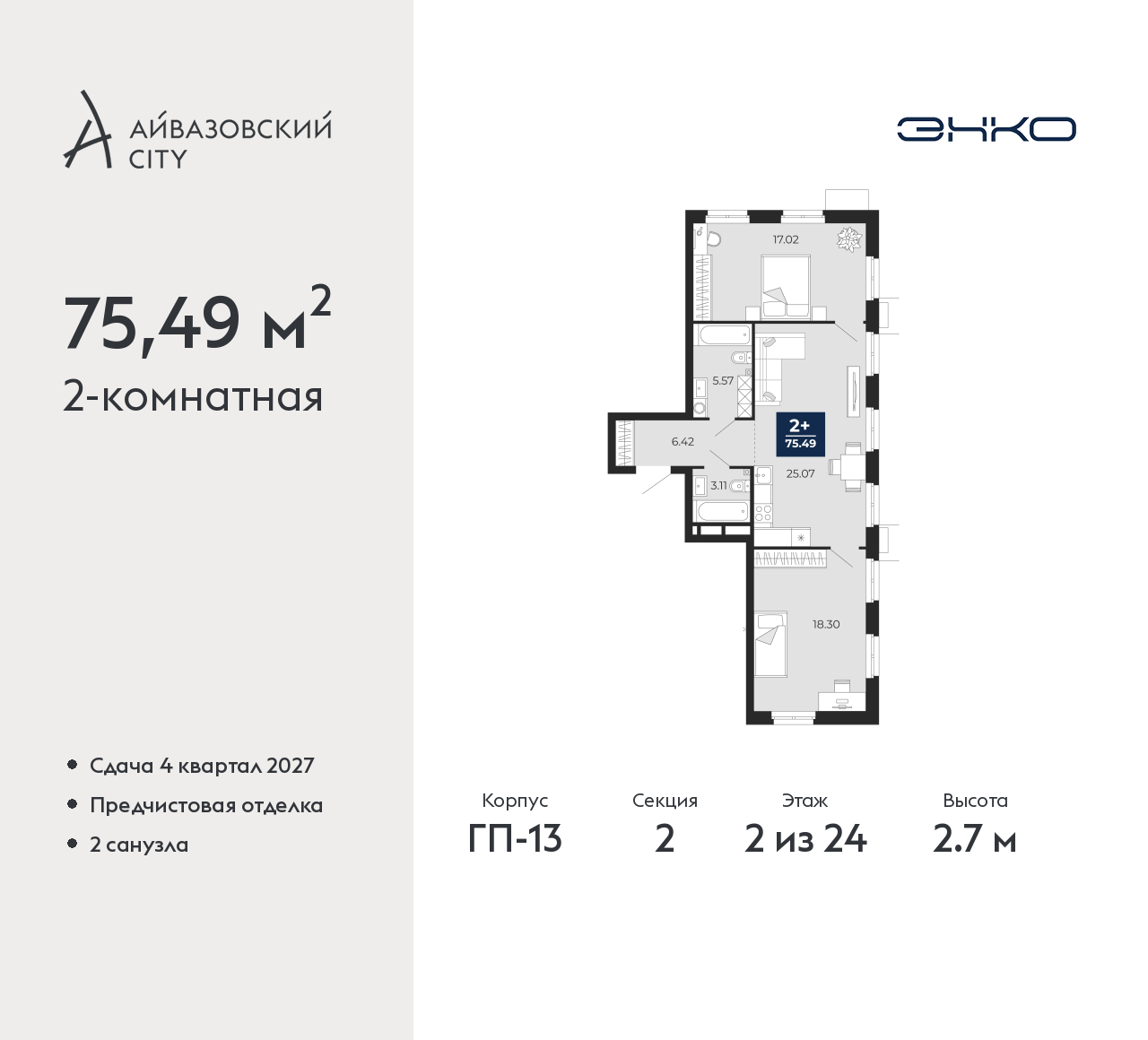 Просторная двухкомнатная квартира с предчистовой отделкой в ЖК "Айвазовский City" на 2 этаже. Общая площадь: 75.49 кв.м., жилая: 35.32 кв.м., площадь просторной кухни-столовой: 25.07 кв.м. Квартира без проходных комнат, окна выходят нa три cтopoны дома. В квартире два совмещенных санузла. Высота потолков 2.7 м. Дом монолитный, многоподъездный, высотой 24 этажа. Квартира находится во 2-й секции в корпусе ГП-13. На этаже 6 квартир. В подъезде 1 пассажирский и 1 грузовой лифт. Окончание строительства - 4 квартал 2027 года. Оформление сделки по договору долевого участия. Новый жилой район располагается в живописном месте на берегу Туры в центральной части города. Принципиально новое пространство для жизни в центре современного города для тех, чьи мечты сбываются, кто нацелен на постоянный рост, перемены к лучшему для себя и своих близких. Каждая деталь Айвазовский City вдохновляет и заряжает на новые свершения: авторская архитектура, сбалансированная продуманная инфраструктура, дизайнерские дворы со спортивными и детскими площадками, парковые зоны с фонтанами, водный канал, украшающий центральный прогулочный маршрут района и многое другое. В 2019 года проект стал лауреатом престижной премии Urban Awards 2019 в номинации «Лучший строящийся региональный жилой комплекс бизнес-класса». Главная особенность Айвазовский City - соседство разных архитектурных школ в рамках одного дома. Изысканная классика, выразительная эклектика и оригинальный модерн - жить в одном из таких домов настоящий повод для гордости. Айвазовский City это идеальное сочетание комфорта, технологий и развитой инфраструктуры. Вход в подъезд возможен с улицы и со двора. Отправляясь на работу или за покупками, жители могут выйти с внешней стороны дома, а для прогулки с ребенком – со стороны двора. Экологически чистые материалы и энергосберегающие технологии, качественное освещение общественных зон, видеонаблюдение по всей территории жилого района (в том числе в подъездах, лифтах и в подземном паркинге), закрытые дворы с доступом только для жителей Айвазовский City. Часть домов в Айвазовский City будут оснащены подземным паркингом. Востребованный в нашем климатическом поясе формат хранения автомобилей защитит собственность владельца в любое время года. Аккредитация в банках: ПАО Банк «ВТБ», «Сбербанк России», ОАО «Альфа-Банк», ПАО «Газпромбанк», ПАО «Совкомбанк» и других. (AQID02525704)