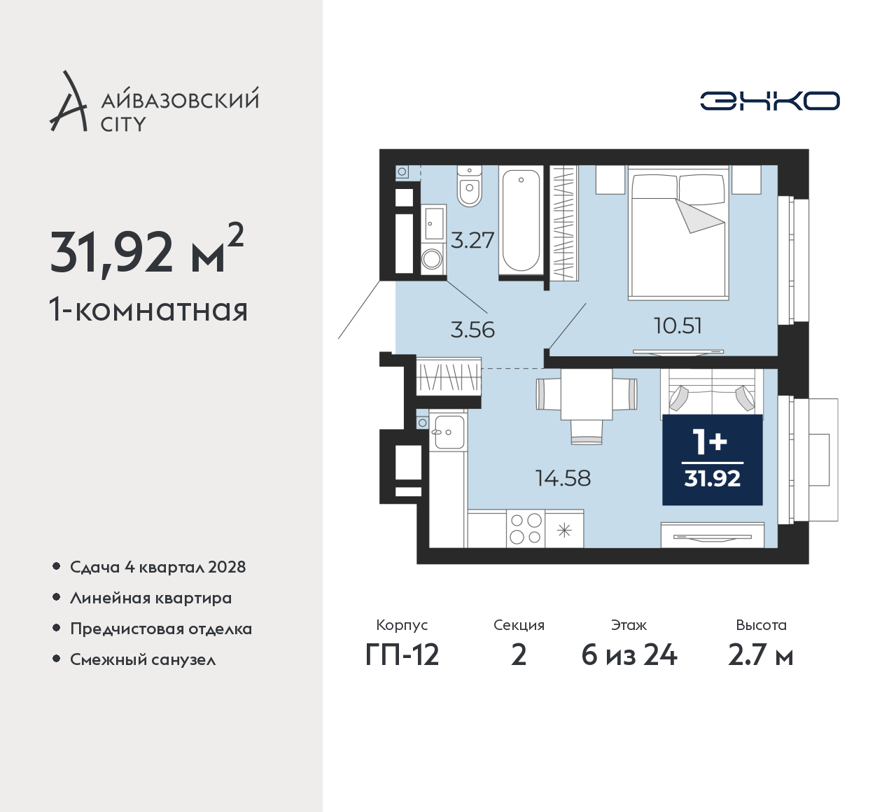 Однокомнатная квартира от застройщика с предчистовой отделкой в ЖК "Айвазовский City" на 6 этаже. Общая площадь: 31.92 кв.м., жилая: 10.51 кв.м., площадь просторной кухни-столовой: 14.58 кв.м. Все окна выходят на одну сторону. В квартире один совмещенный санузел. Высота потолков 2.7 м. Дом монолитный, многоподъездный, высотой 24 этажа. Квартира находится во 2-й секции в корпусе ГП-12. На этаже 6 квартир. В подъезде 1 пассажирский и 1 грузовой лифт. Окончание строительства - 4 квартал 2028 года. Оформление сделки по договору долевого участия. Новый жилой район располагается в живописном месте на берегу Туры в центральной части города. Принципиально новое пространство для жизни в центре современного города для тех, чьи мечты сбываются, кто нацелен на постоянный рост, перемены к лучшему для себя и своих близких. Каждая деталь Айвазовский City вдохновляет и заряжает на новые свершения: авторская архитектура, сбалансированная продуманная инфраструктура, дизайнерские дворы со спортивными и детскими площадками, парковые зоны с фонтанами, водный канал, украшающий центральный прогулочный маршрут района и многое другое. В 2019 года проект стал лауреатом престижной премии Urban Awards 2019 в номинации «Лучший строящийся региональный жилой комплекс бизнес-класса». Главная особенность Айвазовский City - соседство разных архитектурных школ в рамках одного дома. Изысканная классика, выразительная эклектика и оригинальный модерн - жить в одном из таких домов настоящий повод для гордости. Айвазовский City это идеальное сочетание комфорта, технологий и развитой инфраструктуры. Вход в подъезд возможен с улицы и со двора. Отправляясь на работу или за покупками, жители могут выйти с внешней стороны дома, а для прогулки с ребенком – со стороны двора. Экологически чистые материалы и энергосберегающие технологии, качественное освещение общественных зон, видеонаблюдение по всей территории жилого района (в том числе в подъездах, лифтах и в подземном паркинге), закрытые дворы с доступом только для жителей Айвазовский City. Часть домов в Айвазовский City будут оснащены подземным паркингом. Востребованный в нашем климатическом поясе формат хранения автомобилей защитит собственность владельца в любое время года. Аккредитация в банках: ПАО Банк «ВТБ», ПАО «Газпромбанк», «Сбербанк России», ОАО «Альфа-Банк», ПАО Банк «ФК Открытие» и других. (AQID02525518)