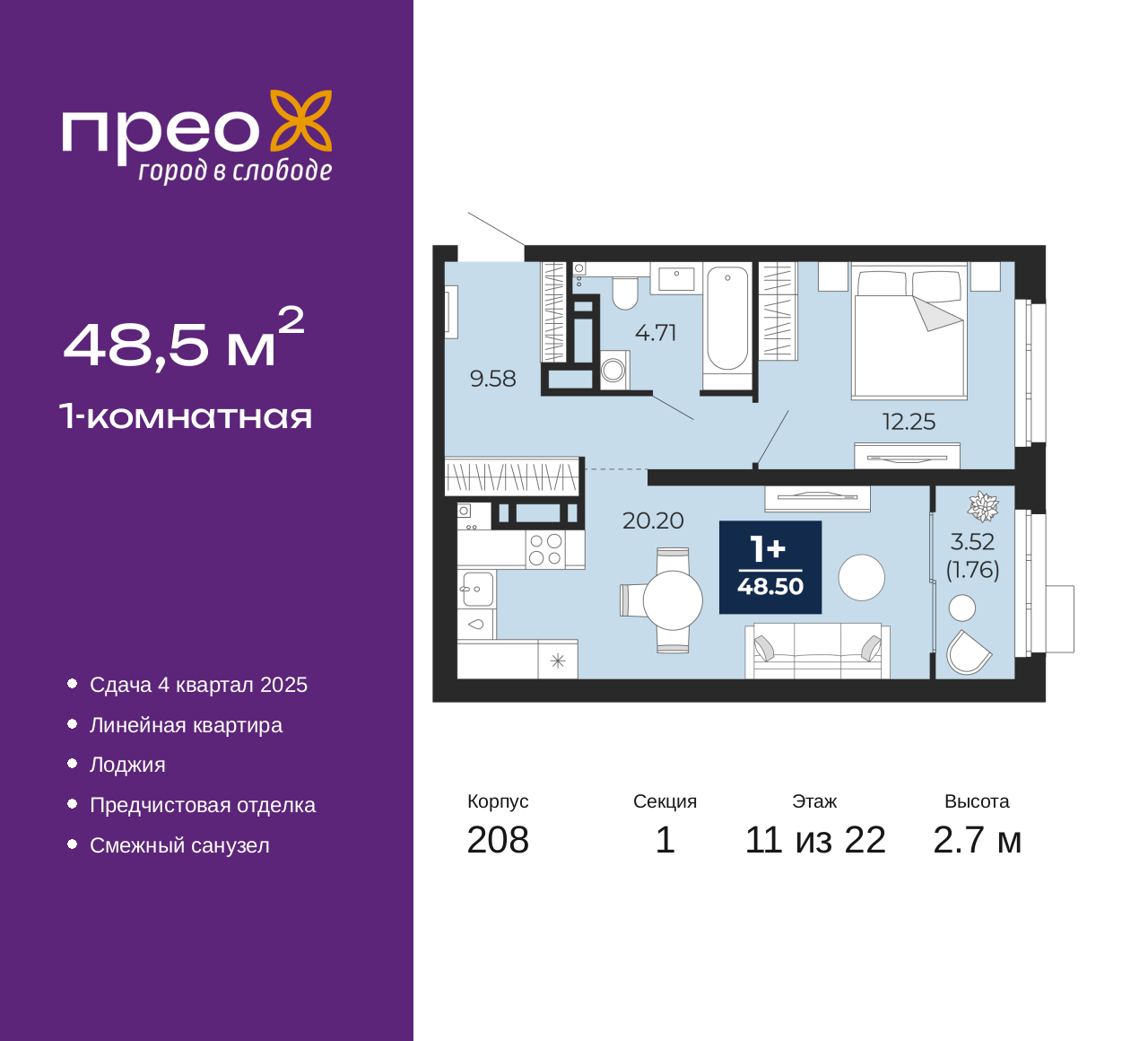 Просторная однокомнатная квартира с предчистовой отделкой в ЖК "Прео" на 11 этаже. Общая площадь: 48.5 кв.м., жилая: 12.25 кв.м., площадь просторной кухни-столовой: 20.2 кв.м. Все окна выходят на одну сторону. В квартире одна лоджия, один совмещенный санузел. Высота потолков 2.7 м. Дом монолитный, трехподъездный, переменной этажности, от 14 до 22 этажей. Квартира находится в 1-й секции высотой 22 этажа в корпусе 208. На этаже 8 квартир. В подъезде 1 пассажирский и 1 грузовой лифт. Окончание строительства - 4 квартал 2025 года. Оформление сделки по договору долевого участия. Преображенский — один из самых привлекательных районов для жизни! Это полностью самостоятельный жилой район с точки зрения инфраструктуры. Преображенский находится между Московским и Червишевским трактами в квартале улиц Закалужская — Вьюжная — Александра Протозанова. Не нужно ждать, когда появится инфраструктура — переезжайте на всё готовое. Вблизи расположены действующие школа и детский сад. В этом году откроется еще один сад, а в следующем году — школа. По соседству с Преображенским запланировано строительство городского парка «Комарово» площадью 38 гектар. За 10 минут можно доехать на автомобиле до крупных ТРЦ: «Лента», «Кристалл», «Леруа Мерлен», «Метро» и «Ашан». С 2018 года в районе открыт Соседский центр — пространство, созданное для формирования добрососедской среды, совместного досуга, общения и реализации соседских инициатив. Здесь проходят встречи соседей, а также сами жители района организовывают мероприятия. Организатором такого события может стать любой желающий. В квартирах выполнена качественная предчистовая отделка. Гладкие стены с финишным выравниванием по маякам. Ровный потолок для установки натяжного потолка. Установлены пятикамерные окна с двойным стеклопакетом (3 стекла). Дизайнерские холлы с видеонаблюдением, безбарьерным и прозрачным входом – всегда светло и спокойно. На первом этаже есть просторные колясочные, где все жители могут оставлять свои коляски и велосипеды. В Преображенском есть всё, что нужно для активного отдыха и занятий спортом. Мы сделали большое футбольное поле с безопасным покрытием. Также установили хоккейный корт, который оборудован по всем необходимым стандартам. Во дворах можно делать упражнения на специальных площадках с турниками. Весь район мы обустроили велодорожками, которые связаны в единый маршрут. У нас есть сухие фонтаны, бьющие из земли, деревья, веревки, сетки, скалодром, газон, песок и резинка — осталось просто дать своему ребенку право на свободную игру. По-настоящему хорошие дворы — это те, которые дети предпочитают соцсетям и телевизору. (AQID02526979)