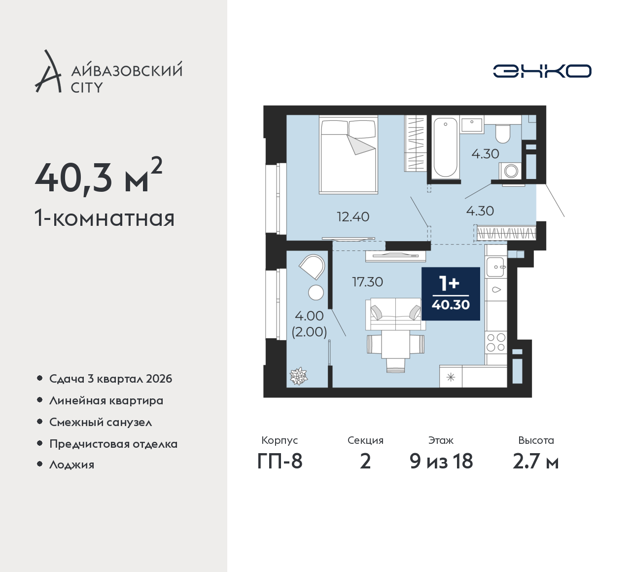 Однокомнатная квартира с предчистовой отделкой в ЖК "Айвазовский City" на 9 этаже. Общая площадь: 40.3 кв.м., жилая: 12.4 кв.м., площадь просторной кухни-столовой: 17.3 кв.м. Все окна выходят на одну сторону. В квартире одна лоджия, один совмещенный санузел. Высота потолков 2.7 м. Дом монолитный, многоподъездный, переменной этажности, от 14 до 24 этажей. Квартира находится во 2-й секции высотой 18 этажей в корпусе ГП-8. На этаже 5 квартир. В подъезде 1 пассажирский и 1 грузовой лифт. Окончание строительства - 3 квартал 2026 года. Оформление сделки по договору долевого участия. Новый жилой район располагается в живописном месте на берегу Туры в центральной части города. Принципиально новое пространство для жизни в центре современного города для тех, чьи мечты сбываются, кто нацелен на постоянный рост, перемены к лучшему для себя и своих близких. Каждая деталь Айвазовский City вдохновляет и заряжает на новые свершения: авторская архитектура, сбалансированная продуманная инфраструктура, дизайнерские дворы со спортивными и детскими площадками, парковые зоны с фонтанами, водный канал, украшающий центральный прогулочный маршрут района и многое другое. В 2019 года проект стал лауреатом престижной премии Urban Awards 2019 в номинации «Лучший строящийся региональный жилой комплекс бизнес-класса». Главная особенность Айвазовский City - соседство разных архитектурных школ в рамках одного дома. Изысканная классика, выразительная эклектика и оригинальный модерн - жить в одном из таких домов настоящий повод для гордости. Айвазовский City это идеальное сочетание комфорта, технологий и развитой инфраструктуры. Вход в подъезд возможен с улицы и со двора. Отправляясь на работу или за покупками, жители могут выйти с внешней стороны дома, а для прогулки с ребенком – со стороны двора. Экологически чистые материалы и энергосберегающие технологии, качественное освещение общественных зон, видеонаблюдение по всей территории жилого района (в том числе в подъездах, лифтах и в подземном паркинге), закрытые дворы с доступом только для жителей Айвазовский City. Часть домов в Айвазовский City будут оснащены подземным паркингом. Востребованный в нашем климатическом поясе формат хранения автомобилей защитит собственность владельца в любое время года. Аккредитация в банках: «Сбербанк России», ПАО Банк «ВТБ», ПАО «Газпромбанк», ОАО «Альфа-Банк», ПАО «Совкомбанк» и других. (AQID02500471)