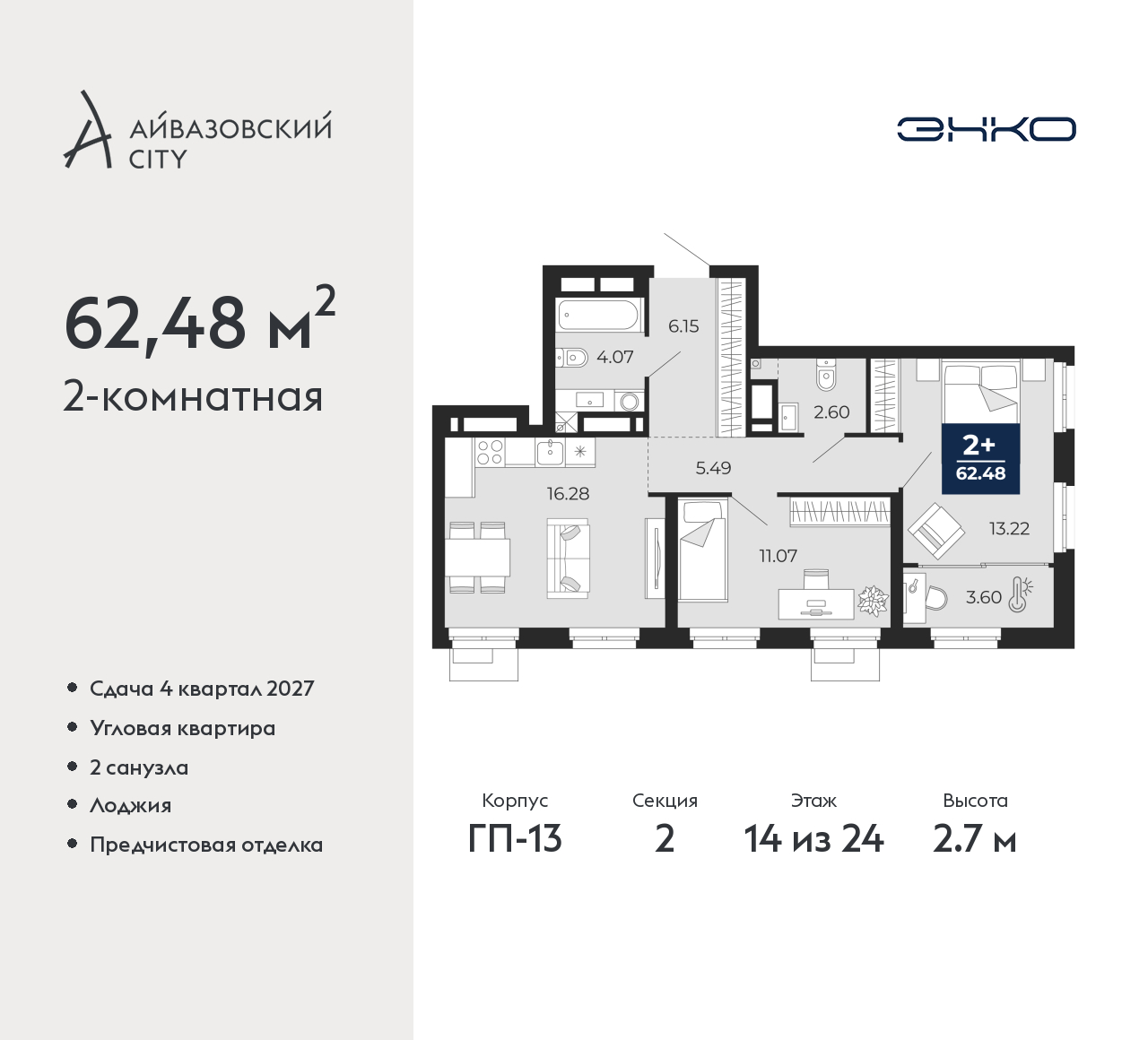 Продается двухкомнатная квартира с предчистовой отделкой в ЖК "Айвазовский City" на 14 этаже. Общая площадь: 62.48 кв.м., жилая: 24.29 кв.м., площадь просторной кухни-столовой: 16.28 кв.м. Угловая квартира, очень светлая, естественная вентиляция при открытии окон. В квартире одна лоджия, один совмещенный и один раздельный санузел. Высота потолков 2.7 м. Дом монолитный, многоподъездный, высотой 24 этажа. Квартира находится во 2-й секции в корпусе ГП-13. На этаже 6 квартир. В подъезде 1 пассажирский и 1 грузовой лифт. Окончание строительства - 4 квартал 2027 года. Оформление сделки по договору долевого участия. Новый жилой район располагается в живописном месте на берегу Туры в центральной части города. Принципиально новое пространство для жизни в центре современного города для тех, чьи мечты сбываются, кто нацелен на постоянный рост, перемены к лучшему для себя и своих близких. Каждая деталь Айвазовский City вдохновляет и заряжает на новые свершения: авторская архитектура, сбалансированная продуманная инфраструктура, дизайнерские дворы со спортивными и детскими площадками, парковые зоны с фонтанами, водный канал, украшающий центральный прогулочный маршрут района и многое другое. В 2019 года проект стал лауреатом престижной премии Urban Awards 2019 в номинации «Лучший строящийся региональный жилой комплекс бизнес-класса». Главная особенность Айвазовский City - соседство разных архитектурных школ в рамках одного дома. Изысканная классика, выразительная эклектика и оригинальный модерн - жить в одном из таких домов настоящий повод для гордости. Айвазовский City это идеальное сочетание комфорта, технологий и развитой инфраструктуры. Вход в подъезд возможен с улицы и со двора. Отправляясь на работу или за покупками, жители могут выйти с внешней стороны дома, а для прогулки с ребенком – со стороны двора. Экологически чистые материалы и энергосберегающие технологии, качественное освещение общественных зон, видеонаблюдение по всей территории жилого района (в том числе в подъездах, лифтах и в подземном паркинге), закрытые дворы с доступом только для жителей Айвазовский City. Часть домов в Айвазовский City будут оснащены подземным паркингом. Востребованный в нашем климатическом поясе формат хранения автомобилей защитит собственность владельца в любое время года. Аккредитация в банках: ПАО «Газпромбанк», ОАО «Альфа-Банк», ПАО Банк «ВТБ», «Сбербанк России», ПАО «Совкомбанк» и других. (AQID02525699)