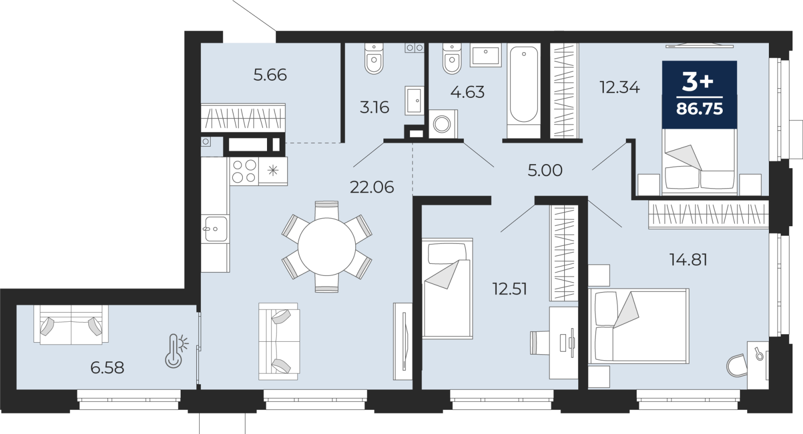 Продается трехкомнатная квартира с предчистовой отделкой в ЖК "Айвазовский City" на 2 этаже. Общая площадь: 86.75 кв.м., жилая: 39.66 кв.м., площадь просторной кухни-столовой: 22.06 кв.м. Угловая квартира, очень светлая, естественная вентиляция при открытии окон. В квартире одна лоджия, один совмещенный и один раздельный санузел. Высота потолков 2.7 м. Дом монолитный, многоподъездный, высотой 24 этажа. Квартира находится в 4-й секции в корпусе ГП-12. На этаже 5 квартир. В подъезде 1 пассажирский и 1 грузовой лифт. Окончание строительства - 4 квартал 2028 года. Оформление сделки по договору долевого участия. Новый жилой район располагается в живописном месте на берегу Туры в центральной части города. Принципиально новое пространство для жизни в центре современного города для тех, чьи мечты сбываются, кто нацелен на постоянный рост, перемены к лучшему для себя и своих близких. Каждая деталь Айвазовский City вдохновляет и заряжает на новые свершения: авторская архитектура, сбалансированная продуманная инфраструктура, дизайнерские дворы со спортивными и детскими площадками, парковые зоны с фонтанами, водный канал, украшающий центральный прогулочный маршрут района и многое другое. В 2019 года проект стал лауреатом престижной премии Urban Awards 2019 в номинации «Лучший строящийся региональный жилой комплекс бизнес-класса». Главная особенность Айвазовский City - соседство разных архитектурных школ в рамках одного дома. Изысканная классика, выразительная эклектика и оригинальный модерн - жить в одном из таких домов настоящий повод для гордости. Айвазовский City это идеальное сочетание комфорта, технологий и развитой инфраструктуры. Вход в подъезд возможен с улицы и со двора. Отправляясь на работу или за покупками, жители могут выйти с внешней стороны дома, а для прогулки с ребенком – со стороны двора. Экологически чистые материалы и энергосберегающие технологии, качественное освещение общественных зон, видеонаблюдение по всей территории жилого района (в том числе в подъездах, лифтах и в подземном паркинге), закрытые дворы с доступом только для жителей Айвазовский City. Часть домов в Айвазовский City будут оснащены подземным паркингом. Востребованный в нашем климатическом поясе формат хранения автомобилей защитит собственность владельца в любое время года. Аккредитация в банках: ОАО «Альфа-Банк», ПАО Банк «ВТБ», «Сбербанк России», ПАО «Газпромбанк», АО "ДОМ.РФ" и других. (AQID02525741)