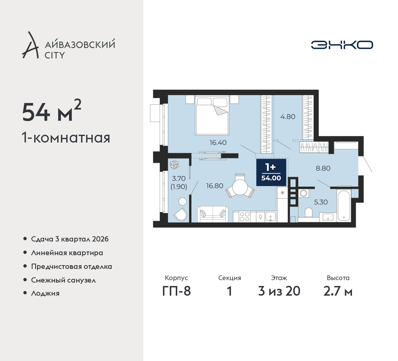Продается однокомнатная квартира с предчистовой отделкой в ЖК "Айвазовский City" на 3 этаже. Общая площадь: 54 кв.м., жилая: 16.4 кв.м., площадь просторной кухни-столовой: 16.8 кв.м. Все окна выходят на одну сторону. В квартире одна лоджия, один совмещенный санузел. Высота потолков 2.7 м. Дом монолитный, многоподъездный, переменной этажности, от 14 до 24 этажей. Квартира находится в 1-й секции высотой 20 этажей в корпусе ГП-8. На этаже 6 квартир. В подъезде 1 пассажирский и 1 грузовой лифт. Окончание строительства - 3 квартал 2026 года. Оформление сделки по договору долевого участия. Новый жилой район располагается в живописном месте на берегу Туры в центральной части города. Принципиально новое пространство для жизни в центре современного города для тех, чьи мечты сбываются, кто нацелен на постоянный рост, перемены к лучшему для себя и своих близких. Каждая деталь Айвазовский City вдохновляет и заряжает на новые свершения: авторская архитектура, сбалансированная продуманная инфраструктура, дизайнерские дворы со спортивными и детскими площадками, парковые зоны с фонтанами, водный канал, украшающий центральный прогулочный маршрут района и многое другое. В 2019 года проект стал лауреатом престижной премии Urban Awards 2019 в номинации «Лучший строящийся региональный жилой комплекс бизнес-класса». Главная особенность Айвазовский City - соседство разных архитектурных школ в рамках одного дома. Изысканная классика, выразительная эклектика и оригинальный модерн - жить в одном из таких домов настоящий повод для гордости. Айвазовский City это идеальное сочетание комфорта, технологий и развитой инфраструктуры. Вход в подъезд возможен с улицы и со двора. Отправляясь на работу или за покупками, жители могут выйти с внешней стороны дома, а для прогулки с ребенком – со стороны двора. Экологически чистые материалы и энергосберегающие технологии, качественное освещение общественных зон, видеонаблюдение по всей территории жилого района (в том числе в подъездах, лифтах и в подземном паркинге), закрытые дворы с доступом только для жителей Айвазовский City. Часть домов в Айвазовский City будут оснащены подземным паркингом. Востребованный в нашем климатическом поясе формат хранения автомобилей защитит собственность владельца в любое время года. Аккредитация в банках: ПАО «Газпромбанк», «Сбербанк России», ОАО «Альфа-Банк», ПАО Банк «ВТБ», АО "ДОМ.РФ" и других. (AQID02487977)