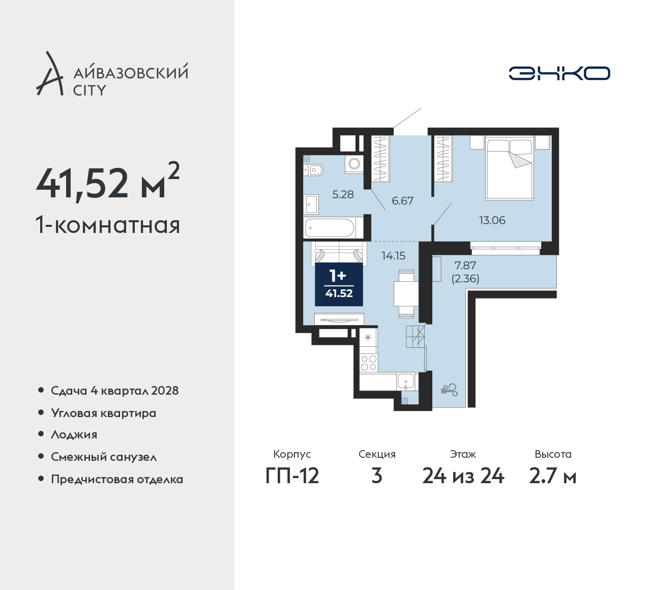 Продается 1-комн. квартира с предчистовой отделкой в ЖК "Айвазовский City" на 24 этаже. Общая площадь: 41.52 кв.м., жилая: 13.06 кв.м., площадь просторной кухни-столовой: 14.15 кв.м. Квартира угловая, очень светлая, естественная вентиляция при открытии окон. В квартире одна лоджия, один совмещенный санузел. Высота потолков 2.7 м. Дом монолитный, многоподъездный, высотой 24 этажа. Квартира находится в 3-й секции в корпусе ГП-12. На этаже 6 квартир. В подъезде 1 пассажирский и 1 грузовой лифт. Окончание строительства - 4 квартал 2028 года. Оформление сделки по договору долевого участия. Новый жилой район располагается в живописном месте на берегу Туры в центральной части города. Принципиально новое пространство для жизни в центре современного города для тех, чьи мечты сбываются, кто нацелен на постоянный рост, перемены к лучшему для себя и своих близких. Каждая деталь Айвазовский City вдохновляет и заряжает на новые свершения: авторская архитектура, сбалансированная продуманная инфраструктура, дизайнерские дворы со спортивными и детскими площадками, парковые зоны с фонтанами, водный канал, украшающий центральный прогулочный маршрут района и многое другое. В 2019 года проект стал лауреатом престижной премии Urban Awards 2019 в номинации «Лучший строящийся региональный жилой комплекс бизнес-класса». Главная особенность Айвазовский City - соседство разных архитектурных школ в рамках одного дома. Изысканная классика, выразительная эклектика и оригинальный модерн - жить в одном из таких домов настоящий повод для гордости. Айвазовский City это идеальное сочетание комфорта, технологий и развитой инфраструктуры. Вход в подъезд возможен с улицы и со двора. Отправляясь на работу или за покупками, жители могут выйти с внешней стороны дома, а для прогулки с ребенком – со стороны двора. Экологически чистые материалы и энергосберегающие технологии, качественное освещение общественных зон, видеонаблюдение по всей территории жилого района (в том числе в подъездах, лифтах и в подземном паркинге), закрытые дворы с доступом только для жителей Айвазовский City. Часть домов в Айвазовский City будут оснащены подземным паркингом. Востребованный в нашем климатическом поясе формат хранения автомобилей защитит собственность владельца в любое время года. Аккредитация в банках: ПАО Банк «ВТБ», ОАО «Альфа-Банк», «Сбербанк России», ПАО «Газпромбанк», ПАО «Промсвязьбанк» и других. (AQID02525652)
