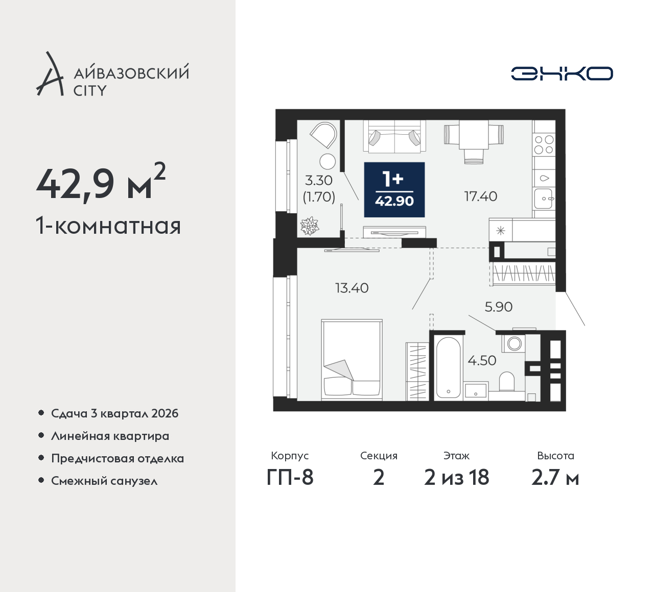 1-комн. квартира от застройщика с предчистовой отделкой в ЖК "Айвазовский City" на 2 этаже. Общая площадь: 42.9 кв.м., жилая: 12.5 кв.м., площадь просторной кухни-столовой: 21.8 кв.м. Все окна выходят на одну сторону. В квартире один совмещенный санузел. Высота потолков 2.7 м. Дом монолитный, многоподъездный, переменной этажности, от 14 до 24 этажей. Квартира находится во 2-й секции высотой 18 этажей в корпусе ГП-8. На этаже 5 квартир. В подъезде 1 пассажирский и 1 грузовой лифт. Окончание строительства - 3 квартал 2026 года. Оформление сделки по договору долевого участия. Новый жилой район располагается в живописном месте на берегу Туры в центральной части города. Принципиально новое пространство для жизни в центре современного города для тех, чьи мечты сбываются, кто нацелен на постоянный рост, перемены к лучшему для себя и своих близких. Каждая деталь Айвазовский City вдохновляет и заряжает на новые свершения: авторская архитектура, сбалансированная продуманная инфраструктура, дизайнерские дворы со спортивными и детскими площадками, парковые зоны с фонтанами, водный канал, украшающий центральный прогулочный маршрут района и многое другое. В 2019 года проект стал лауреатом престижной премии Urban Awards 2019 в номинации «Лучший строящийся региональный жилой комплекс бизнес-класса». Главная особенность Айвазовский City - соседство разных архитектурных школ в рамках одного дома. Изысканная классика, выразительная эклектика и оригинальный модерн - жить в одном из таких домов настоящий повод для гордости. Айвазовский City это идеальное сочетание комфорта, технологий и развитой инфраструктуры. Вход в подъезд возможен с улицы и со двора. Отправляясь на работу или за покупками, жители могут выйти с внешней стороны дома, а для прогулки с ребенком – со стороны двора. Экологически чистые материалы и энергосберегающие технологии, качественное освещение общественных зон, видеонаблюдение по всей территории жилого района (в том числе в подъездах, лифтах и в подземном паркинге), закрытые дворы с доступом только для жителей Айвазовский City. Часть домов в Айвазовский City будут оснащены подземным паркингом. Востребованный в нашем климатическом поясе формат хранения автомобилей защитит собственность владельца в любое время года. Аккредитация в банках: ПАО «Газпромбанк», ПАО Банк «ВТБ», «Сбербанк России», ОАО «Альфа-Банк», ПАО АКБ «Абсолют Банк» и других. (AQID02488014)