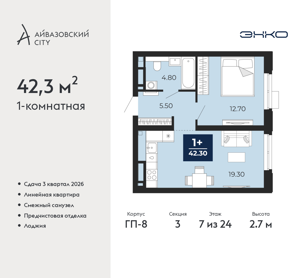 Продается 1-комн. квартира с предчистовой отделкой в ЖК "Айвазовский City" на 7 этаже. Общая площадь: 42.3 кв.м., жилая: 13.4 кв.м., площадь просторной кухни-столовой: 17.1 кв.м. Все окна выходят на одну сторону. В квартире одна лоджия, один совмещенный санузел. Высота потолков 2.7 м. Дом монолитный, многоподъездный, переменной этажности, от 14 до 24 этажей. Квартира находится в 3-й секции высотой 24 этажа в корпусе ГП-8. На этаже 7 квартир. В подъезде 1 пассажирский и 1 грузовой лифт. Окончание строительства - 3 квартал 2026 года. Оформление сделки по договору долевого участия. Новый жилой район располагается в живописном месте на берегу Туры в центральной части города. Принципиально новое пространство для жизни в центре современного города для тех, чьи мечты сбываются, кто нацелен на постоянный рост, перемены к лучшему для себя и своих близких. Каждая деталь Айвазовский City вдохновляет и заряжает на новые свершения: авторская архитектура, сбалансированная продуманная инфраструктура, дизайнерские дворы со спортивными и детскими площадками, парковые зоны с фонтанами, водный канал, украшающий центральный прогулочный маршрут района и многое другое. В 2019 года проект стал лауреатом престижной премии Urban Awards 2019 в номинации «Лучший строящийся региональный жилой комплекс бизнес-класса». Главная особенность Айвазовский City - соседство разных архитектурных школ в рамках одного дома. Изысканная классика, выразительная эклектика и оригинальный модерн - жить в одном из таких домов настоящий повод для гордости. Айвазовский City это идеальное сочетание комфорта, технологий и развитой инфраструктуры. Вход в подъезд возможен с улицы и со двора. Отправляясь на работу или за покупками, жители могут выйти с внешней стороны дома, а для прогулки с ребенком – со стороны двора. Экологически чистые материалы и энергосберегающие технологии, качественное освещение общественных зон, видеонаблюдение по всей территории жилого района (в том числе в подъездах, лифтах и в подземном паркинге), закрытые дворы с доступом только для жителей Айвазовский City. Часть домов в Айвазовский City будут оснащены подземным паркингом. Востребованный в нашем климатическом поясе формат хранения автомобилей защитит собственность владельца в любое время года. Аккредитация в банках: ОАО «Альфа-Банк», ПАО «Газпромбанк», ПАО Банк «ВТБ», «Сбербанк России», АО "ДОМ.РФ" и других. (AQID02514845)